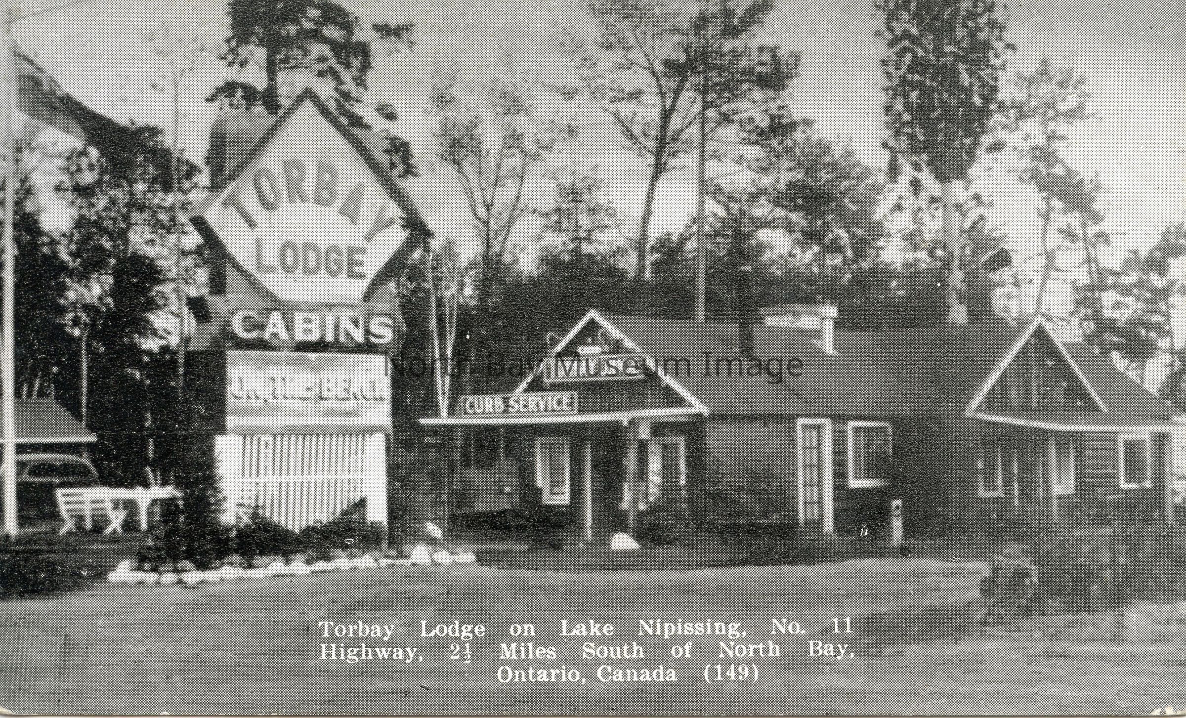 B&W photo of Torbay Lodge, 2 1/2 miles south of North Bay. Sign in left half of photo reads: "Torbay Lodge - Cabins - On the Beach". One-story log cabin building on right side of photo has sign over entry: "Curb Service". It was on about 2.5 acres of land and included the lodge and 24 cottages. Today, the complex is only one-half acre, with six cottages, two efficiency units and owners’ quarters (present-day address is 585 Banner Ave.)