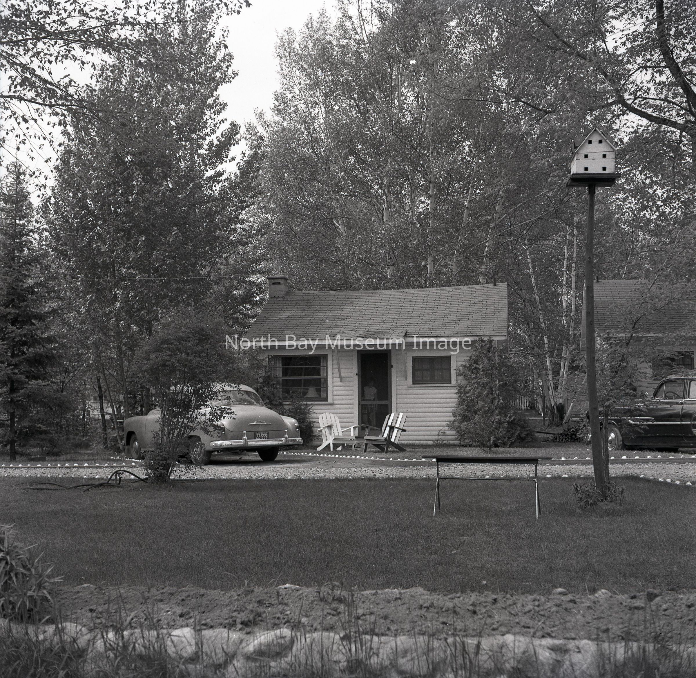 Envelope (a) contained the negative (b) of a Tourist Cabin at Kampinosity in Ferris. The negative shows a small cabin with a car parked in front of it. The cabin is surrounded by lots of trees. Original publications noted on the envelope. A part of the Forder Collection.Creator