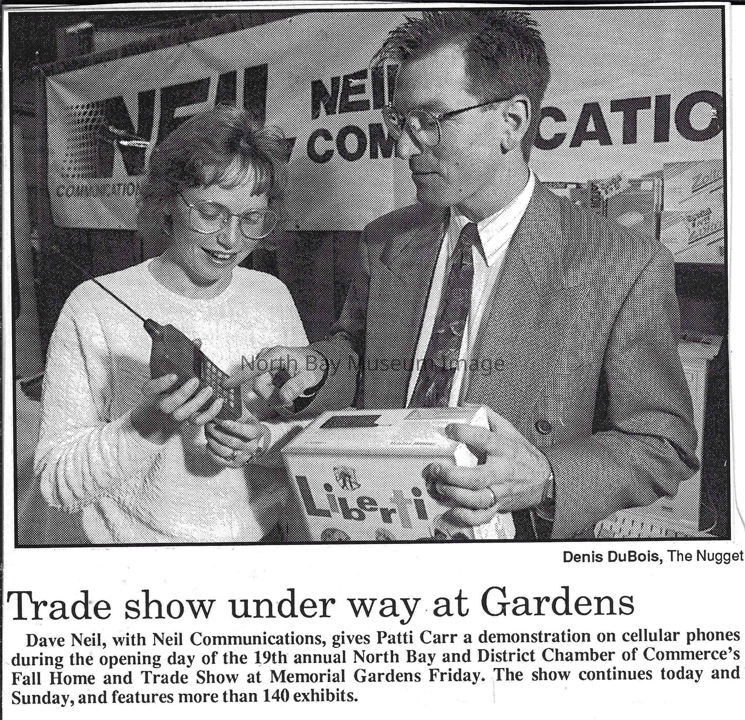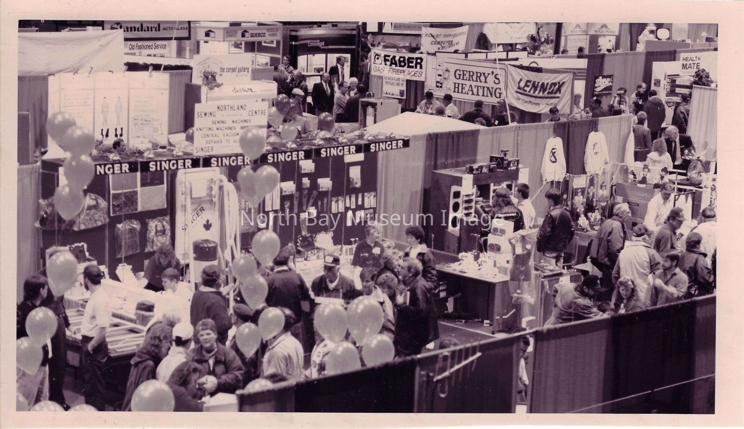 Photo and newspaper clipping of trade shows. Vendors include Gerry's Heating, Singer, Faber Gas Fireplaces, Lennox Air Conditionning and Neil Communications.