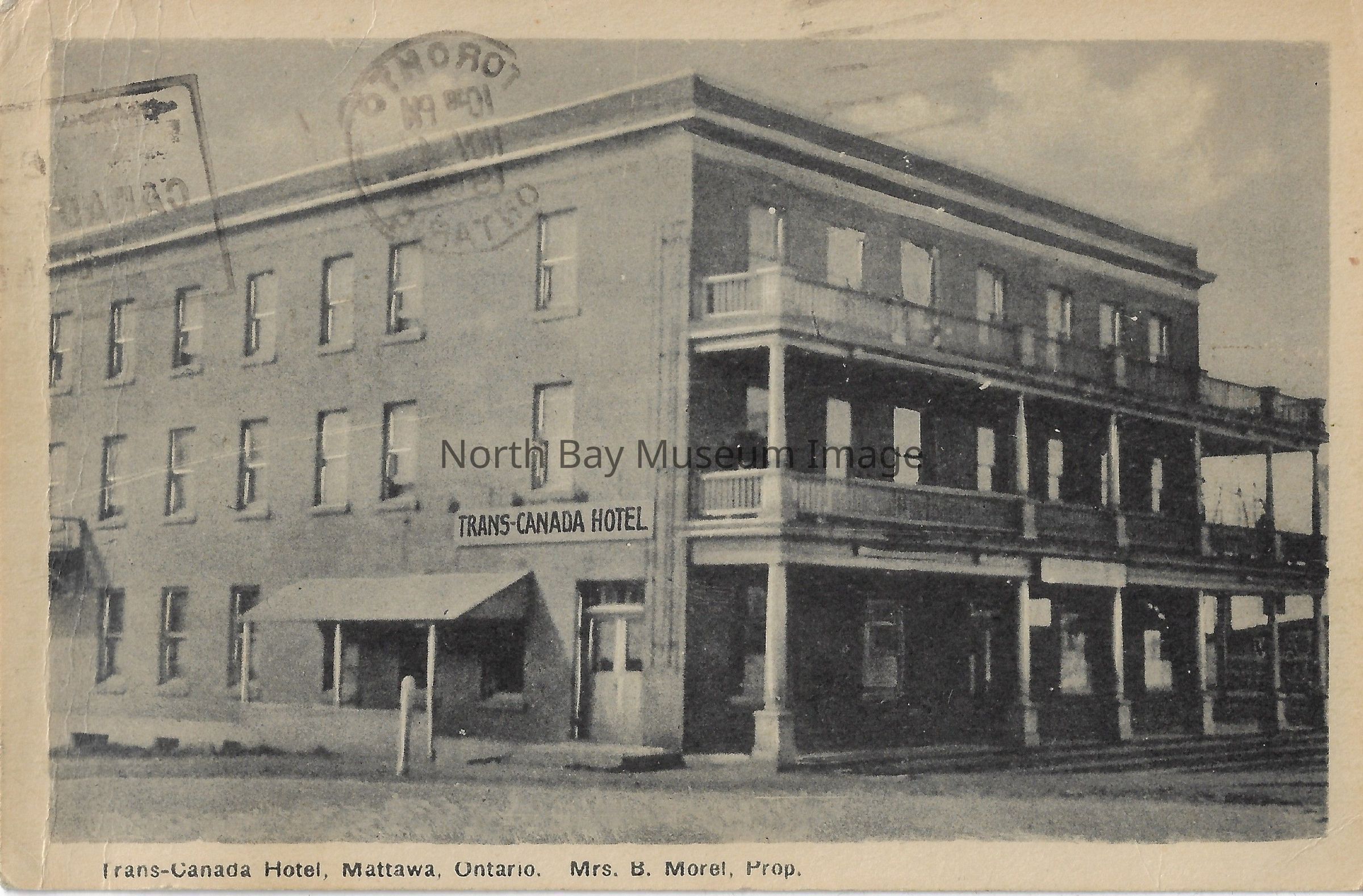This is a black and white postcard. The postcard shows the grand 3 storey Trans-Canada Hotel. The sign can be seen at the front of the hotel. There appears to be a dirt road in front of the hotel. The postcard Inscriptions: "Trans-Canada Hotel, Mattawa, Ontario. Mrs. B. Morel, Prop.", "Nov 5 - 1969 Hi Mom -9 had a good night Bowling Monday 298-248-166=712 not a very good last game Jim", "Mrs H.W. Cooper 171 Clifton St Peterborough Ontario", "1969".