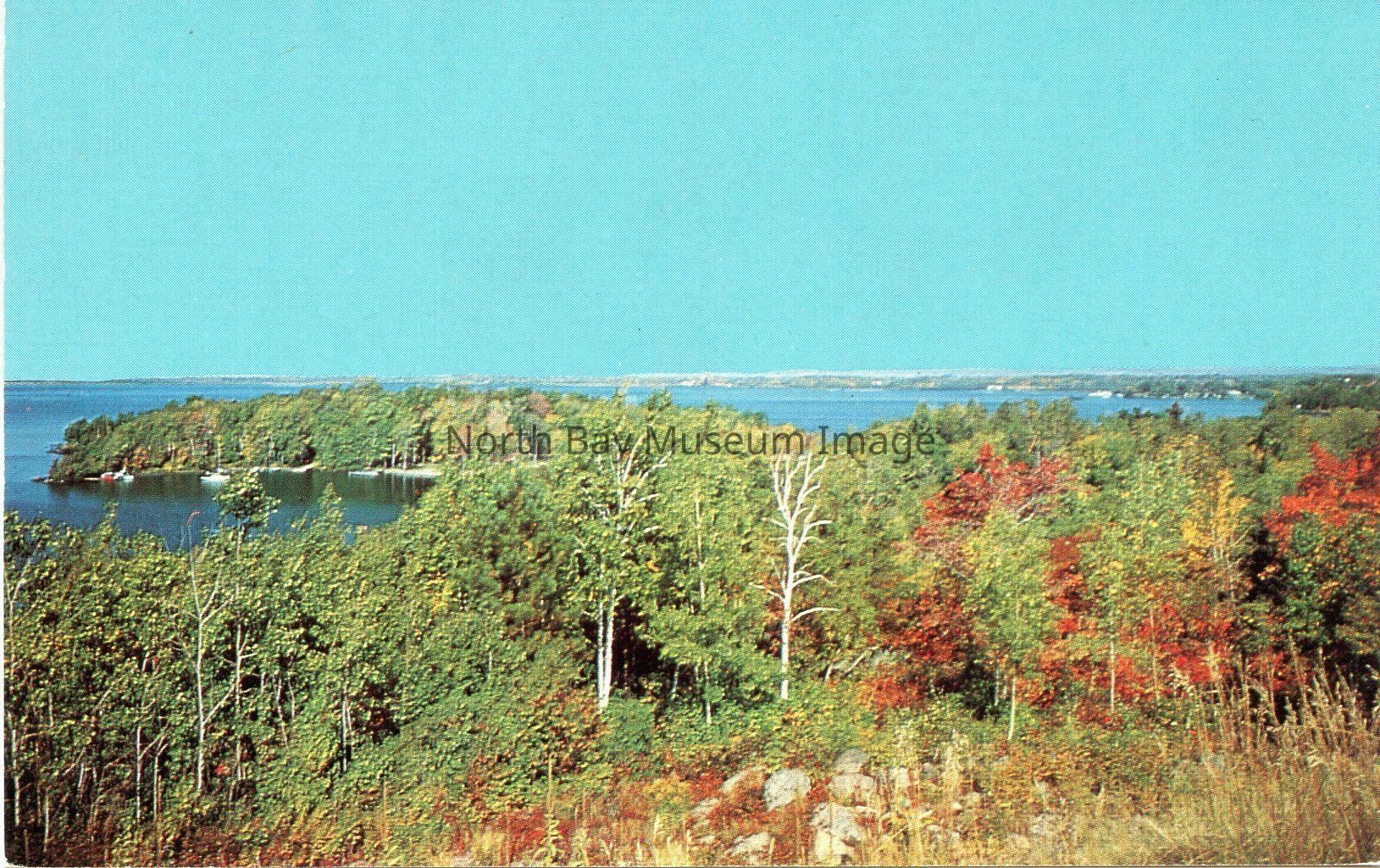 This is a coloured Post card. The photo on the front of the postcard is a view of Callander Bay on Lake Nipissing from the Lookout. There are lots of different types of trees in the foreground. In the background the lake can be seen.