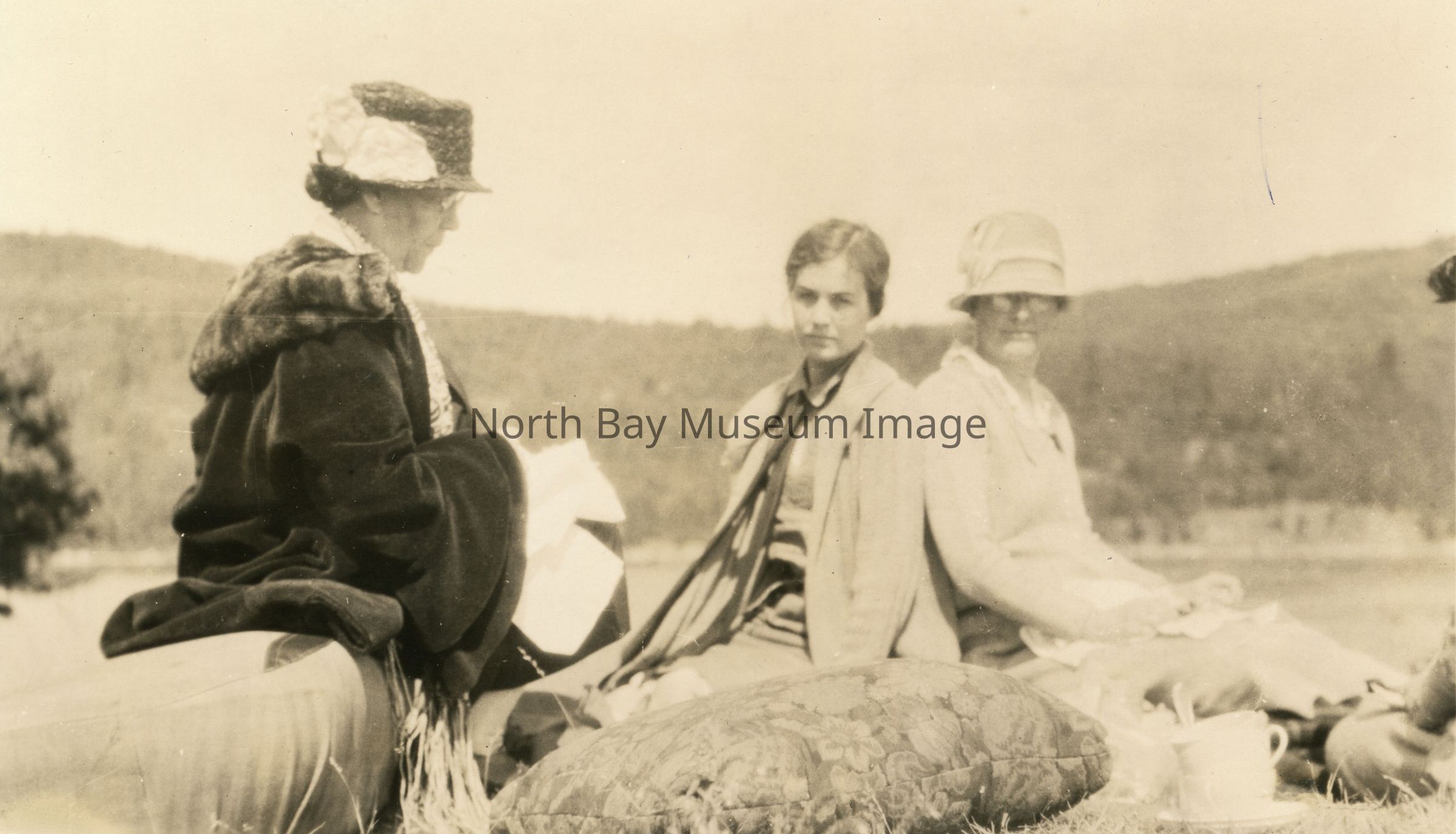 Black and white photograph that shows three women seated on the ground as if at a picnic with dishes and cushions in the foreground. Bella Booth seated on the left, photo is part of Gordon Collection.