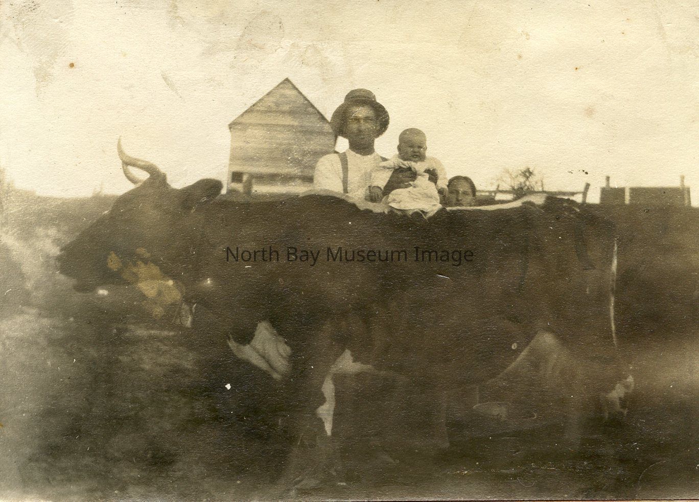 Trio with Cow - black and white photograph - shows a cow with a baby being held on its back by a man, the face of another child peeking over the cow's back - barn in the background, as well as a smaller building (a house?)