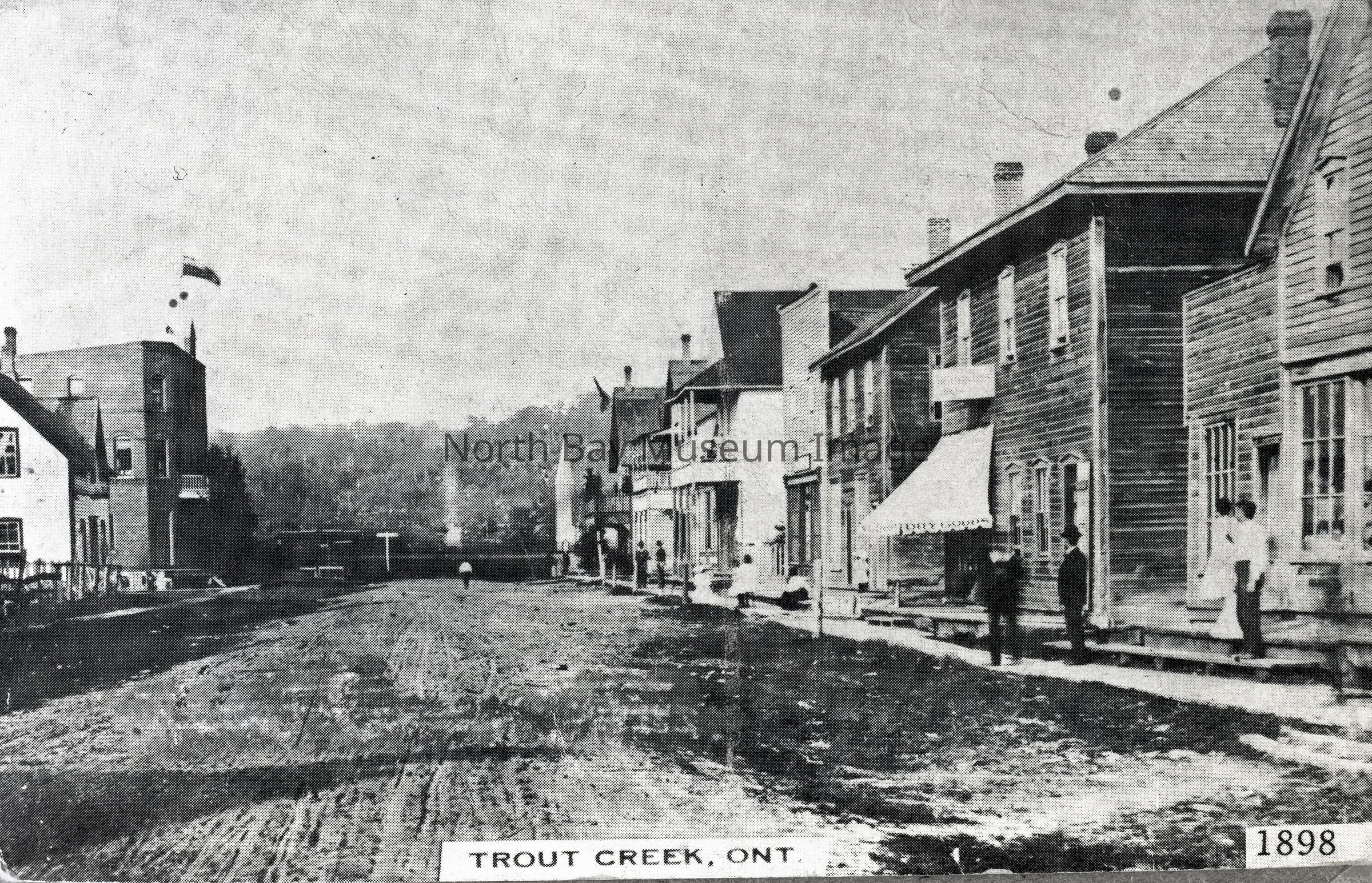 Oversized negative image of Trout Creek street image with date 1898. The street has various small buildings and shops on both sides. There appears to be people milling around. This photo may have been used by donor. This is a photo from William Forder collection that was made into print postcards.Creator