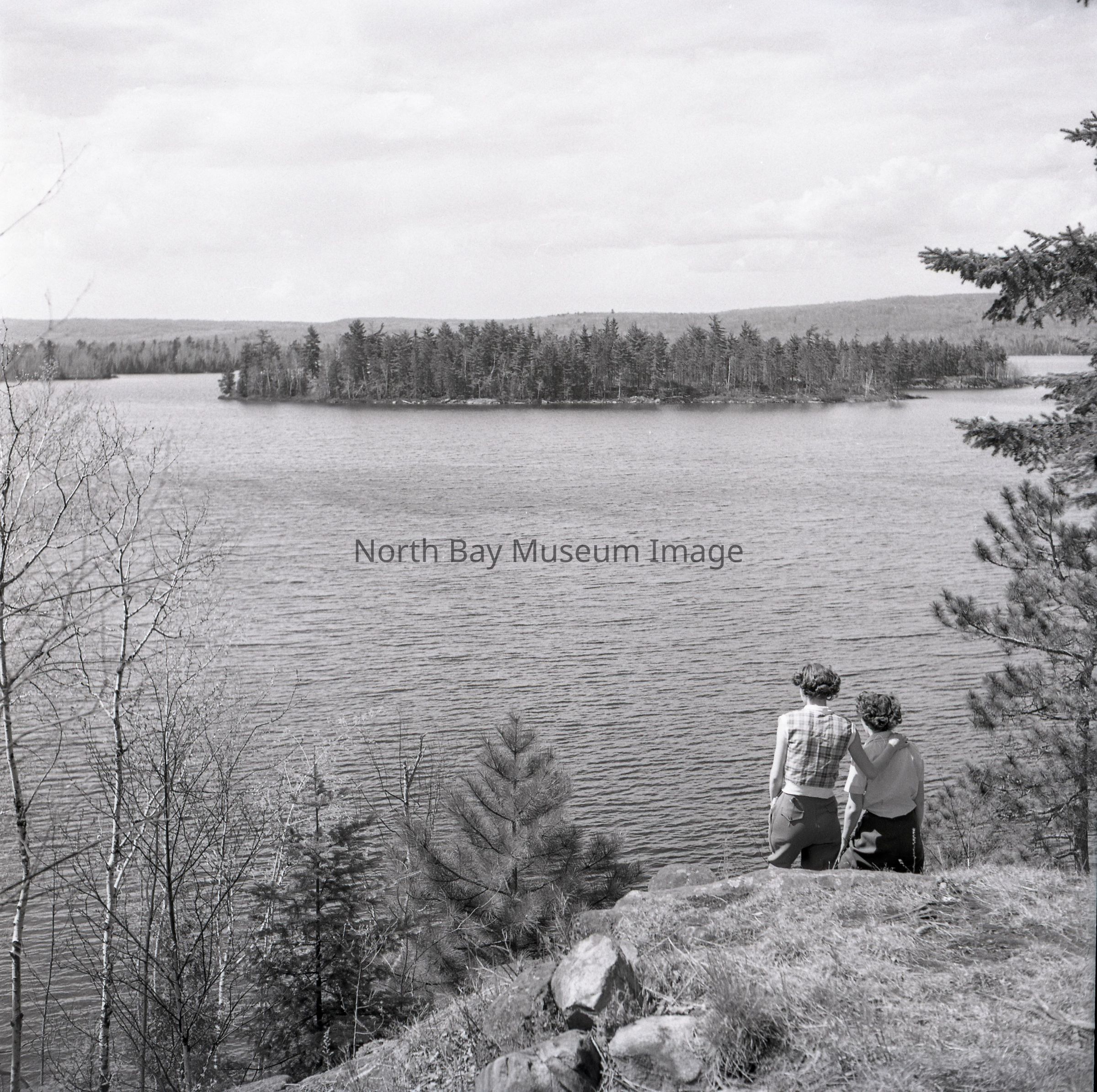 Photographer's Envelope (a) contained the photo and negative (b-c) of Trout Lake from Camp Ontario. The picture shows two adults looking out at the vast view of the lake. Original publications noted on the envelope. A part of the Forder Collection.Creator