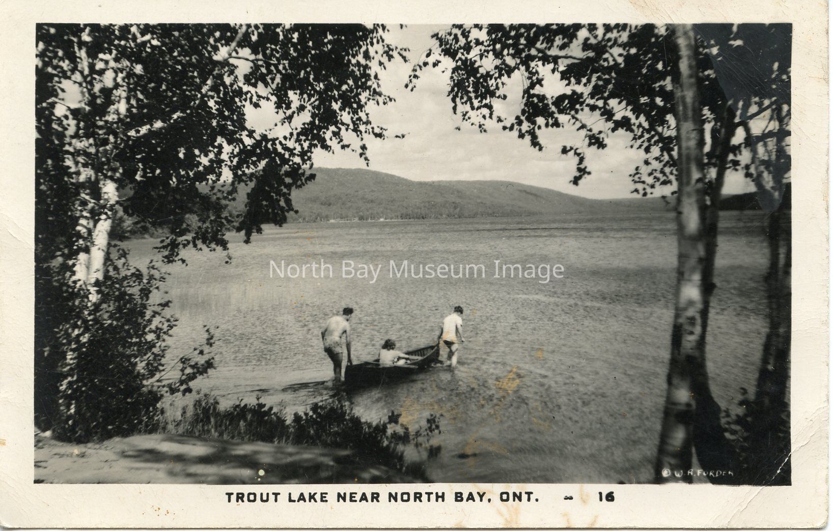 This is a black and white photo of Trout Lake near North Bay, Ont. In the postcard you can see the lake has a mountainous view across still water. There are two large trees & some shrubery that give way to three people starting out for a boat ride. The postcard is signed by artist R. Furder in the lower right corner. Across the bottom is printed in black text, "Trout Lake, Near North Bay, Ont. - 16"