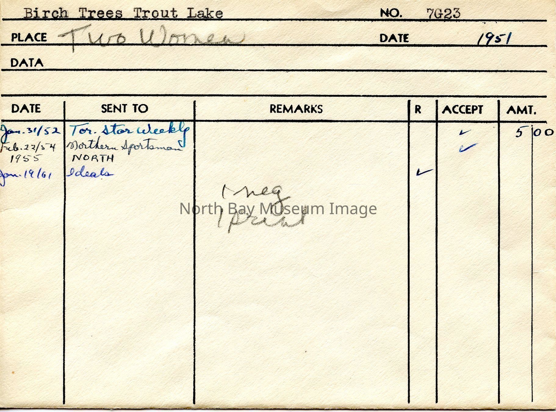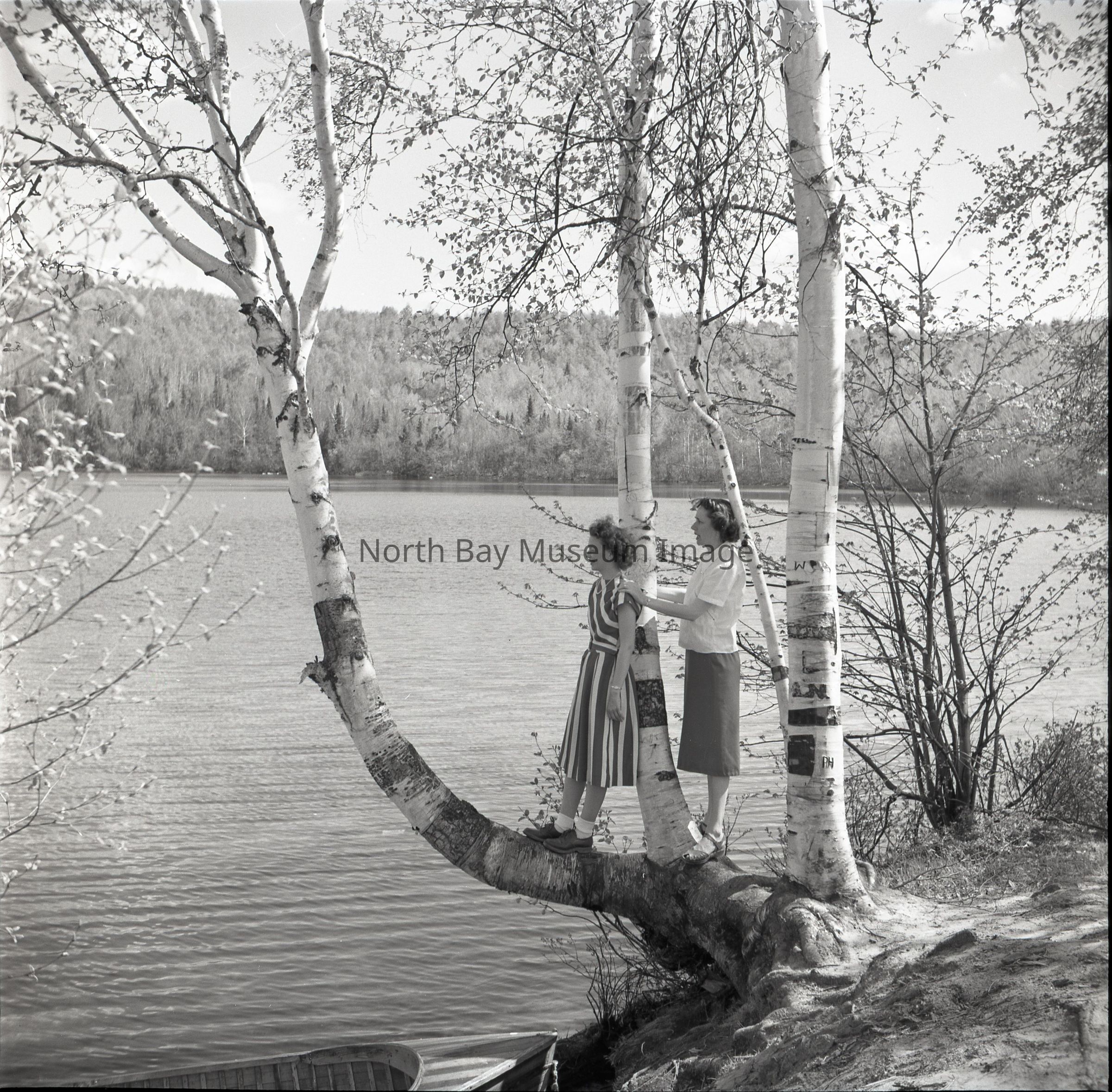 Photographer's Envelope (a) contains photographs and negatives (b-c) of two woman standing in and amongst trees at Trout Lake. The lake is visible in the background of the image of the women and trees. The photograph (b) on the back says that the photograph was taken on Trout Lake at McCoy's Publications of the photo are listed on the back of the envelope.This image is a part of the Forder Collection.Creator