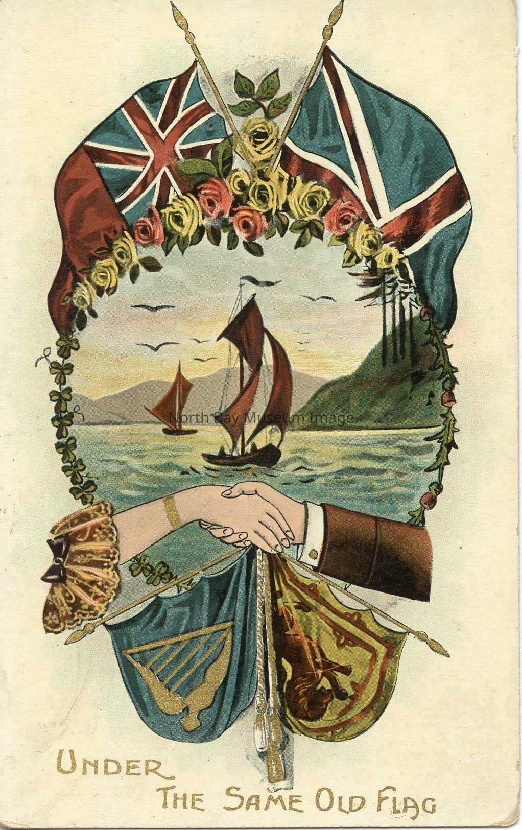 The Postcard is entitled "Under the same Old Flag." The postcard has a light beige background. In the middle there is a illustration of a body of water with two ships sailing in the background. Below the image is an illustration of a man and woman holding hands. Above and below the image of the water and boats is flags. The two at the top appear to be the Union Jack and possibly the flag that has the Canadian coat of arms. The flags below are green with a harp on it, and a yellow one. Text at the bottom of the postcard says: "Under the Same Old Flag" in gold text.