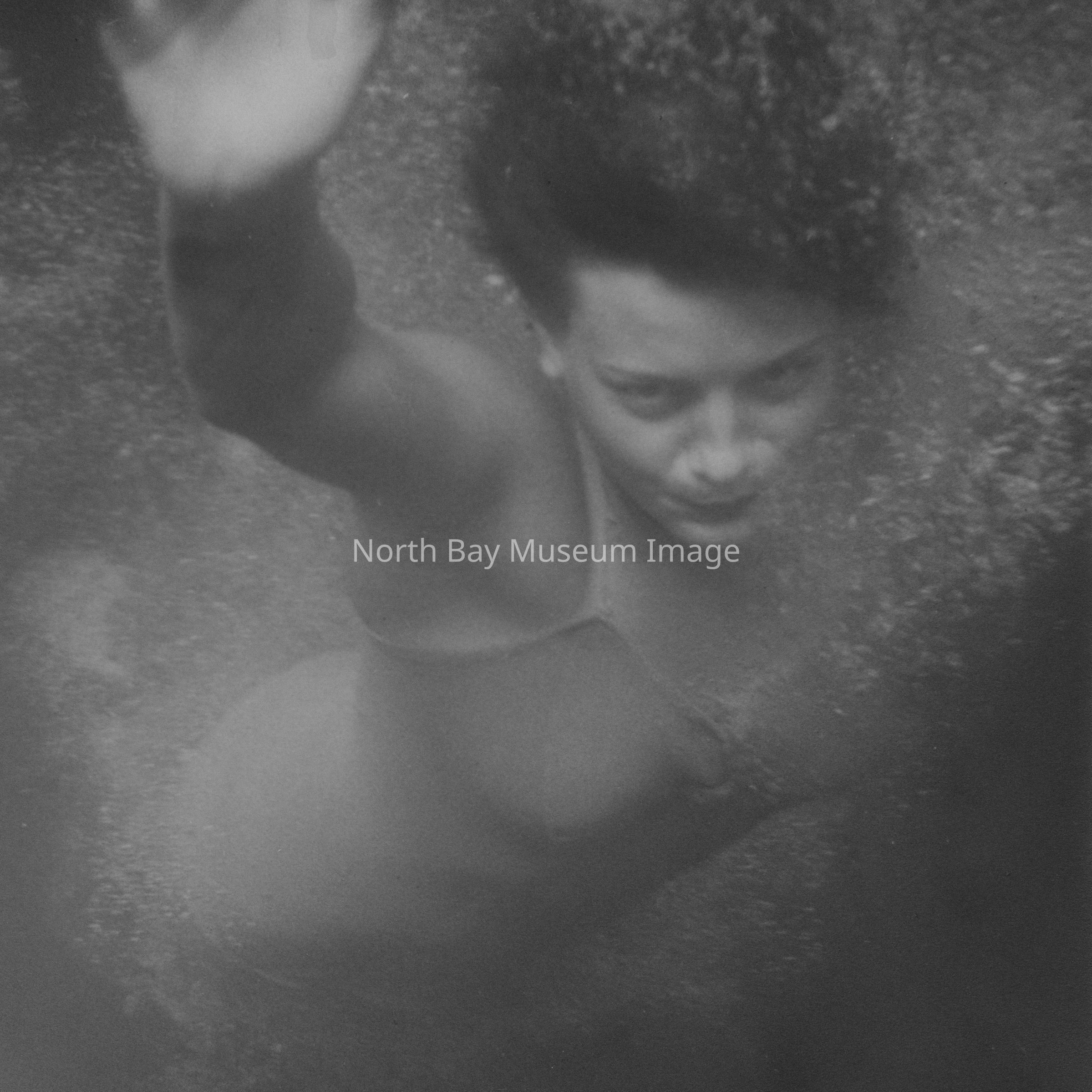 Print of black and white photograph taken underwater of a woman staring at the camera as she swims underwater. The photographer constructed a waterproof case for the camera with a remote trigger, and than lowered it into the water.