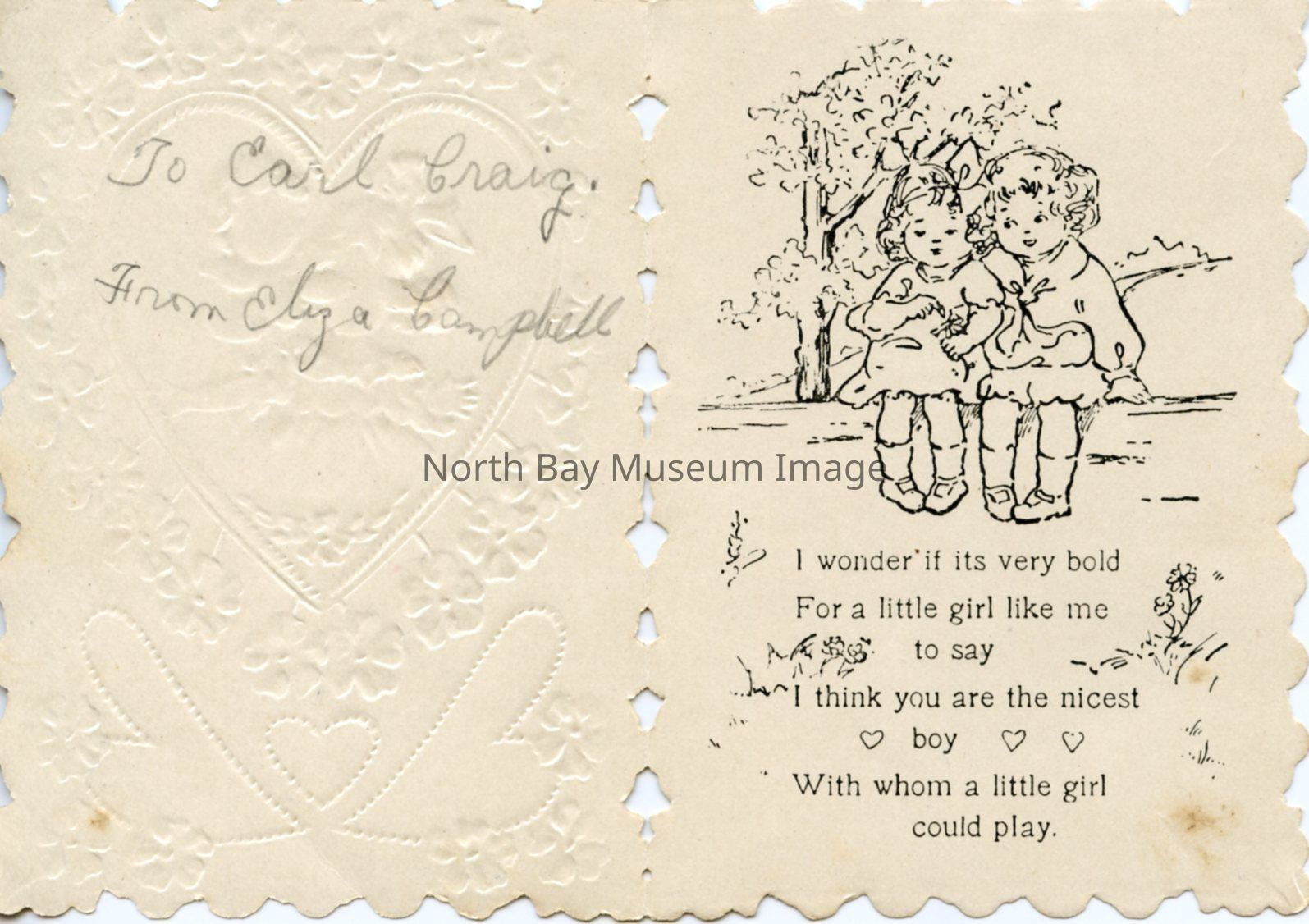 The inscription inside says; "I wonder if it's very bold for a little girl like me to say I think you are the nicest boy with whom a little girl could play." from Eliza Campbell, Whitney Made, Worcester, Mass. The card's inside has a drawing of a little girl and a little boy sitting together on a brick wall.