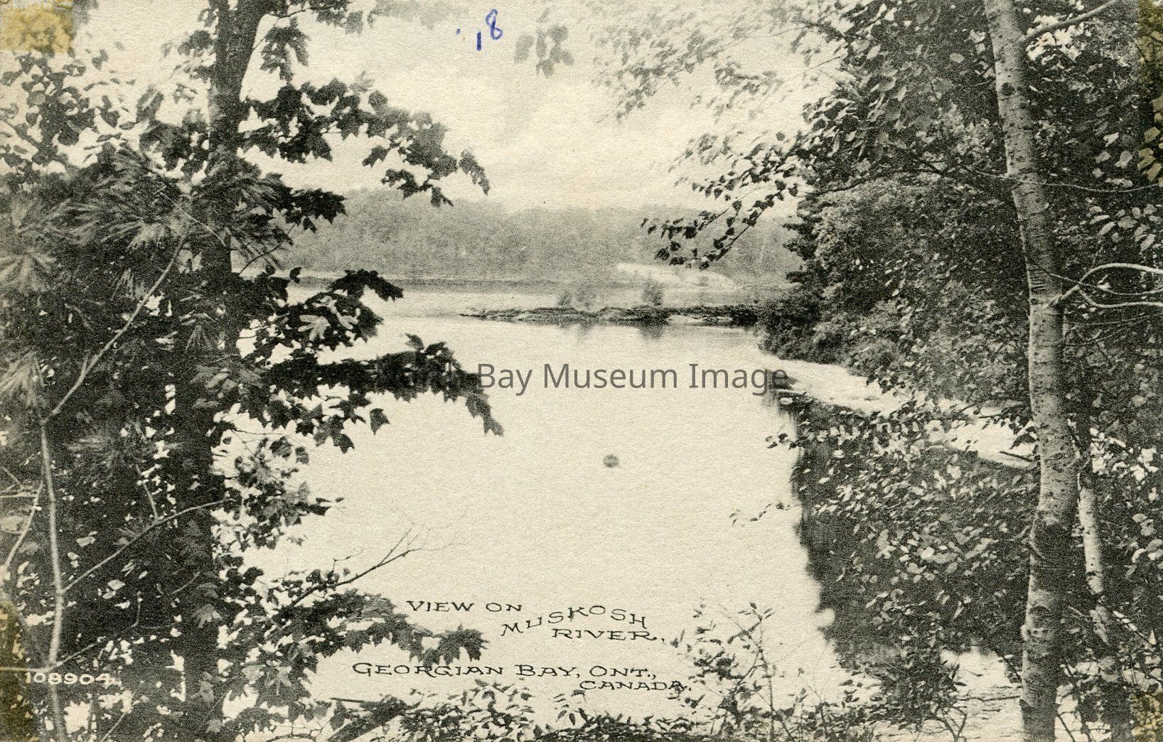 This is a black and white postcard. The front of the postcard has a landscape view of the Muskoka River, Georgian Bay, Ont. Canada. The image is taken from in between trees. The image is looking down at the Muskoka River body of water. In the lower left corner there are the #'s 108904.