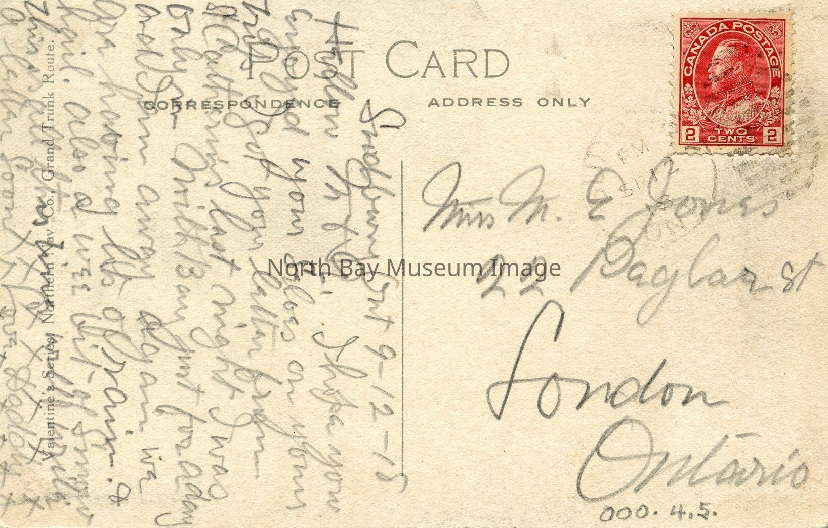 The postcard is from Sudbury, Ont. 9-12-18. The card was sent to Mrs. M.E. Jones, 22 Paylor St. London, Ont. A 2cent red postage stamp, cancelled by black lines through it.Creator
