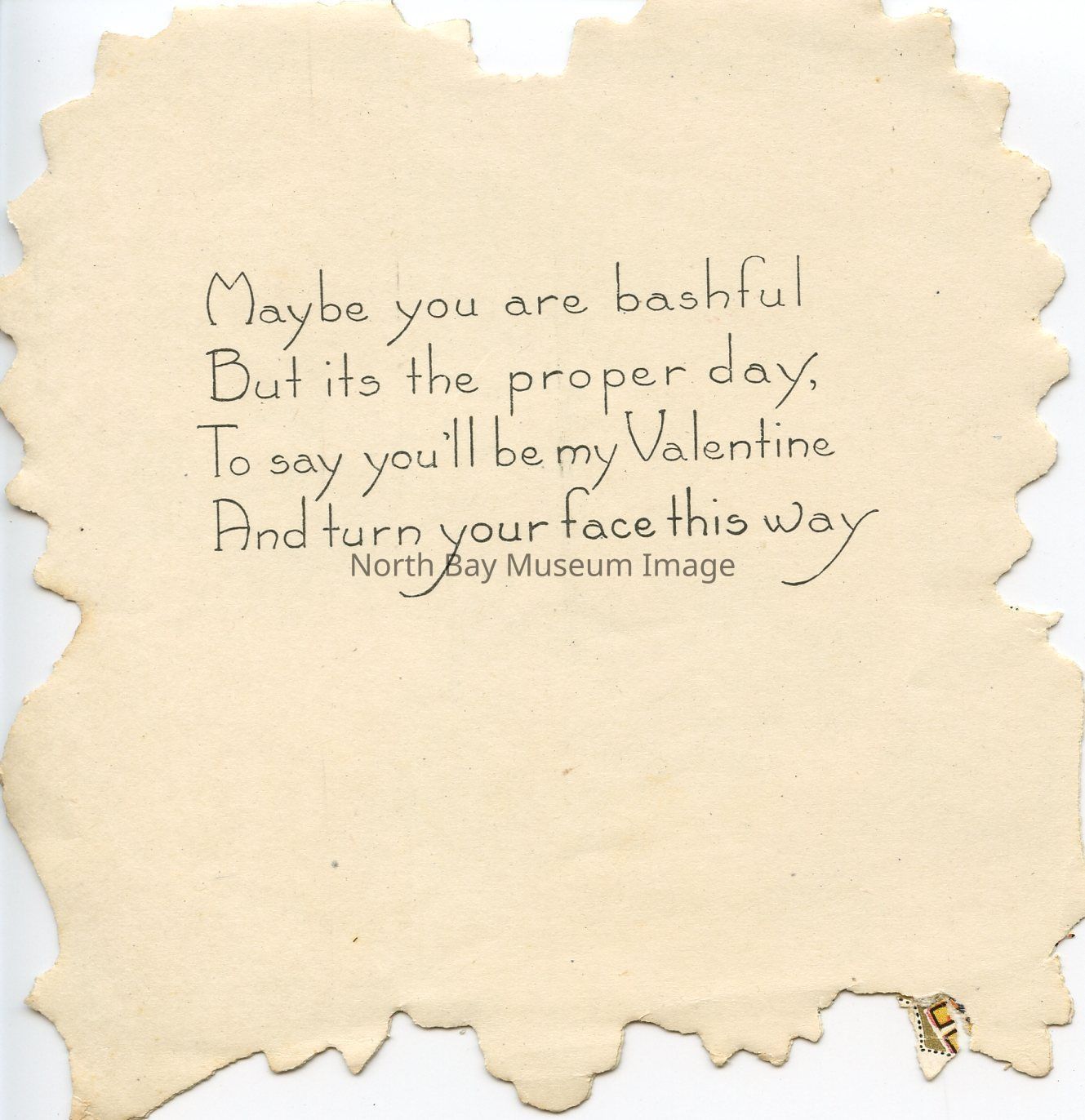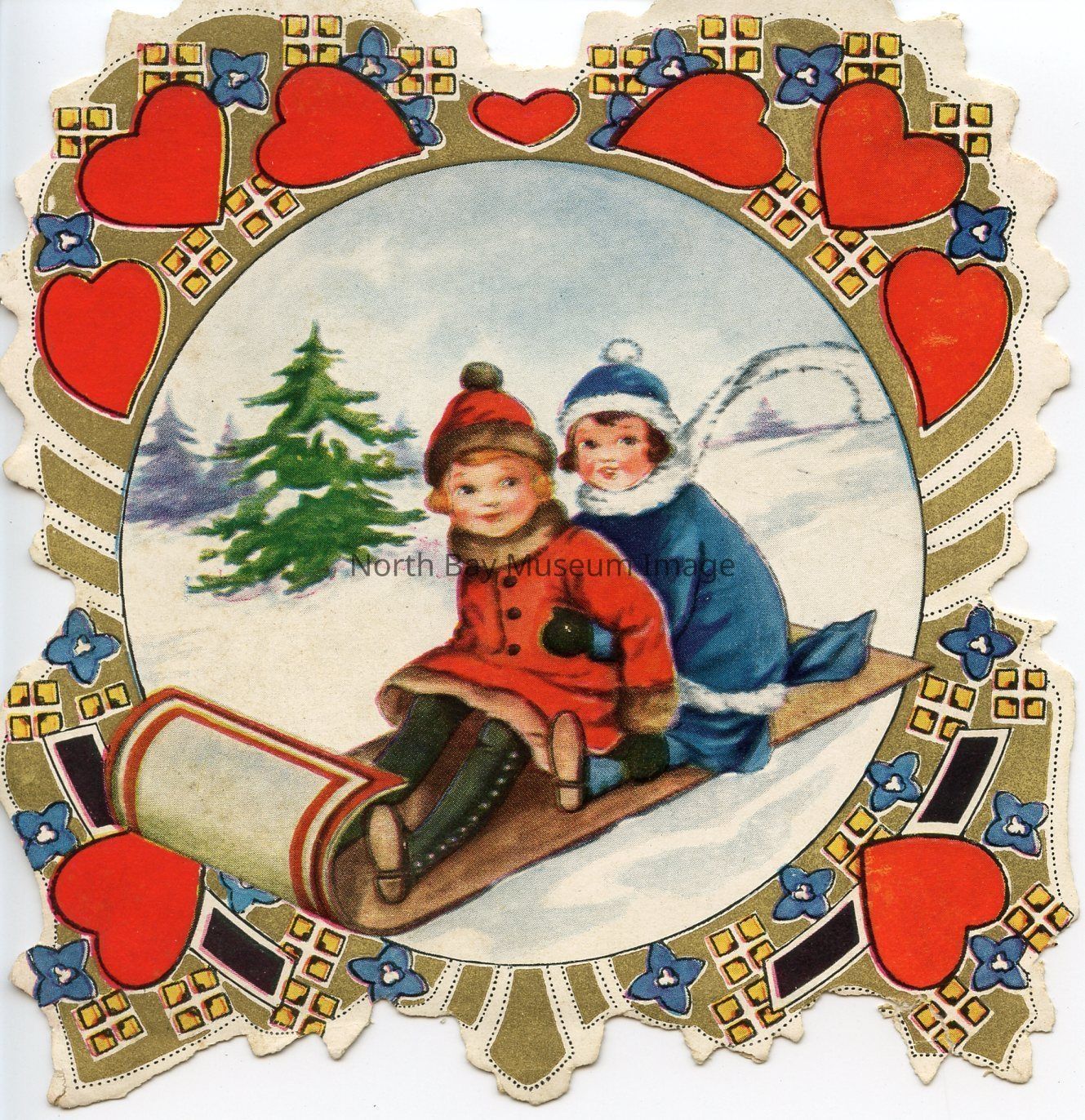 A beige Valentines day card, approx. 4.5 inch x 4.5 inch.The front of the card has a young boy and child on a sled. The children are dressed in winter clothing sledding in the snow. The card also has a mosaic type boarder of hearts. The inscription inside "maybe you are bashful but it's the proper day to say you'll be my valentine and turn your face this way." This card is Whitney Made, Worcester, Mass. Made in U.S.A.