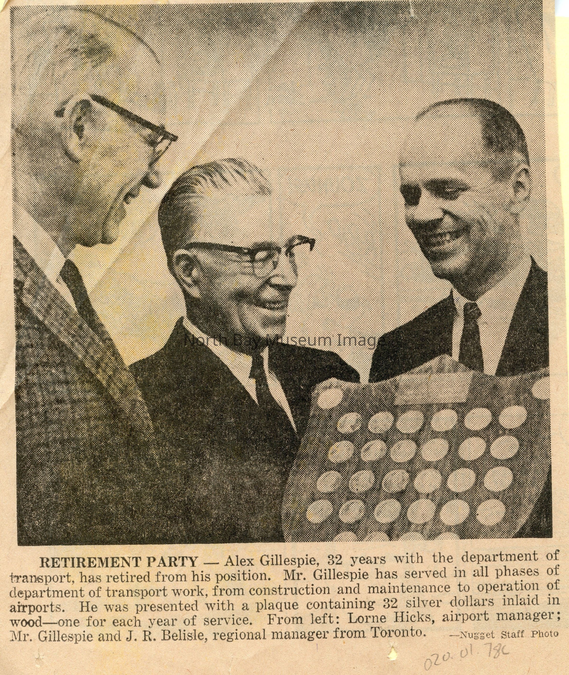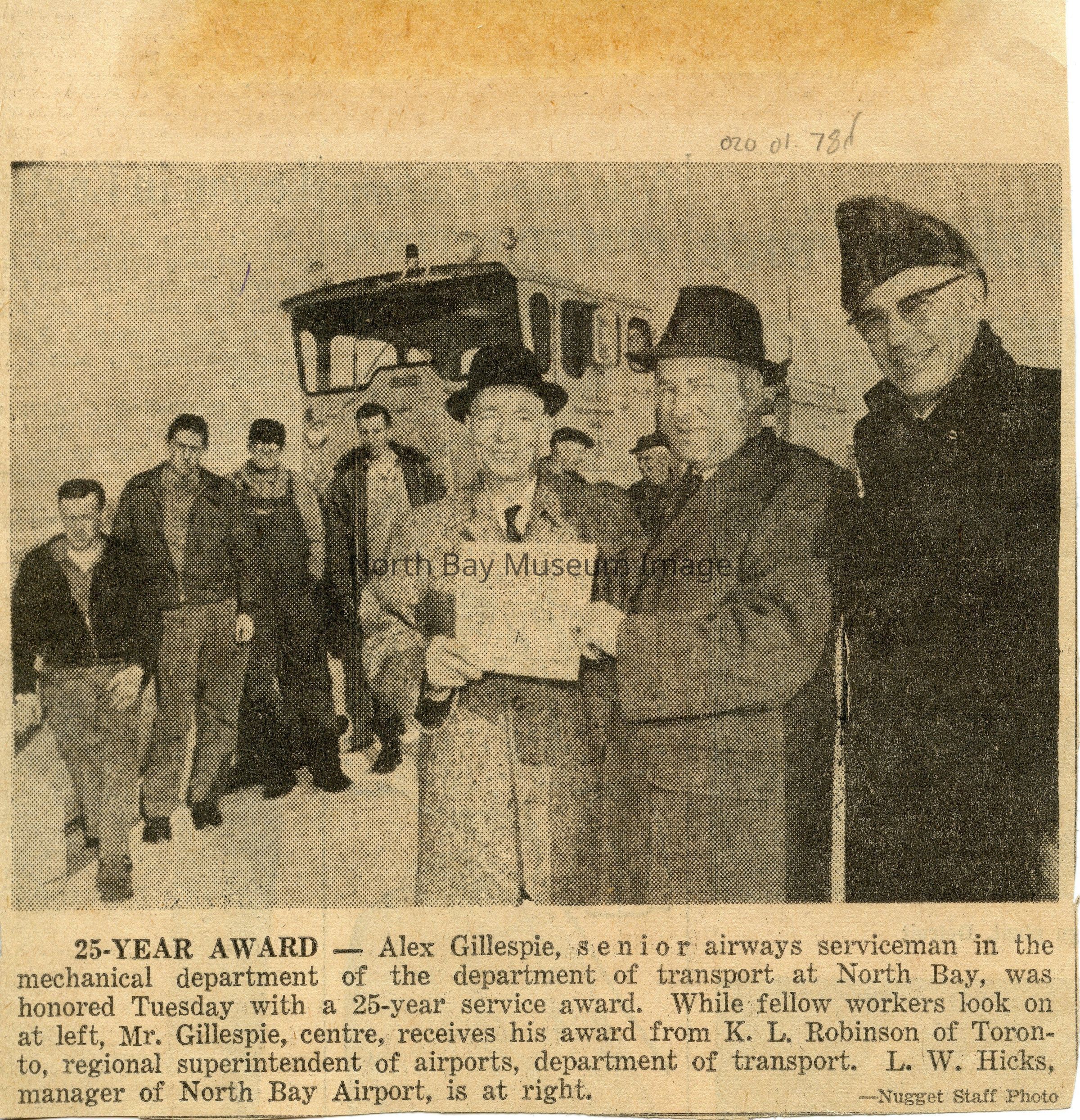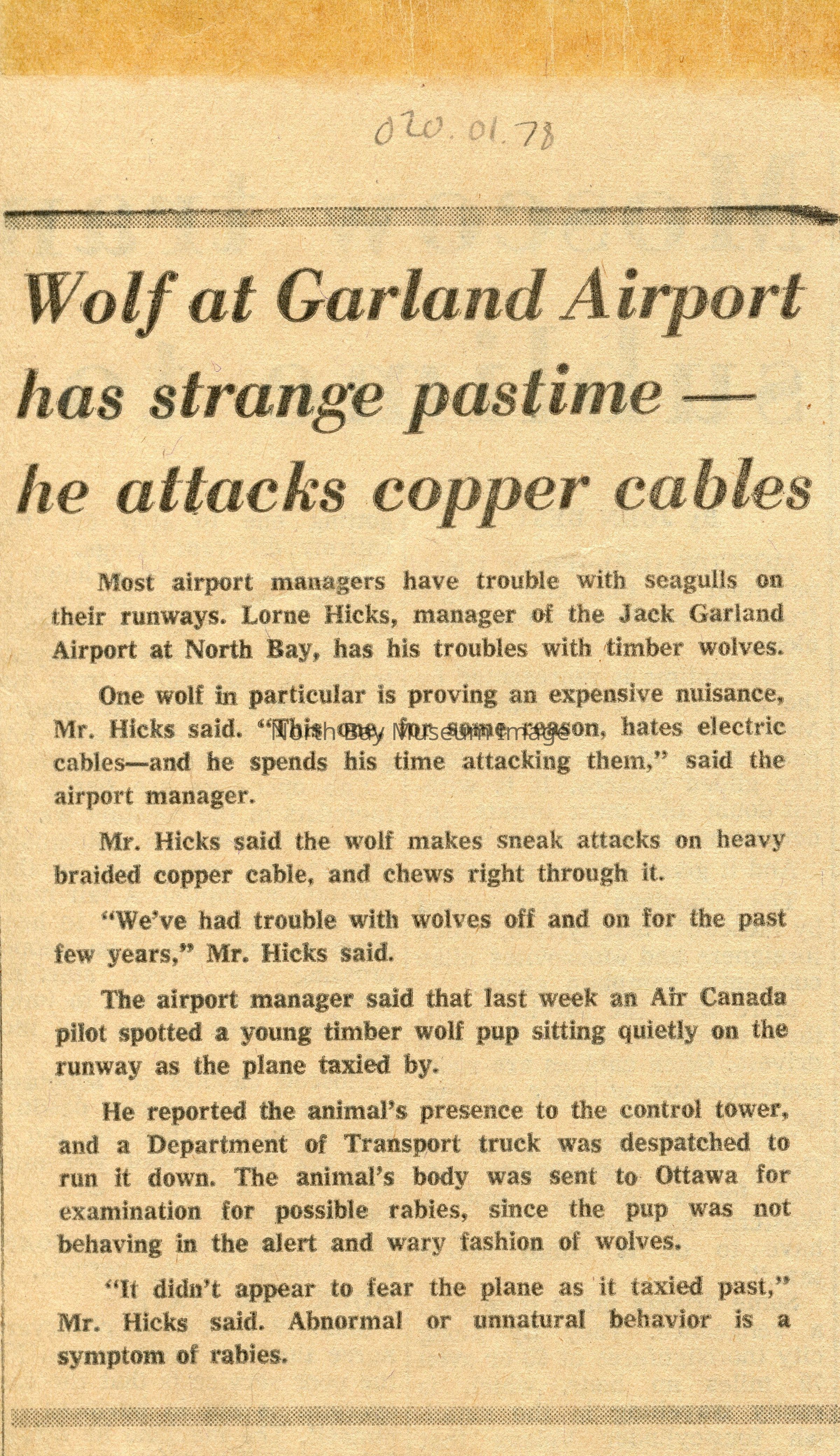 North Bay nugget clippings about wolf at Jack Garland Airport, events, many connected to donor Lorne Hicks.