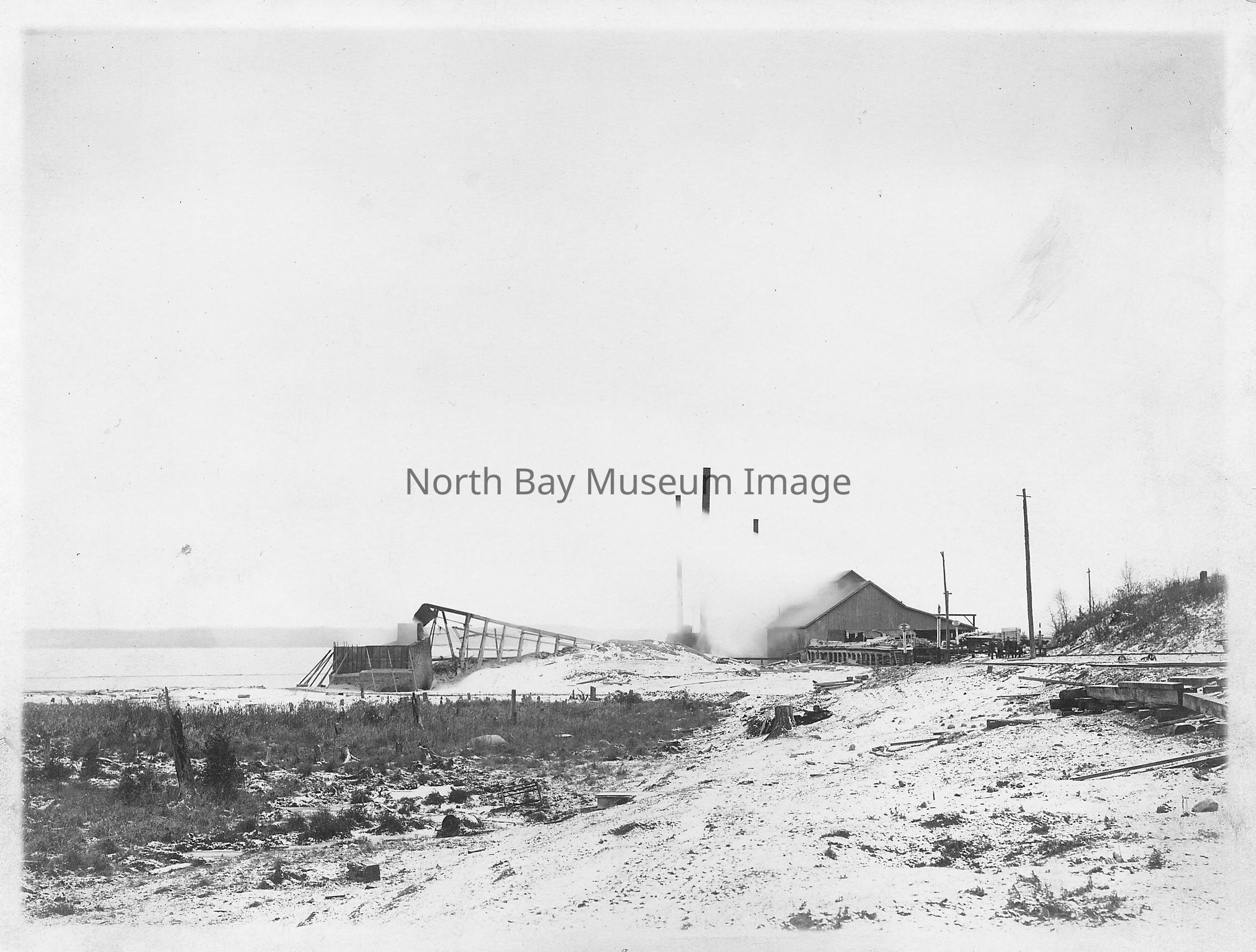 Black and white photographic print of John B. Smith & Sons Ltd. mill in Callander View of sawmill with small white border framing image