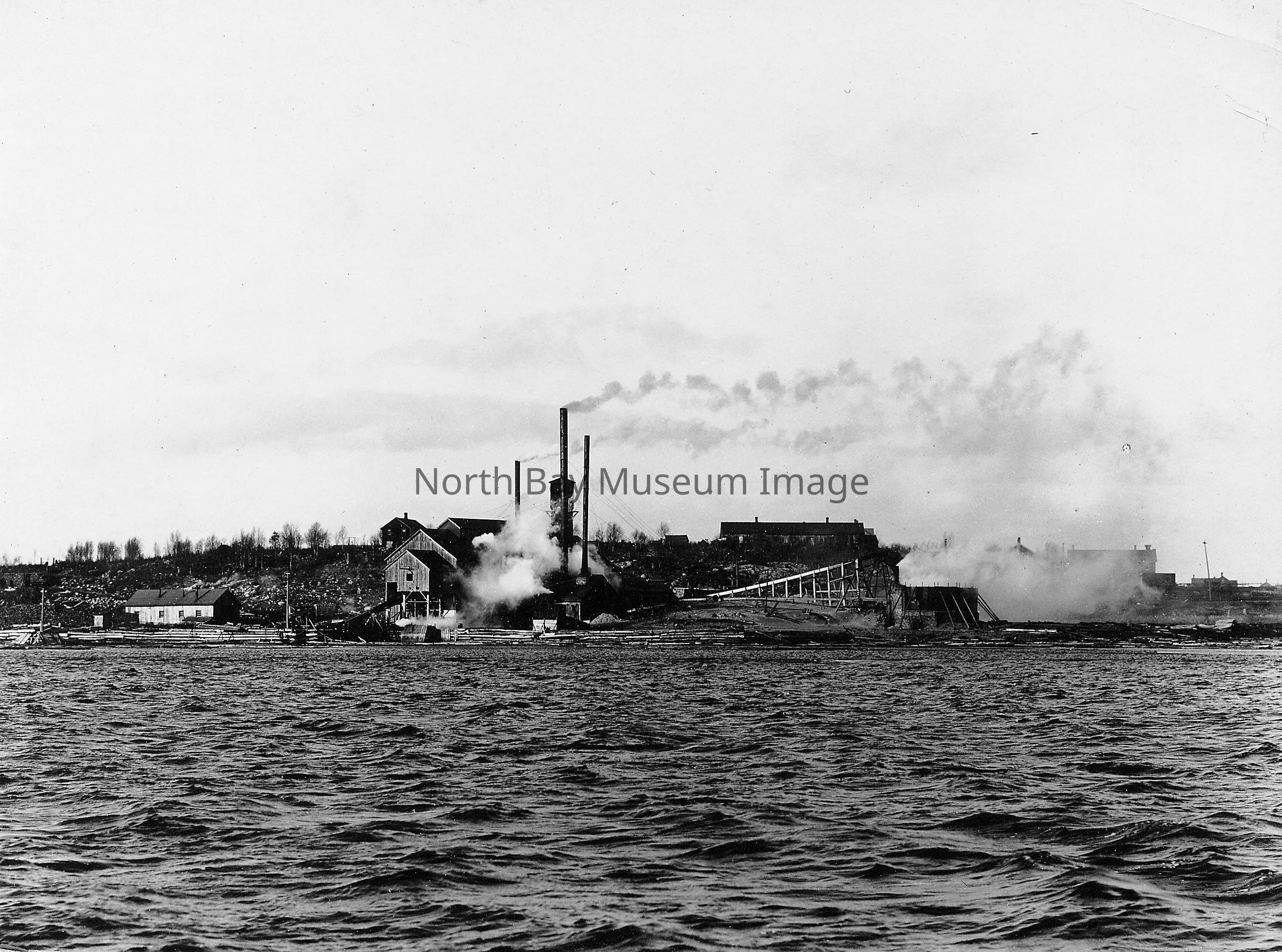 Black and white photographic print of John B. Smith & Sons Ltd. Mill in Callander as viewed from Lake Nipissing