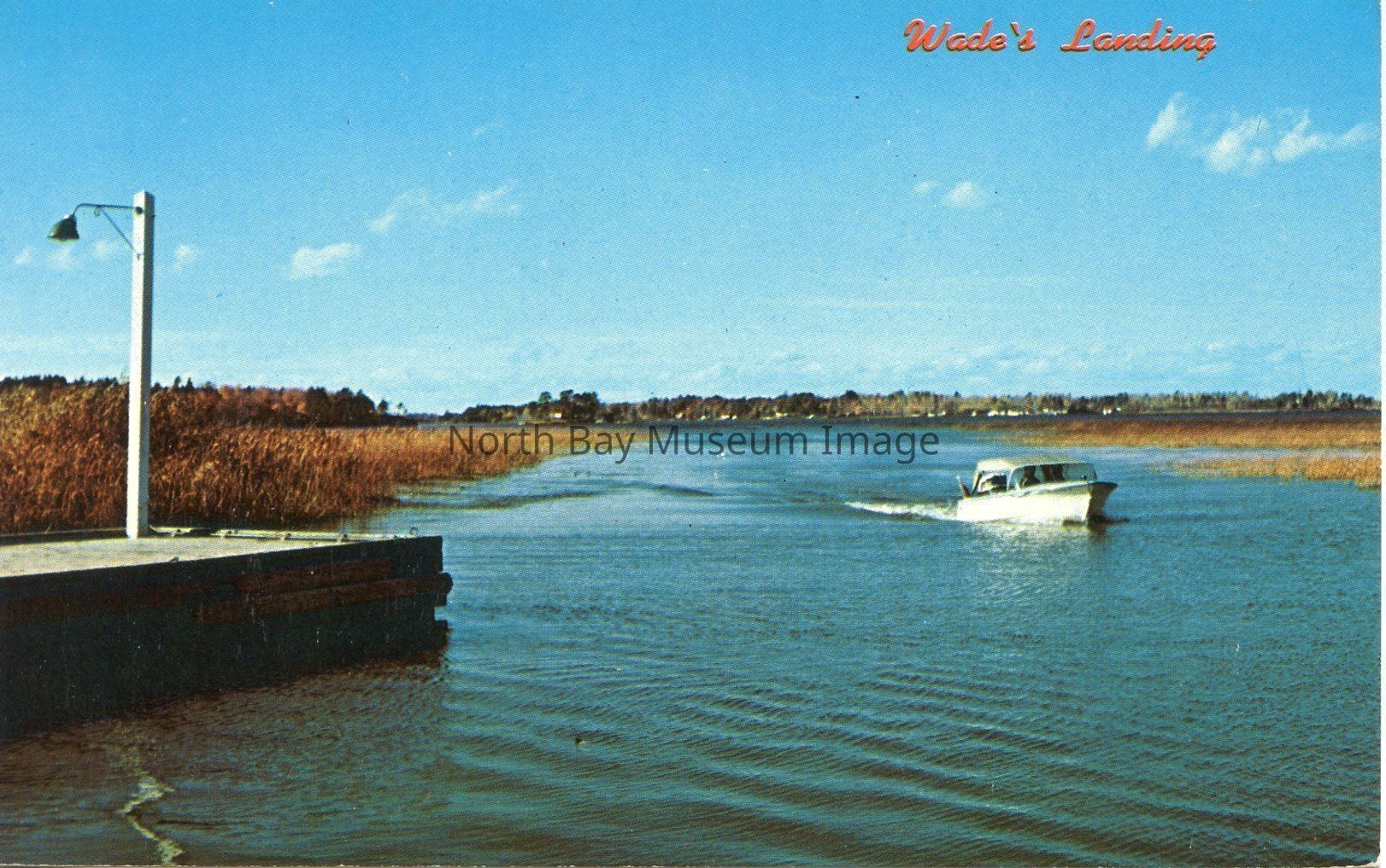 This is a coloured postcard of Wade's Landing, in Lake Nipissing South shore. in the image you can see a dock at the side of the postcard. As well as a boat in the lake. Wade's land is a old boat landing on South Bay near Nipissing Village, Ontario which was used by the lake's first steam boats and modern-day cottagers, hunters and fishermen.