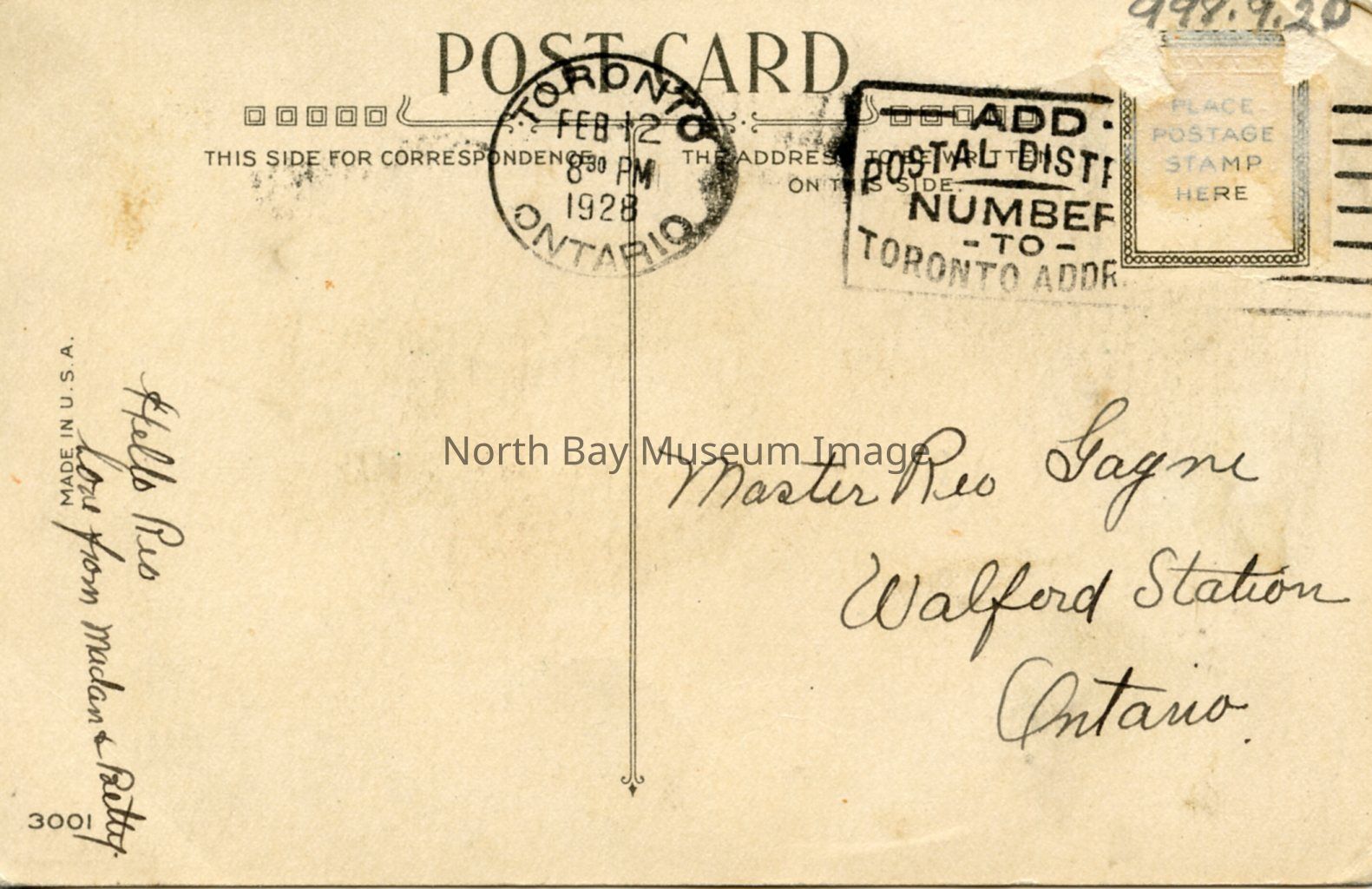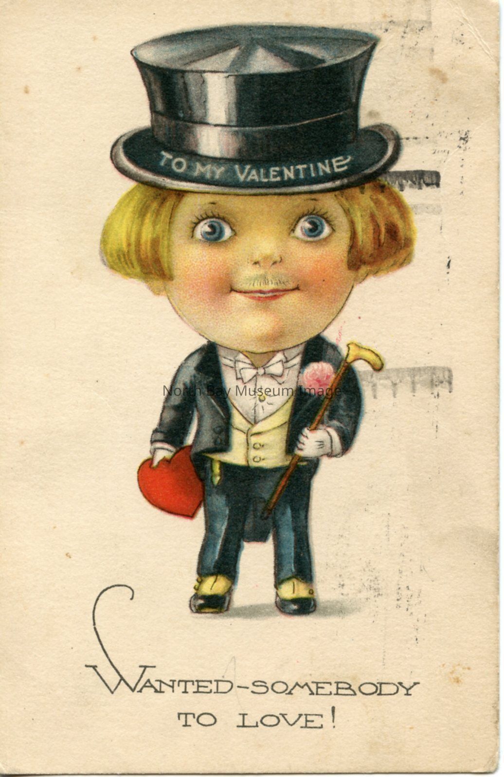 The Front of the card has a Young man with black top hat and blond hair. On rim of hat, the words "To My Valentine", are printed in white. His suit and pants are black with white tie & shirt and pale yellow vest. He is wearing Spatts with black shoes. He has a "pink" carnation in the left lapel and diamond stud button in shirt. He is also carrying a "walking stick" in the left hand and a "heart" in the right hand. On the bottom of the card printed in black, is the words "Wanted, somebody to love".