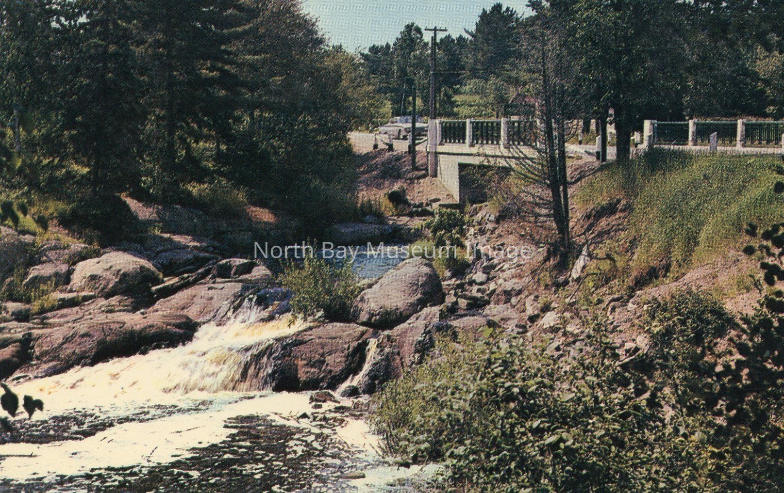 This is a coloured postcard of La Vase River, North Bay, Ontario. The postcard in the far right shows a bridge that goes over the La Vase River. You can see there is a car going over the bridge. The majority of the postcard shows the running water of the La Vase River. On the shoreline we can see the various types of trees.
