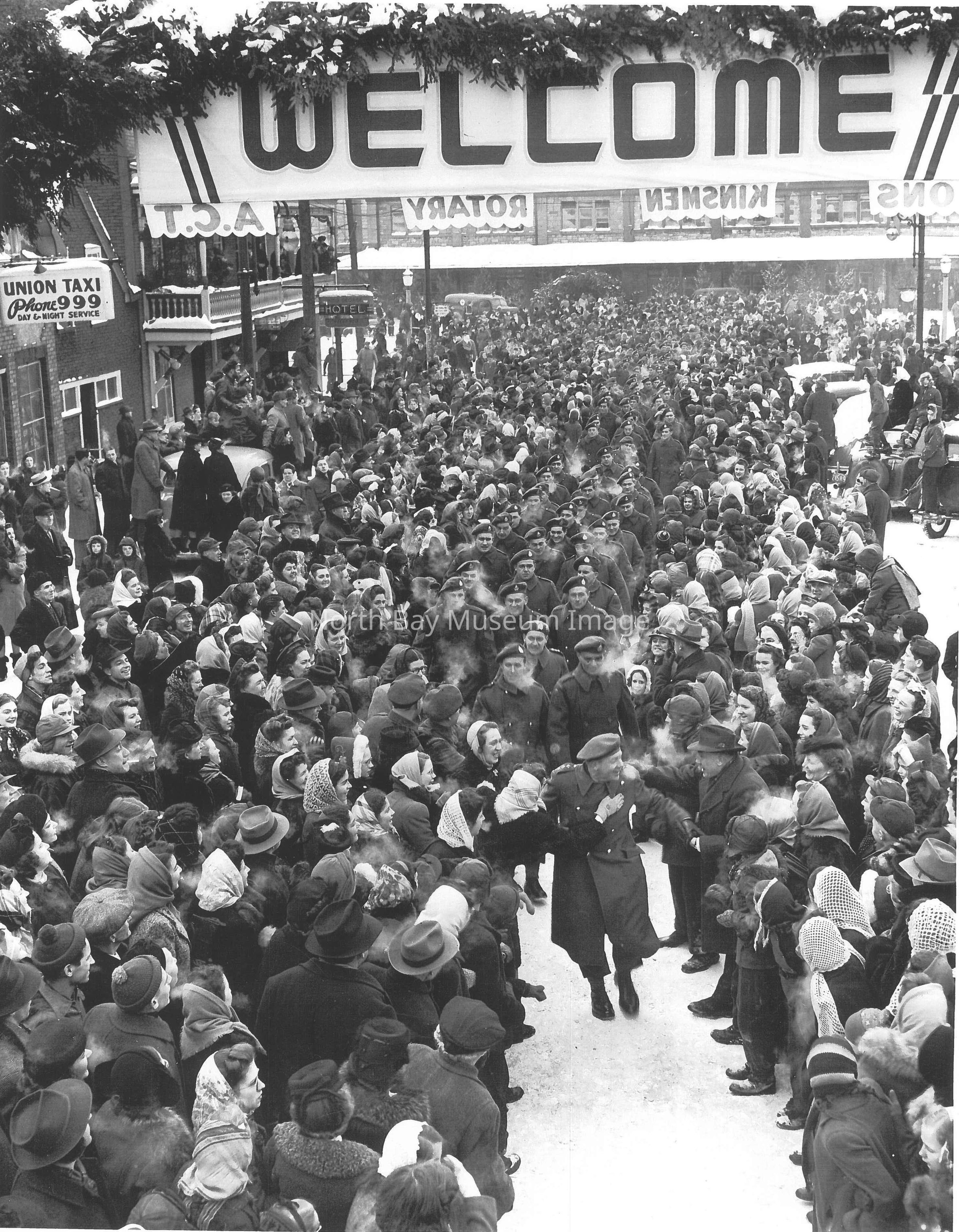 Welcome Home 2nd World War Photo taken on the streets of North Bay with the North Bay CPR station in the background. Algonquin Regiment soldiers marching through the middle of the crowds lining the streets.