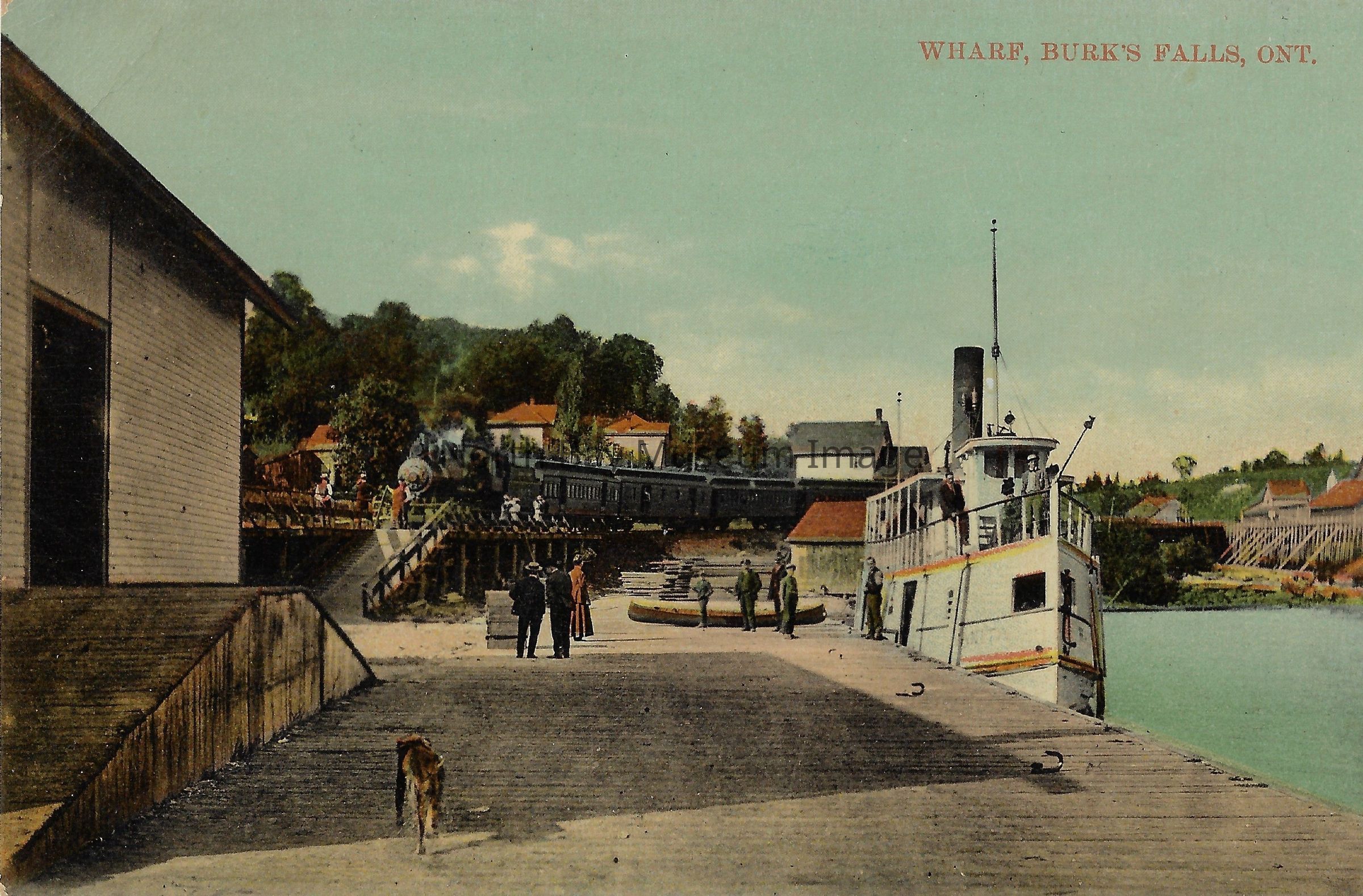 This is a coloured postcard. The postcard has an illustrated scene that shows a boat, train, various houses and such. The sky is blue with a few clouds in the sky.There is one prominent boat docked on the right hand side in the water. People can be seen walking about closer to the residential area. There is also a dog in the foreground near the docks. The inscription of the postcard reads "Wharf, Burk's Falls, Ontario".Creator