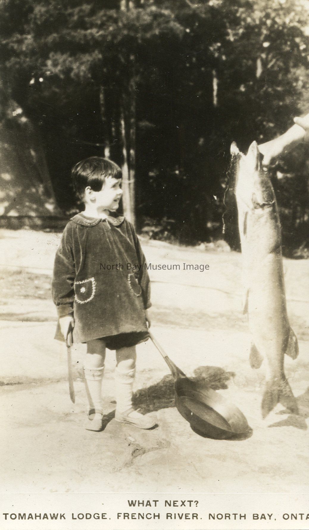 Caption under photo reads: What Next? Tomahawk Lodge, French River, North Bay, Ontario