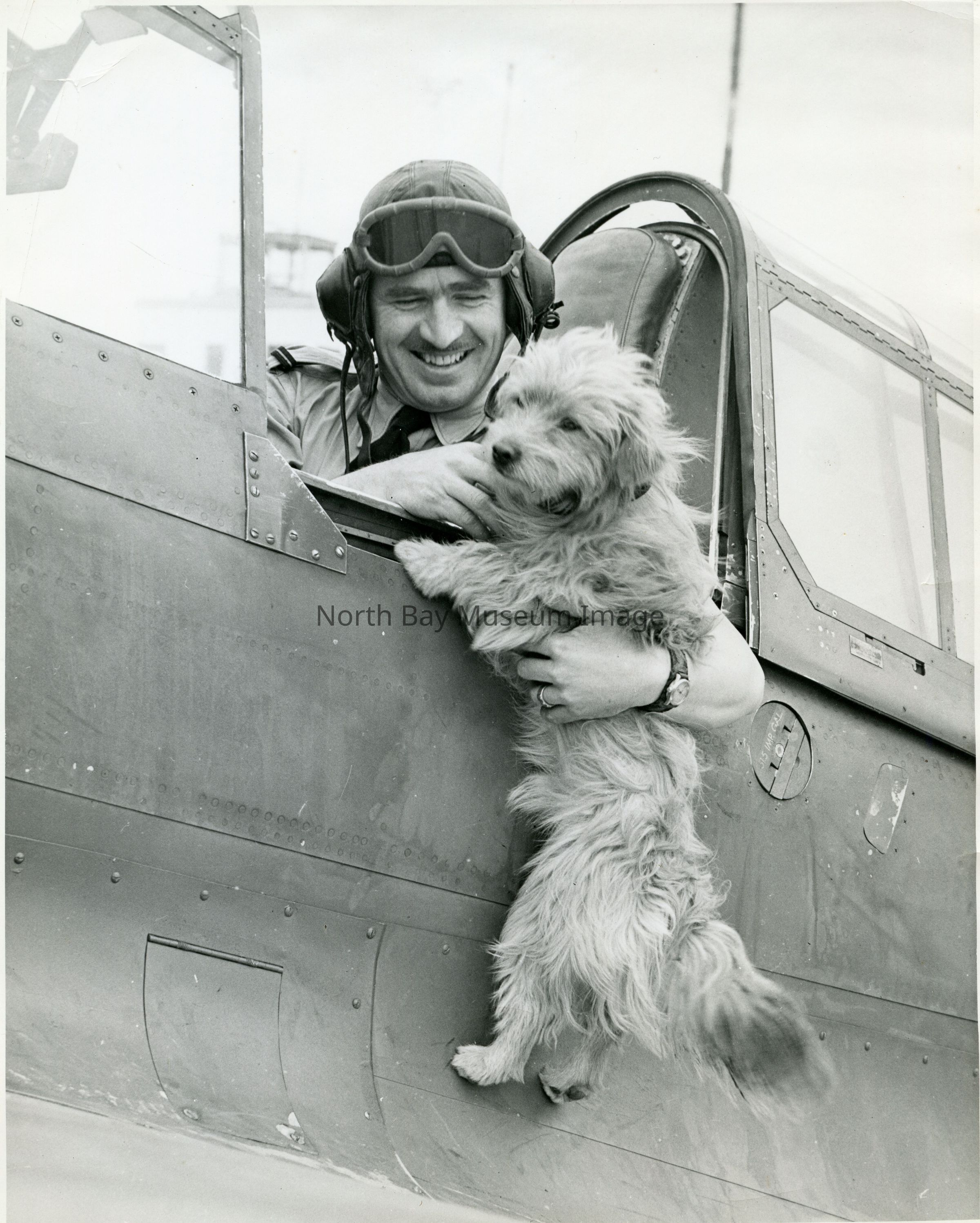 Photo of Whitey the dog being held up on side of Royal Canadian Air Force P-40 Kittyhawk Fighter Plane. This type of plane was not at the RAF flying school so must have been passing through North Bay when photo was taken North Bay Nugget and photographer Kevin W. Moore stamped on back of photo.A news article on Whitey the dog was run in the North Bay Nugget in 1952 as well. Whitey was first brought to the airport by manager L.W. Hicks when used as a training base during World War Two. After the war, Whitey "worked for" Trans Canada Airlines. With the return of the RCAF the Nugget ran a store on Whitey's "promotion" in 1952.Date(s) of Creation