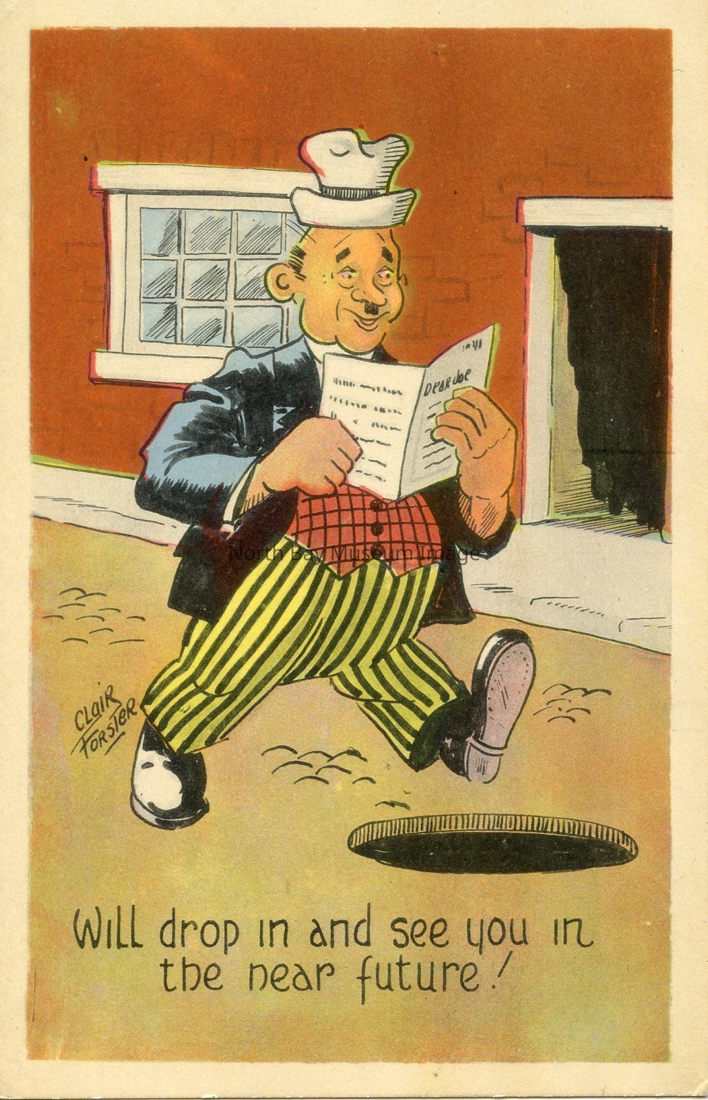 This is a coloured postcard of a man about to fall in a hole in the middle of the street. The man is a short man wearing yellow and black pin stripe pants, he has a red vest on and a black jacket. The man also has a mustache, he appears to be balding, and has a white hat on. The man appears to be reading a newspaper. The caption of the postcard says "will drop in to see you in the near future"