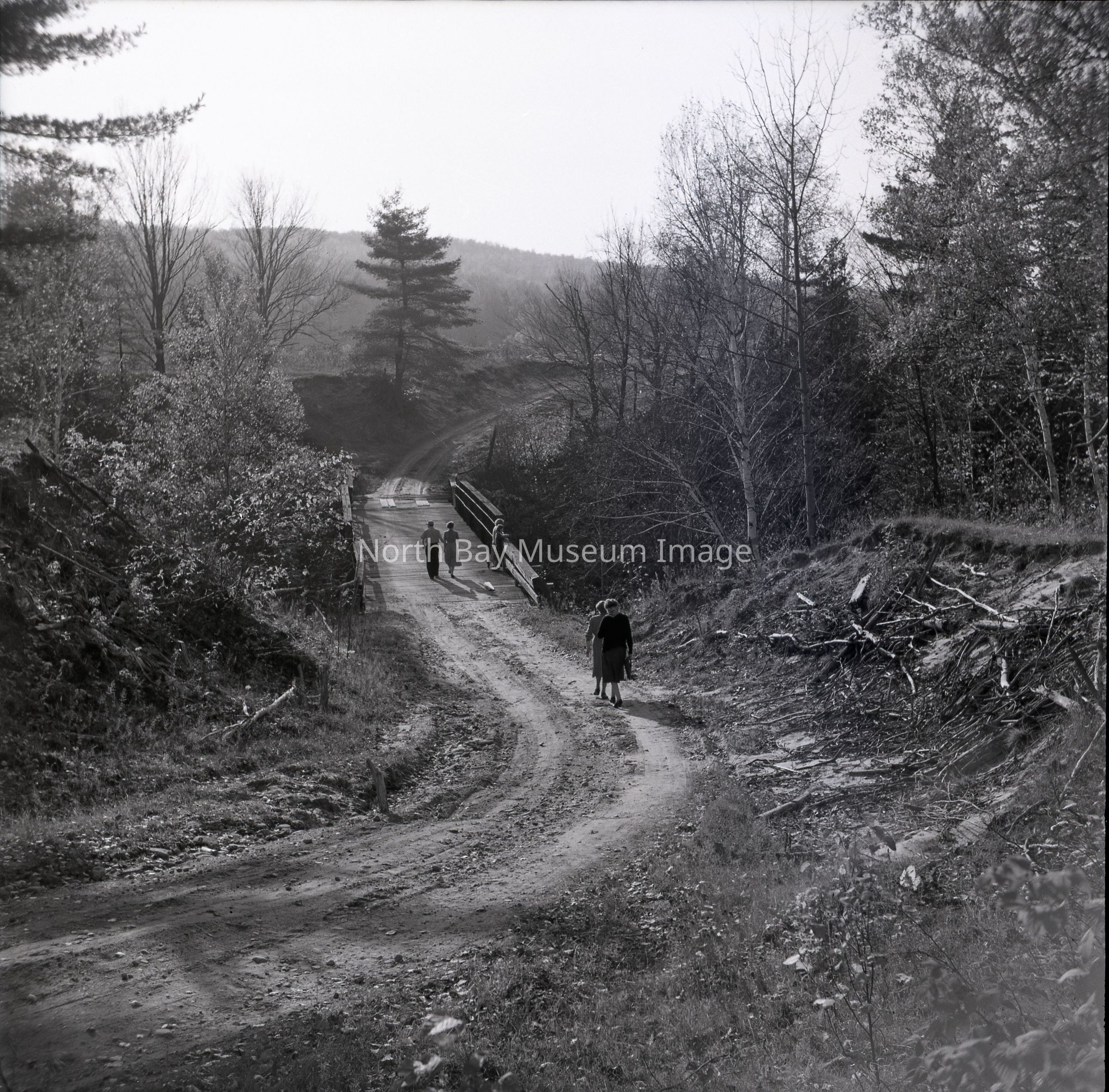 Envelope (a) contains the photographs and negatives (b-c) of a Winding road in Nipissing Village, North Bay. The image is of a old winding road early in the morning as the sun is rising. There is a group of individuals pictured in the photo who are crossing a small bridge on the winding road and two approaching behind to cross as well. A part of the Forder Collection. The photographers original accession number is 6F9. All the publications of the images are written on the envelopeCreator