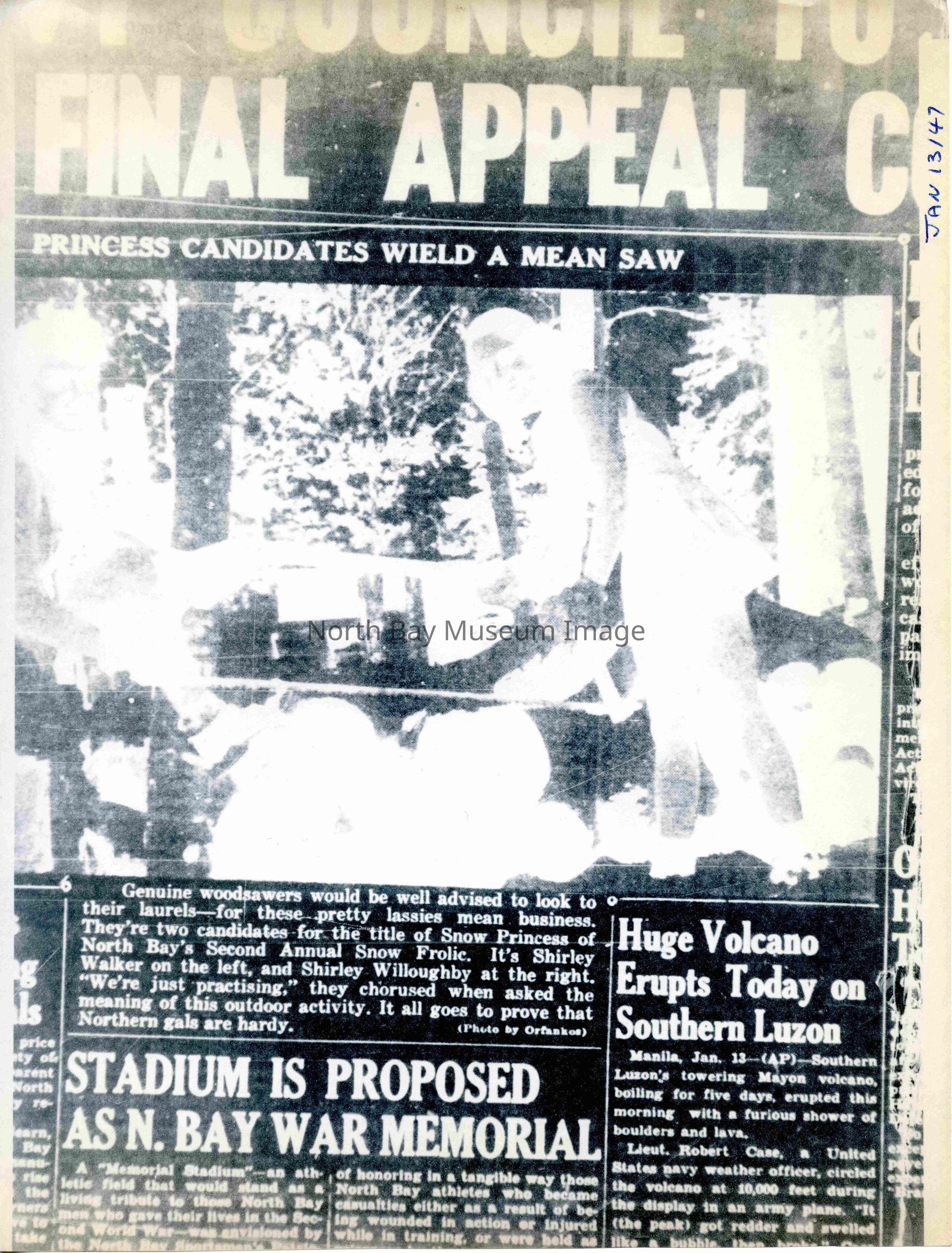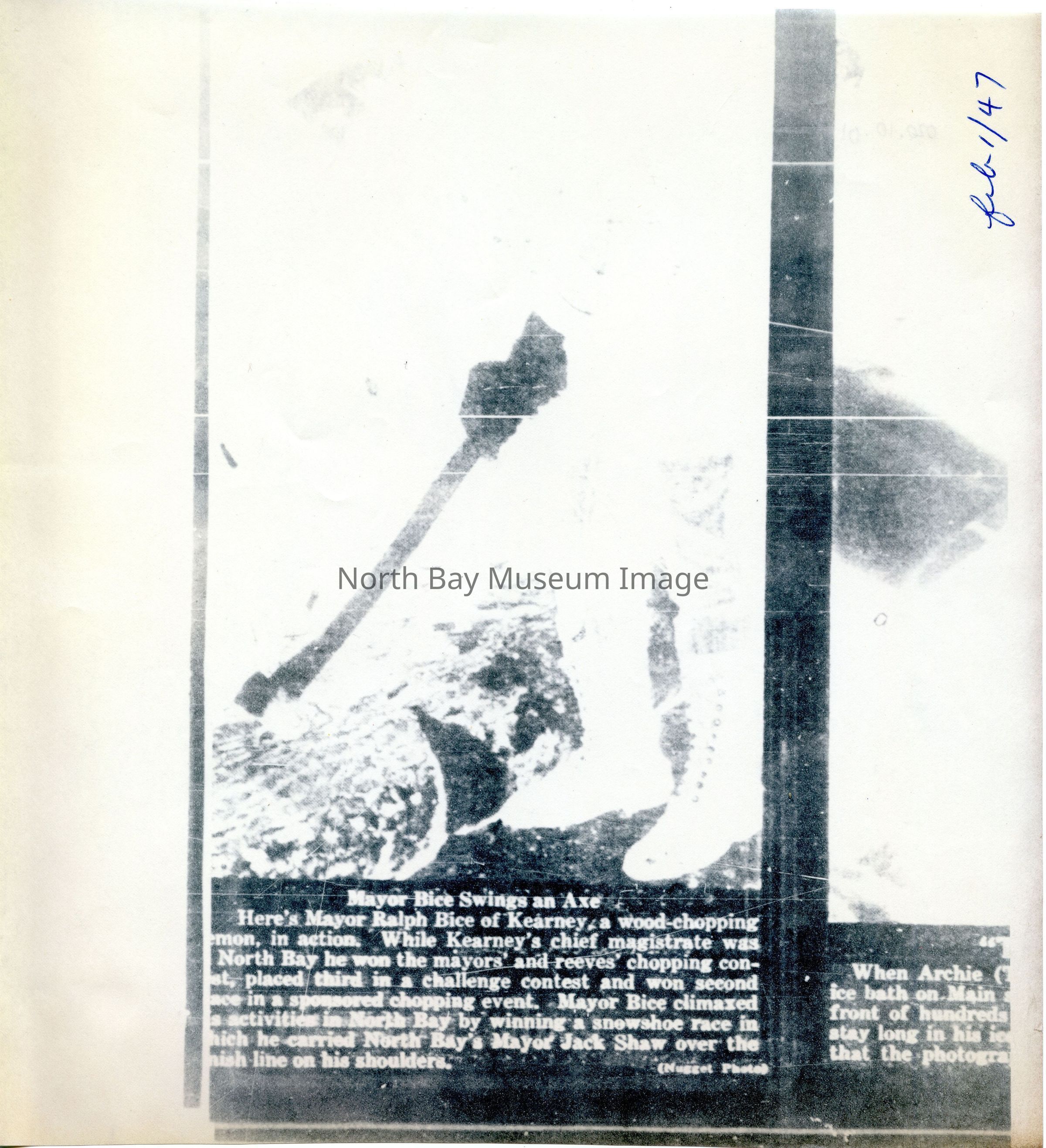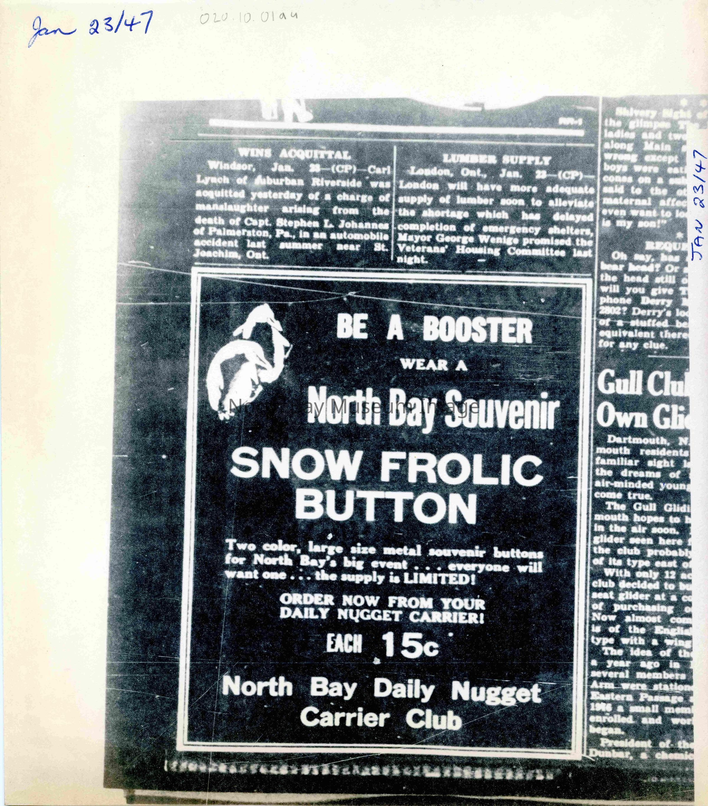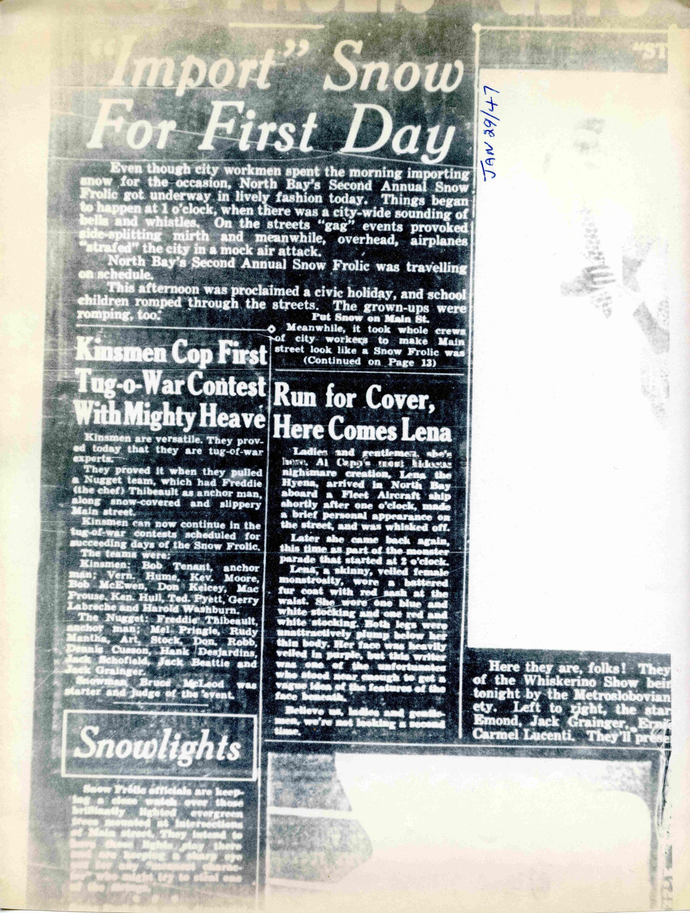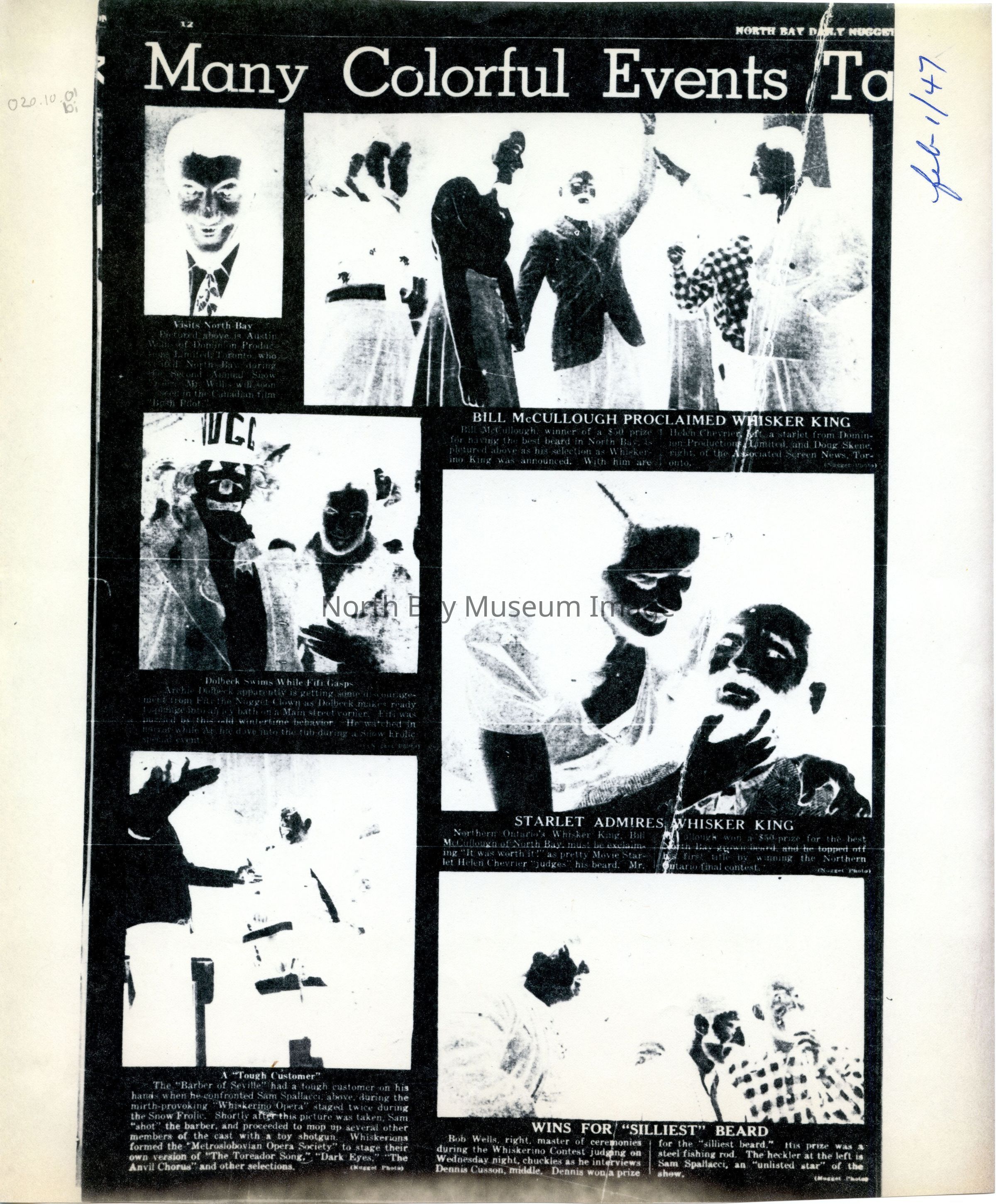 -Researched and prepared by Pamela Handley (Museum Curator) believed by accessing North Bay Nugget artifacts and requesting copies based on microfiche of news articles. Negatives have now been destroyed by North Bay Nugget and so photos are now only source of access. Each photo and news paper scan has been retained.