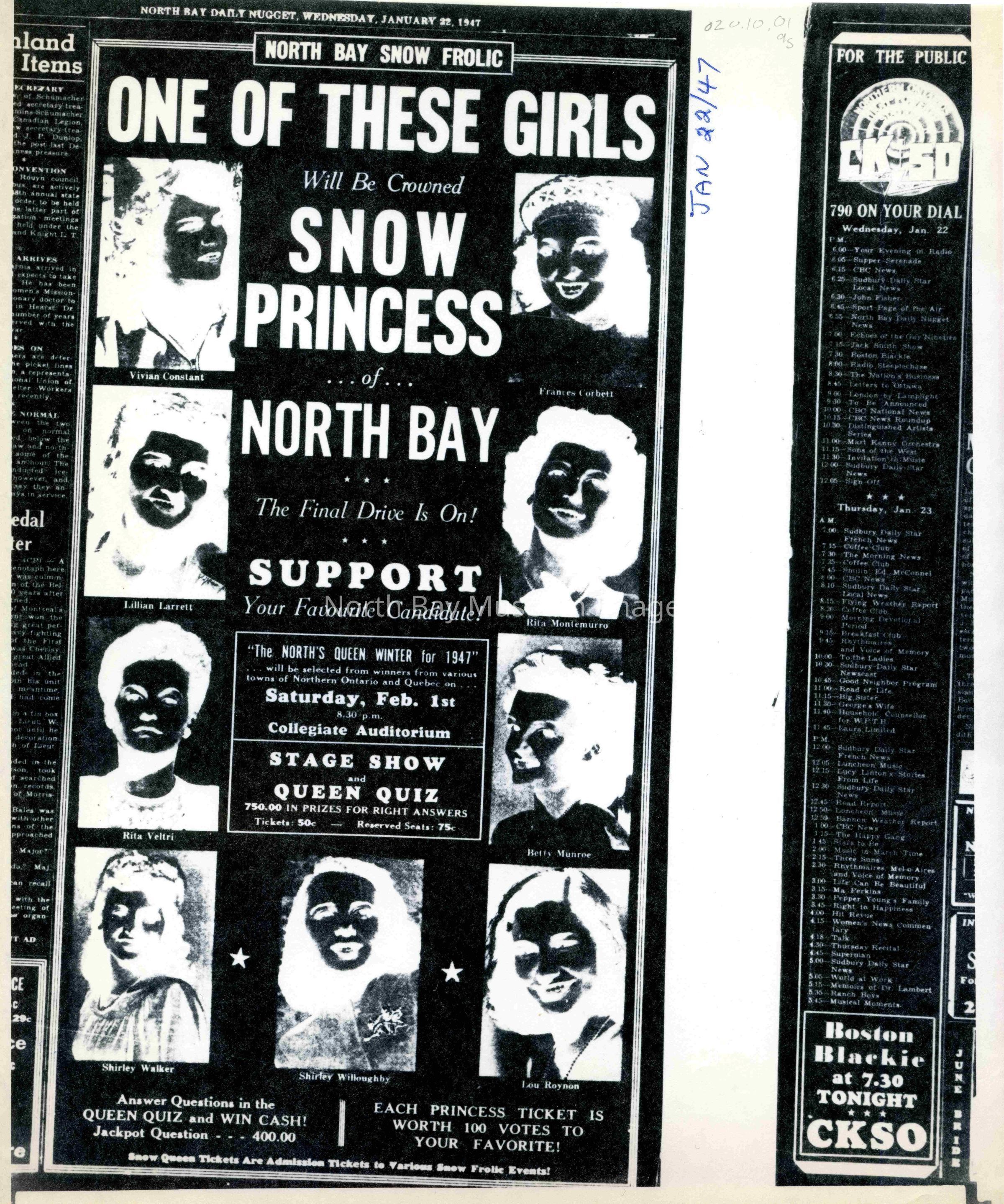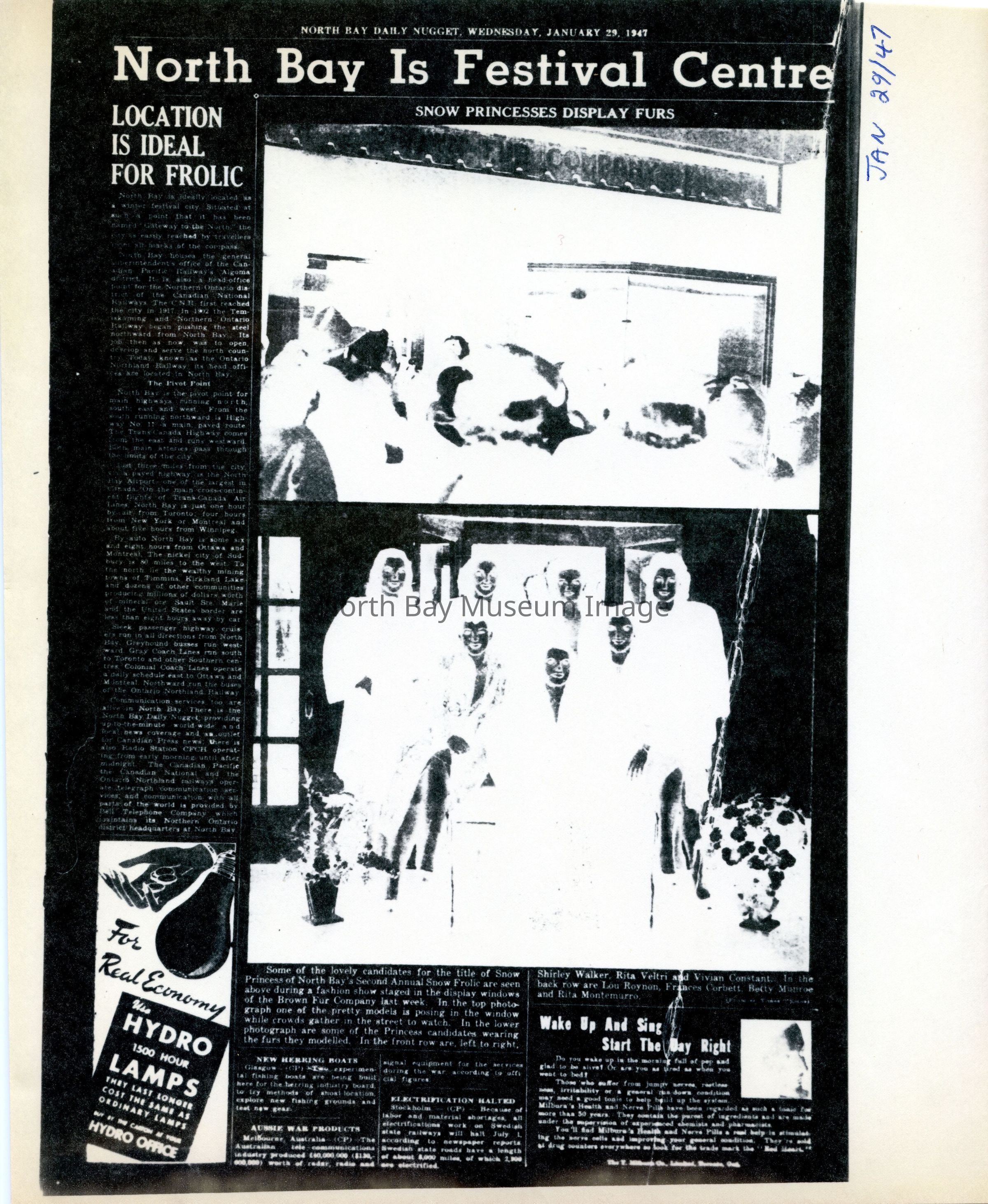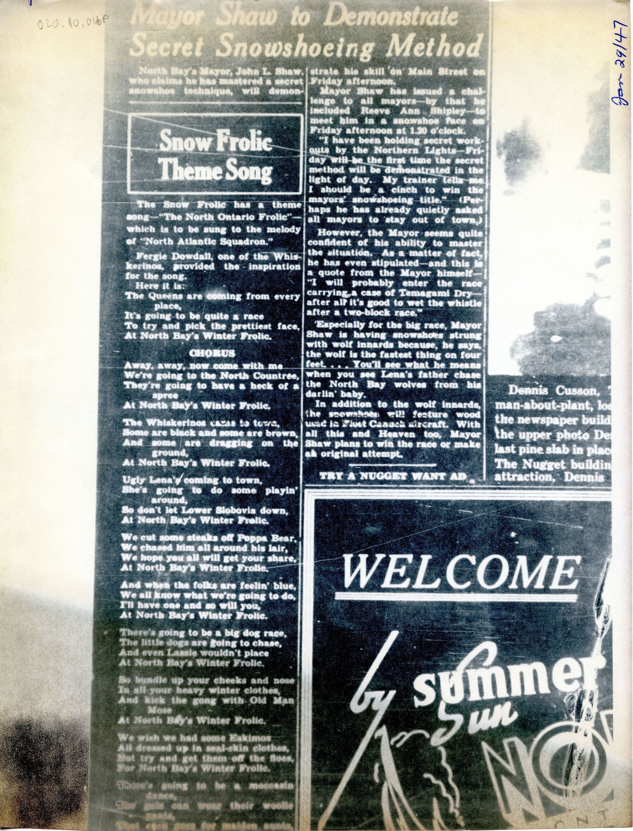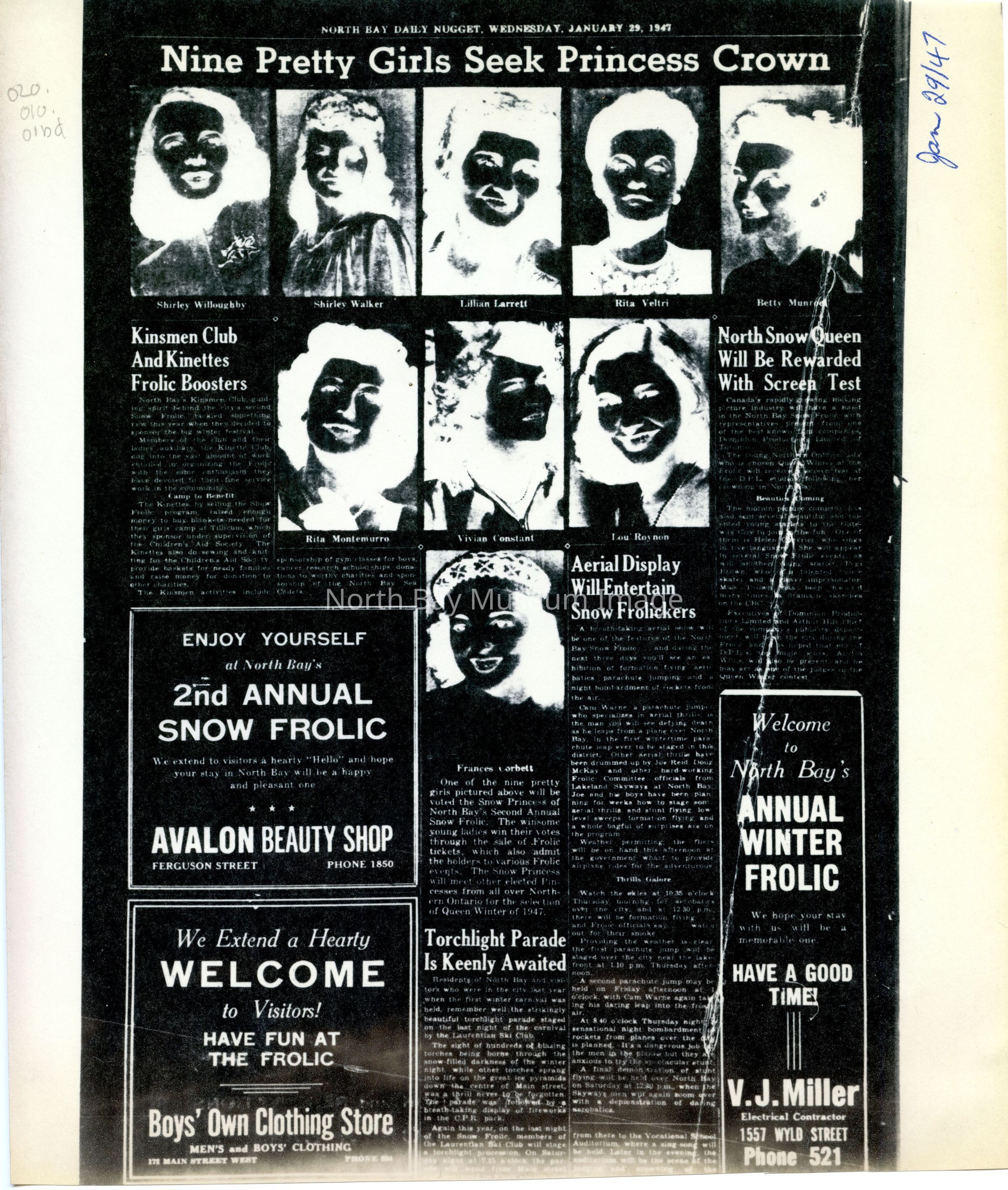 -Researched and prepared by Pamela Handley (Museum Curator) believed by accessing North Bay Nugget artifacts and requesting copies based on microfiche of news articles. Negatives have now been destroyed by North Bay Nugget and so photos are now only source of access. Each photo and news paper scan has been retained.