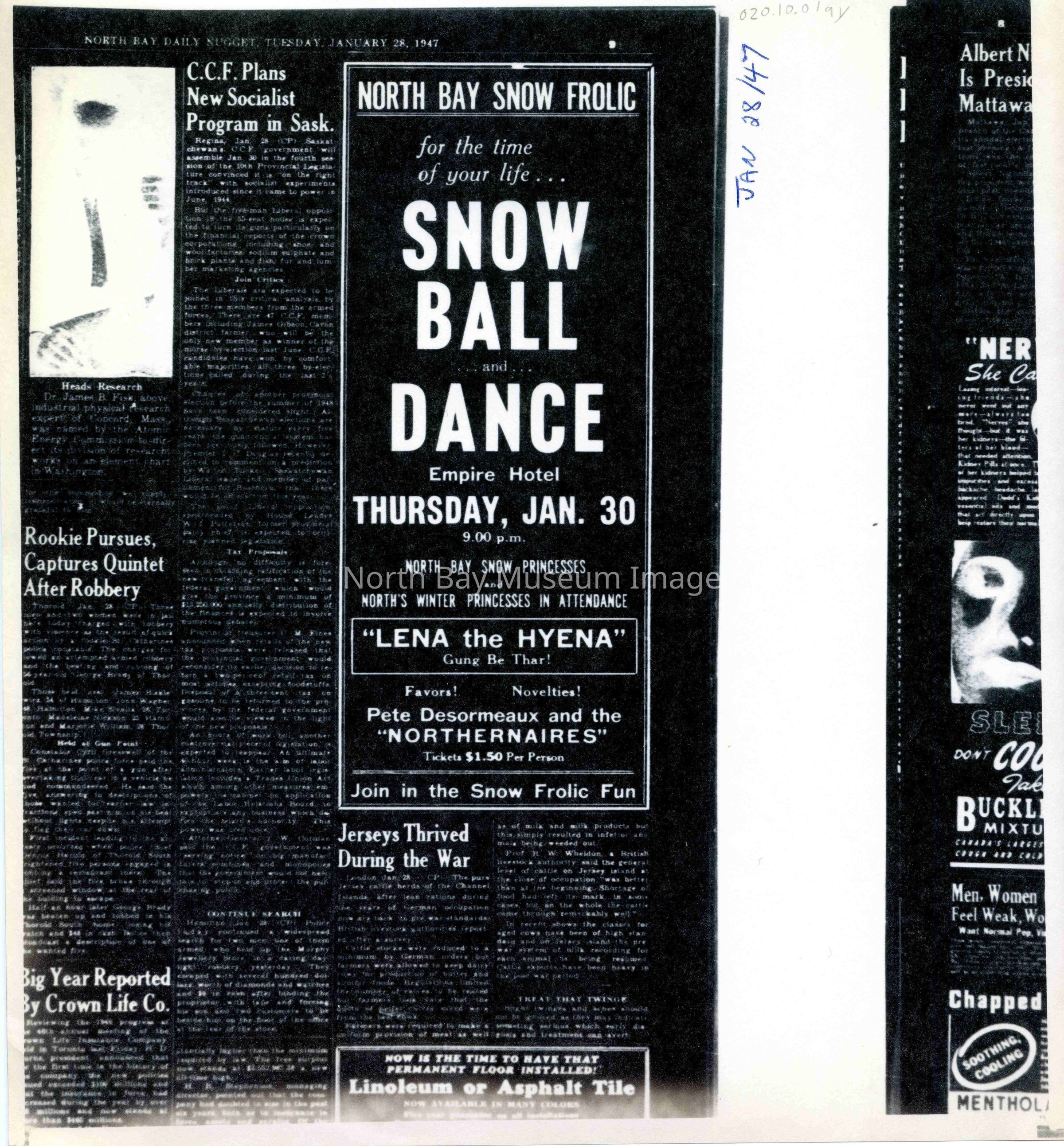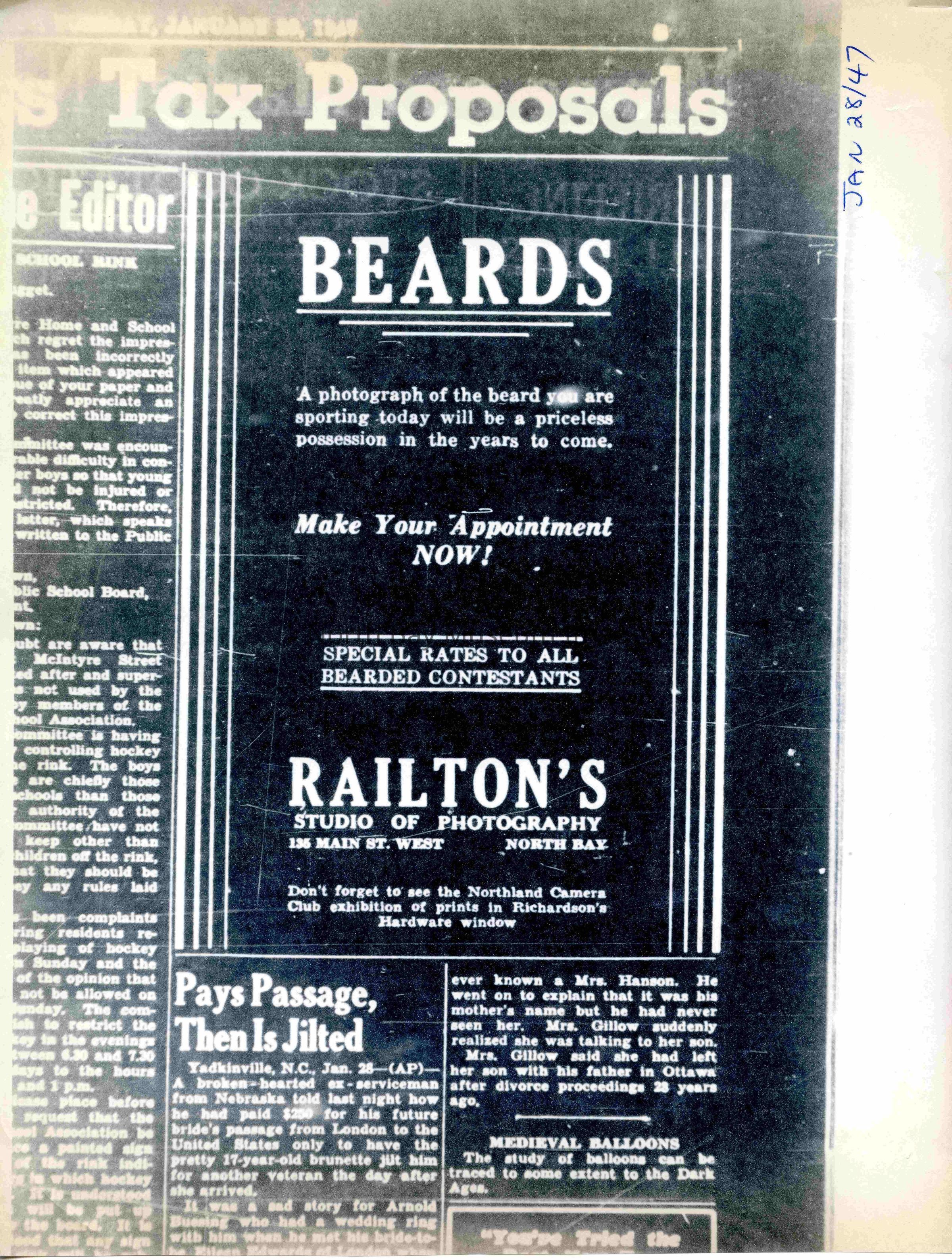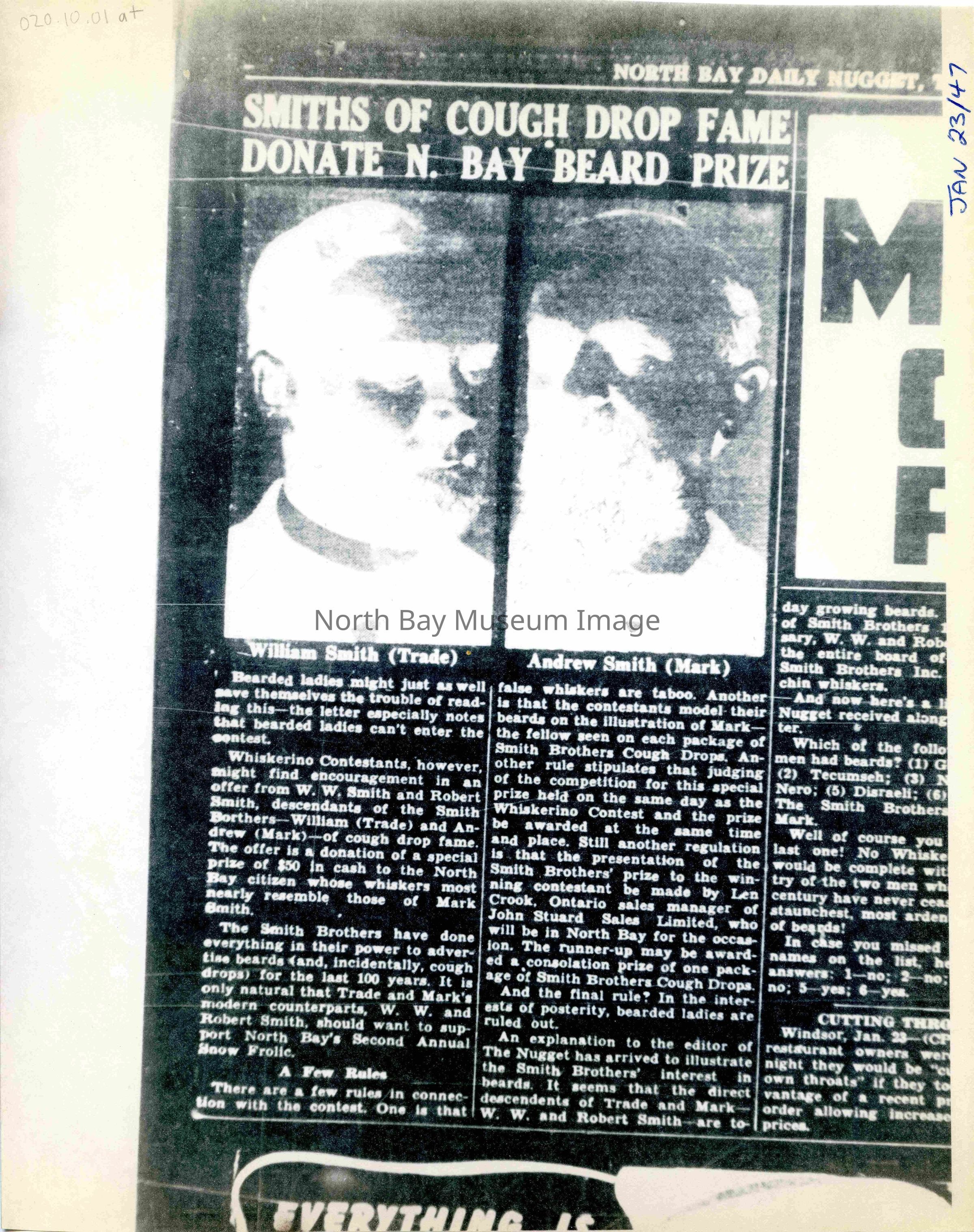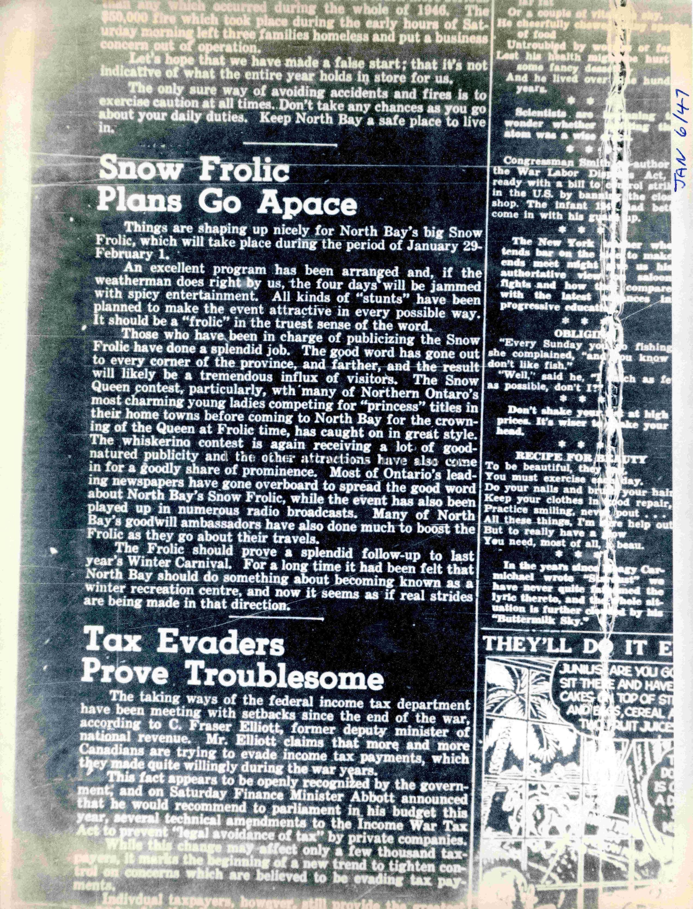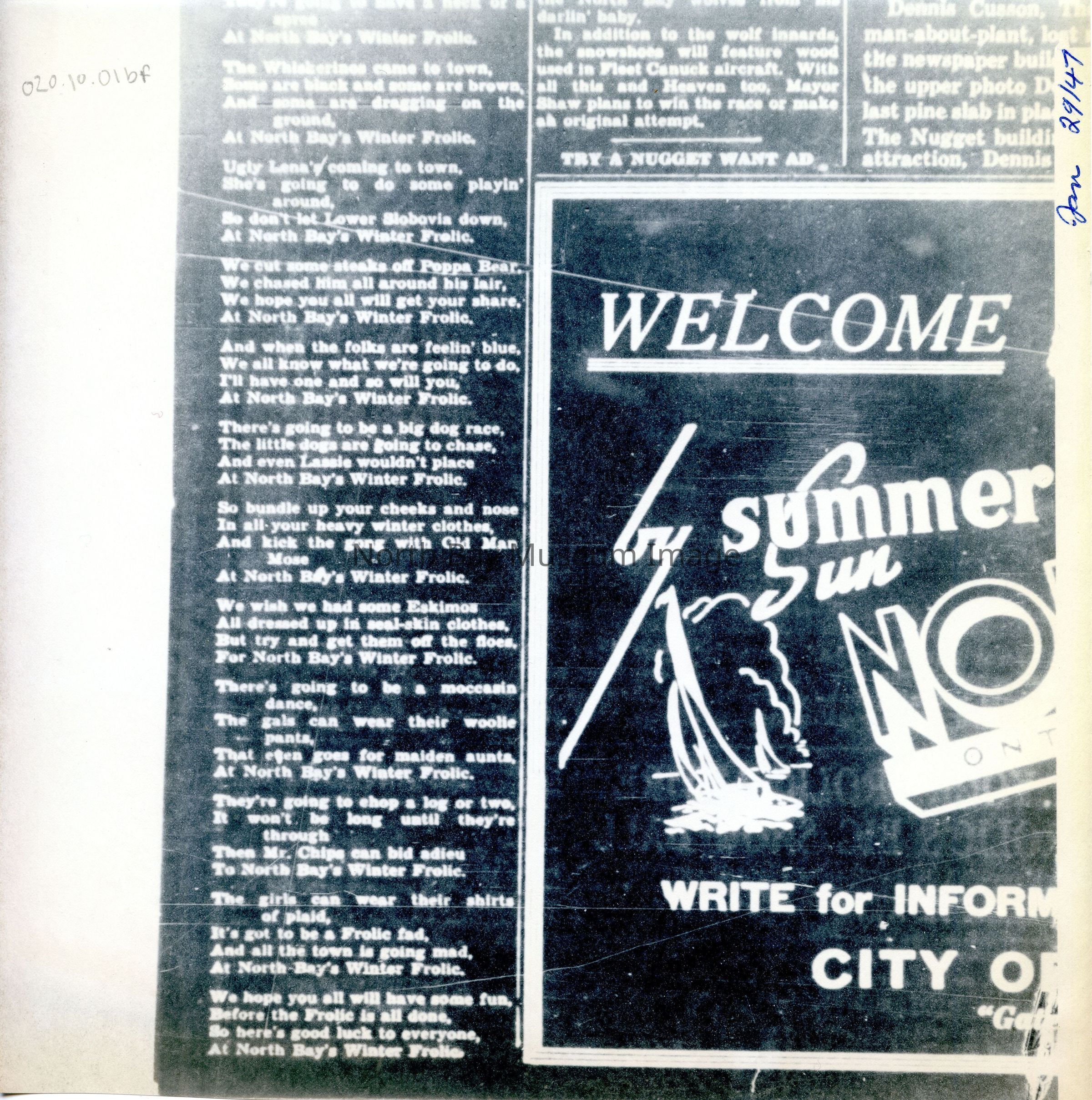 -Researched and prepared by Pamela Handley (Museum Curator) believed by accessing North Bay Nugget artifacts and requesting copies based on microfiche of news articles. Negatives have now been destroyed by North Bay Nugget and so photos are now only source of access. Each photo and news paper scan has been retained.