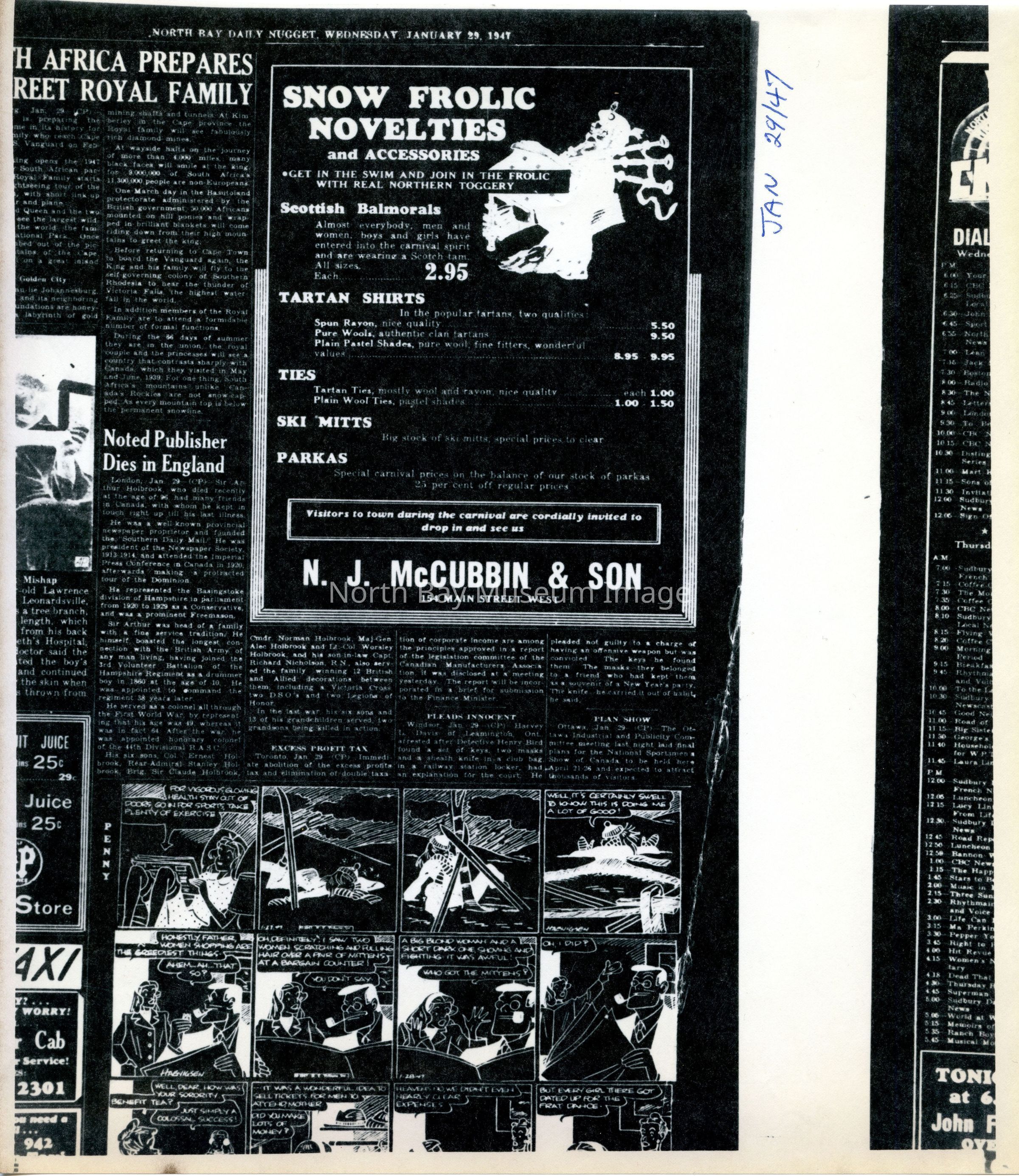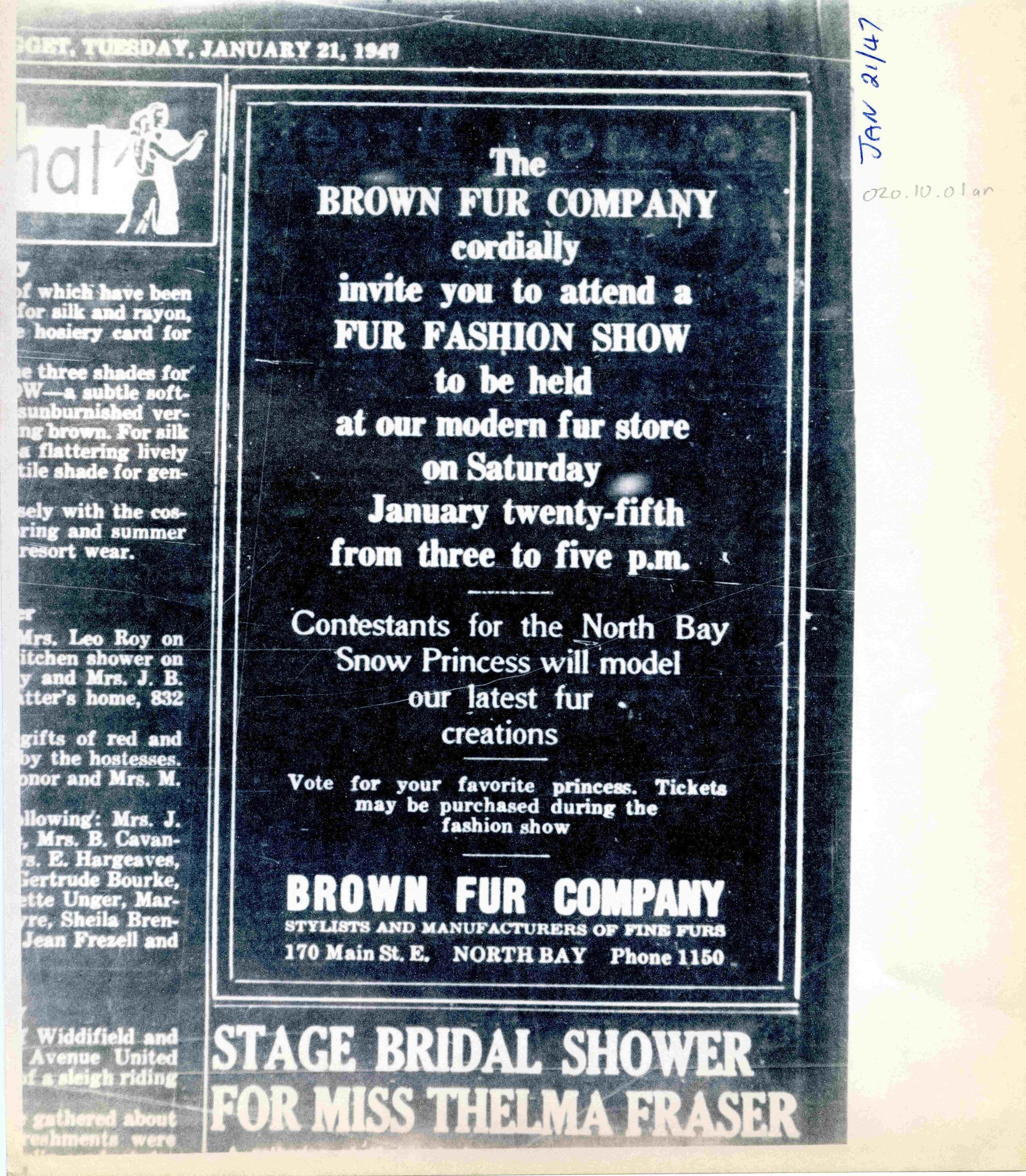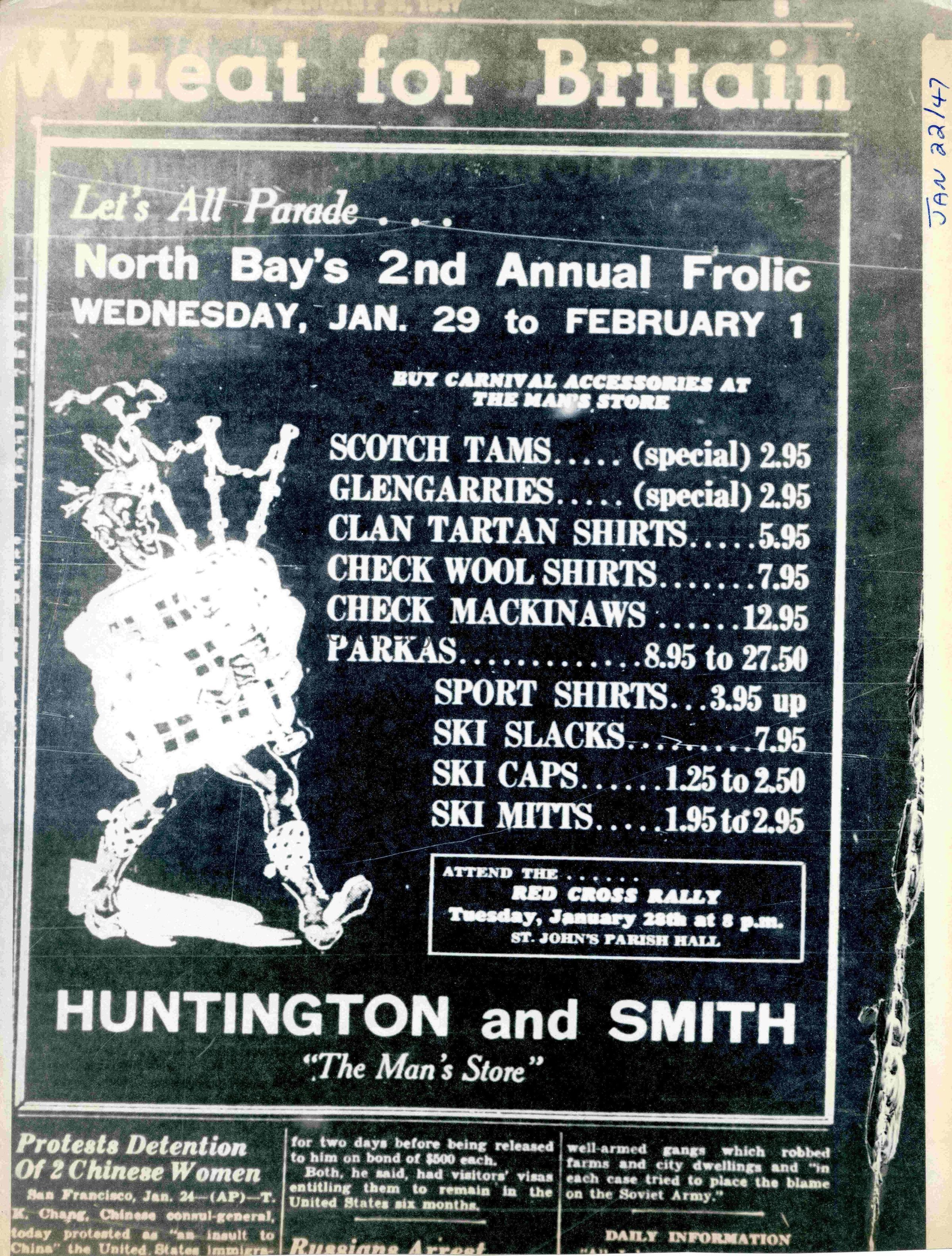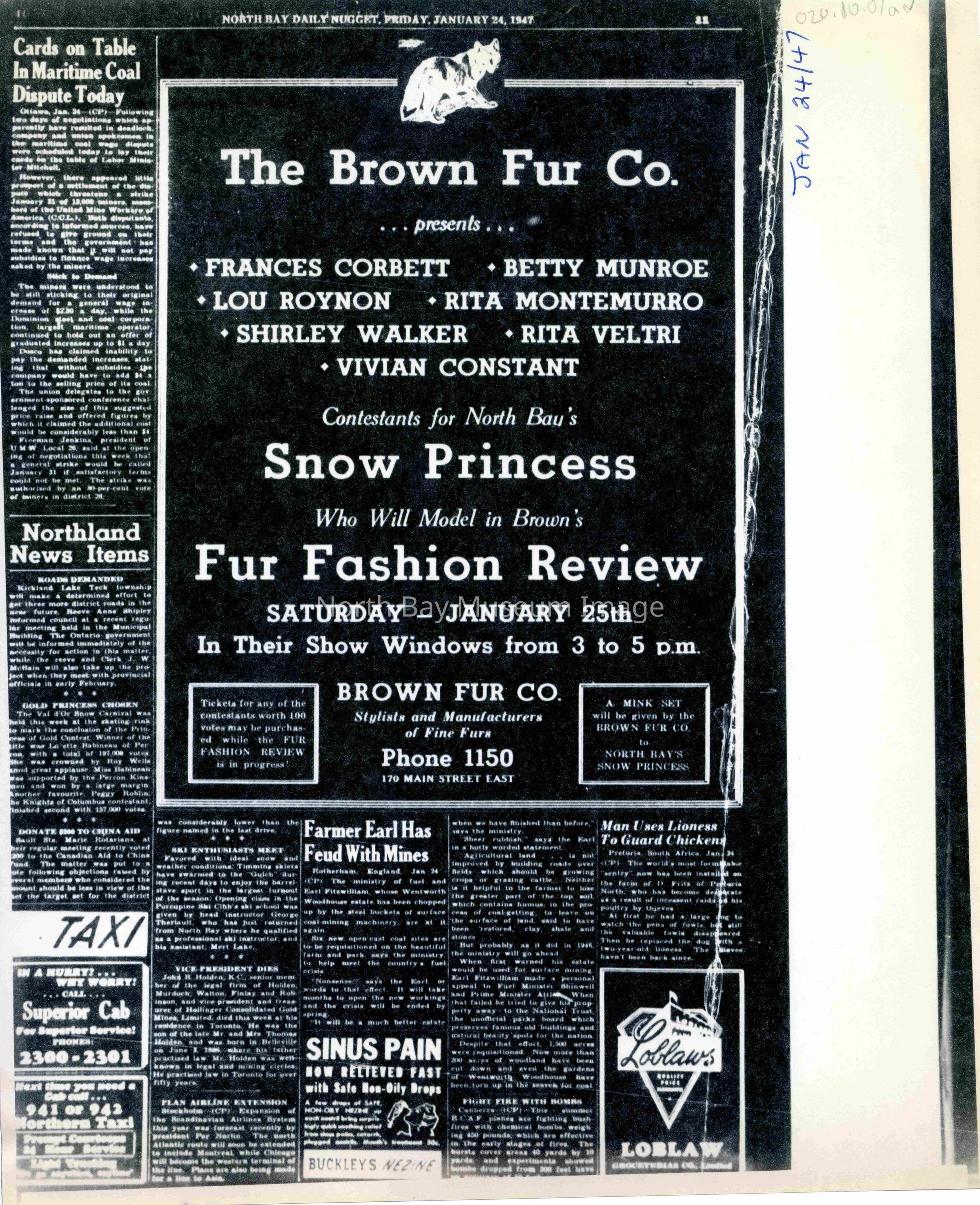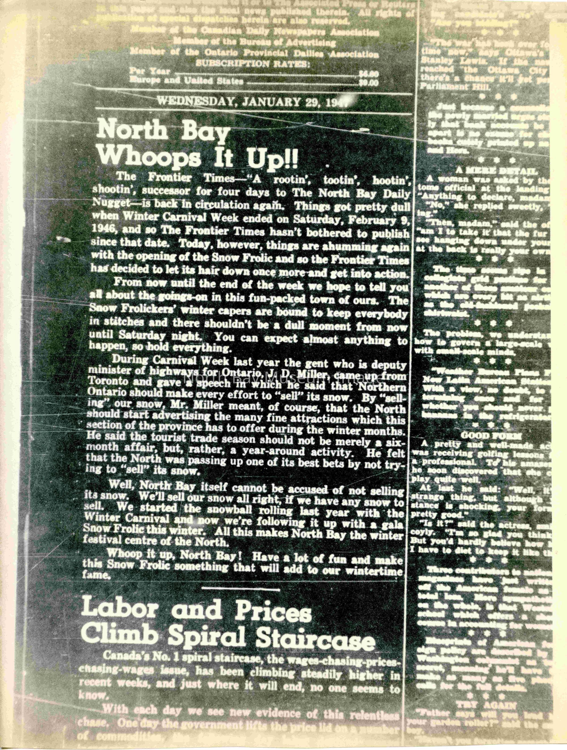 -Researched and prepared by Pamela Handley (Museum Curator) believed by accessing North Bay Nugget artifacts and requesting copies based on microfiche of news articles. Negatives have now been destroyed by North Bay Nugget and so photos are now only source of access. Each photo and news paper scan has been retained.