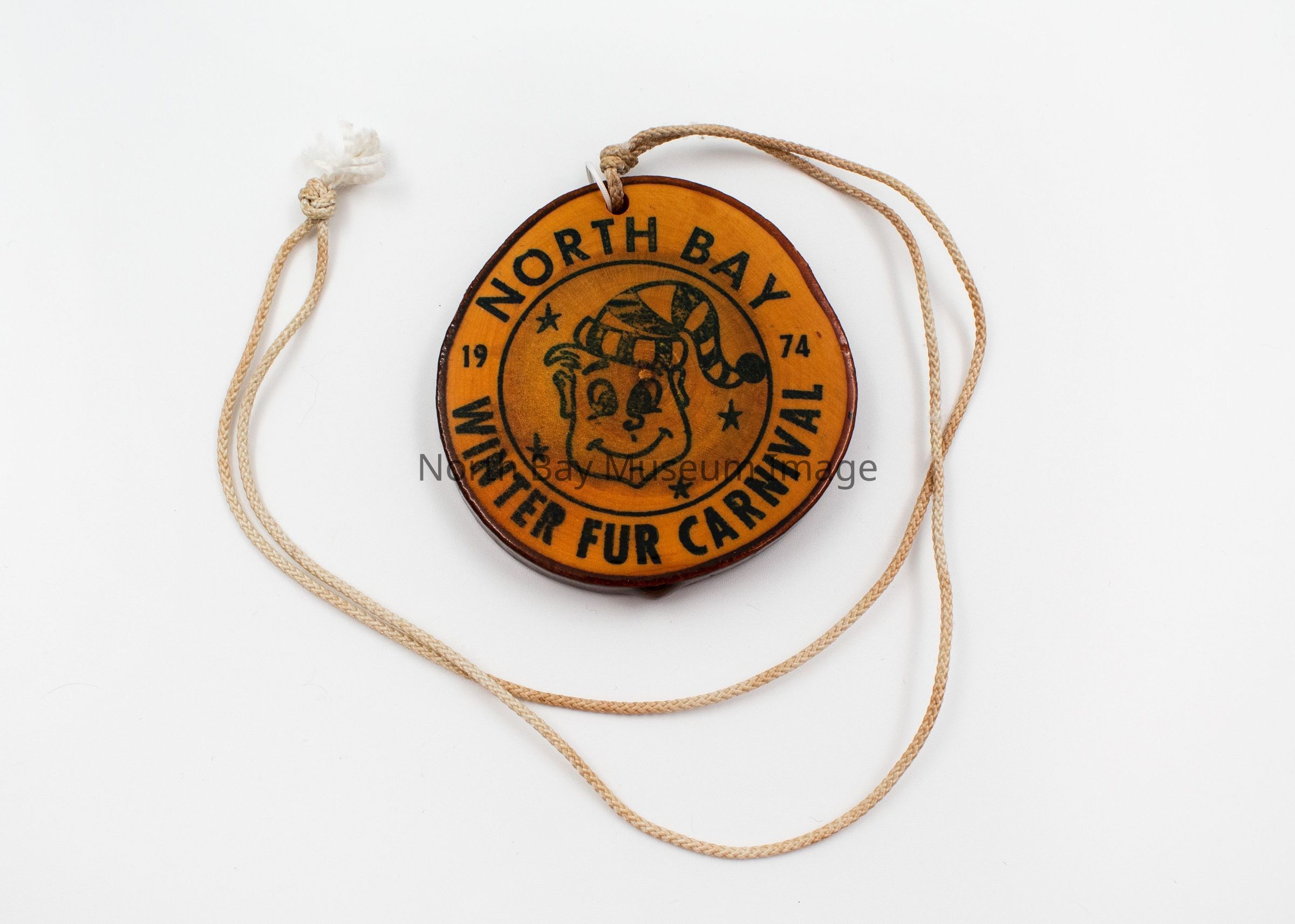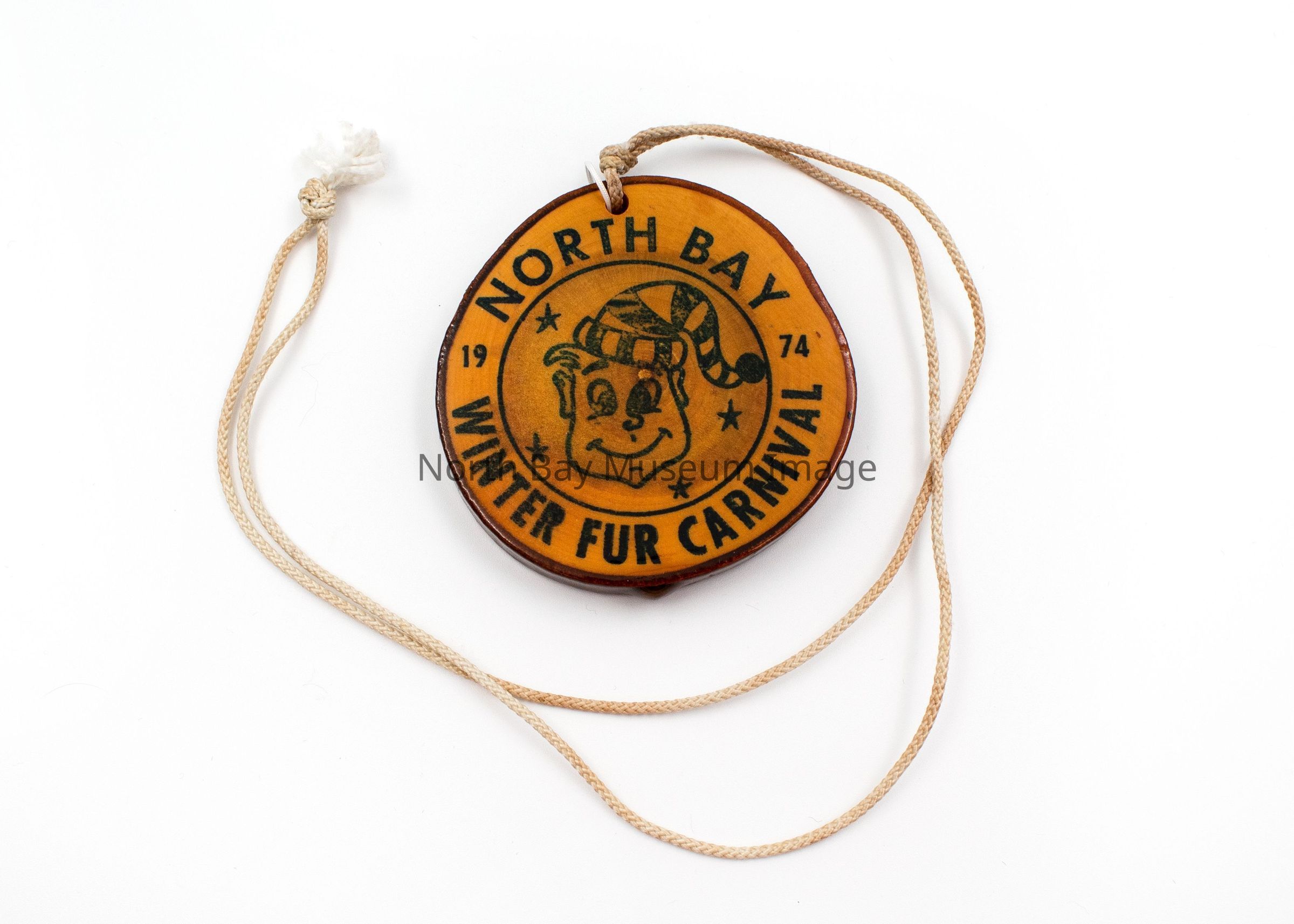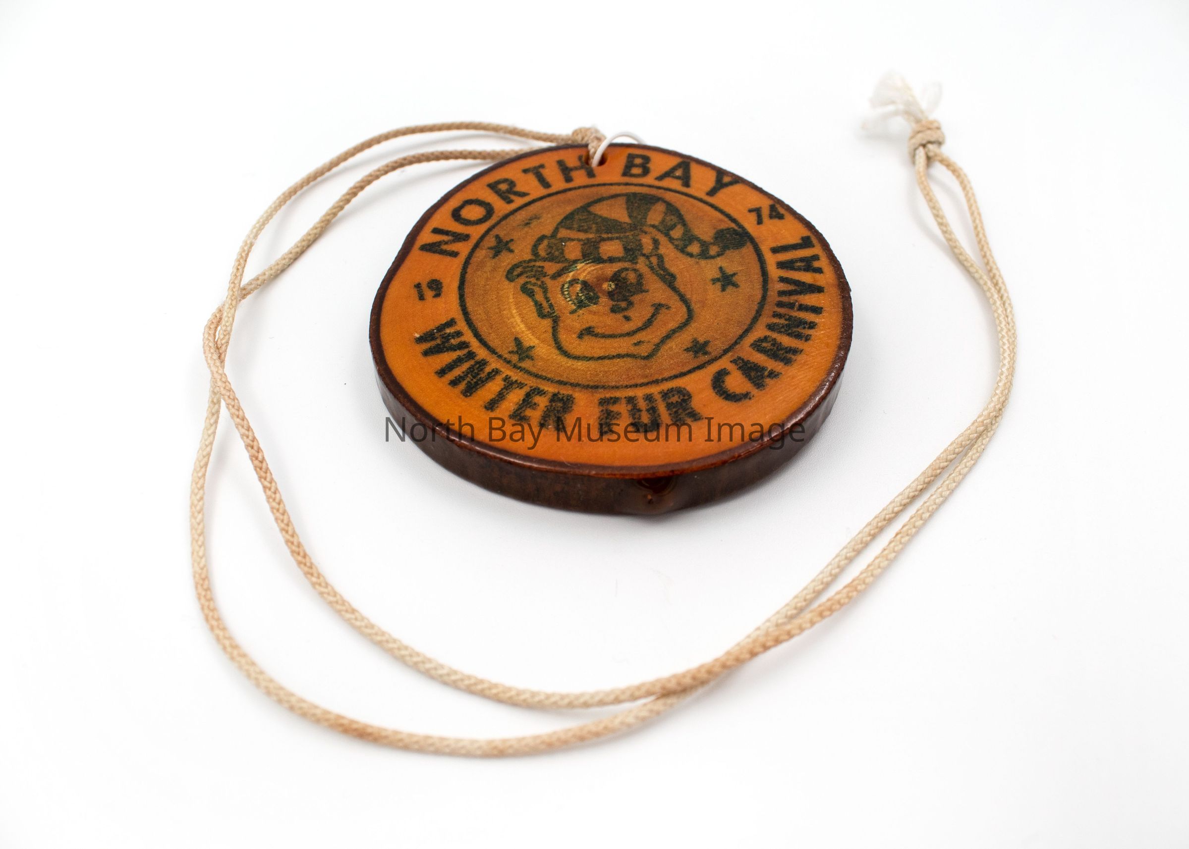 North Bay Winter Fur Carnival Medallions (2) with mascot in middle and North Bay Winter Fur Carnival around the perimeter. Double Sided. B has a ribbon stapled to it. Attached to string to wear as necklace. Made of small glazed tree rings.
