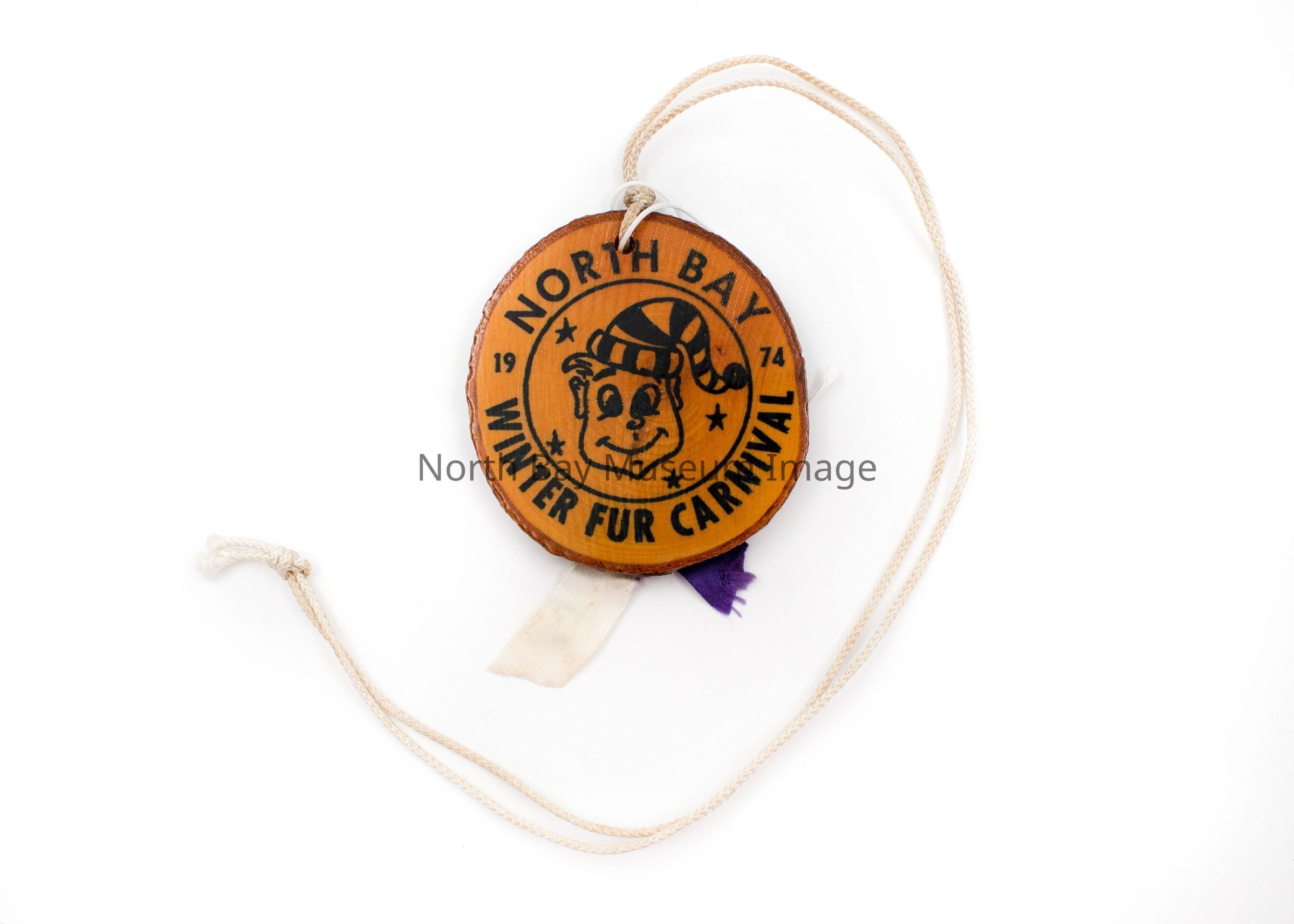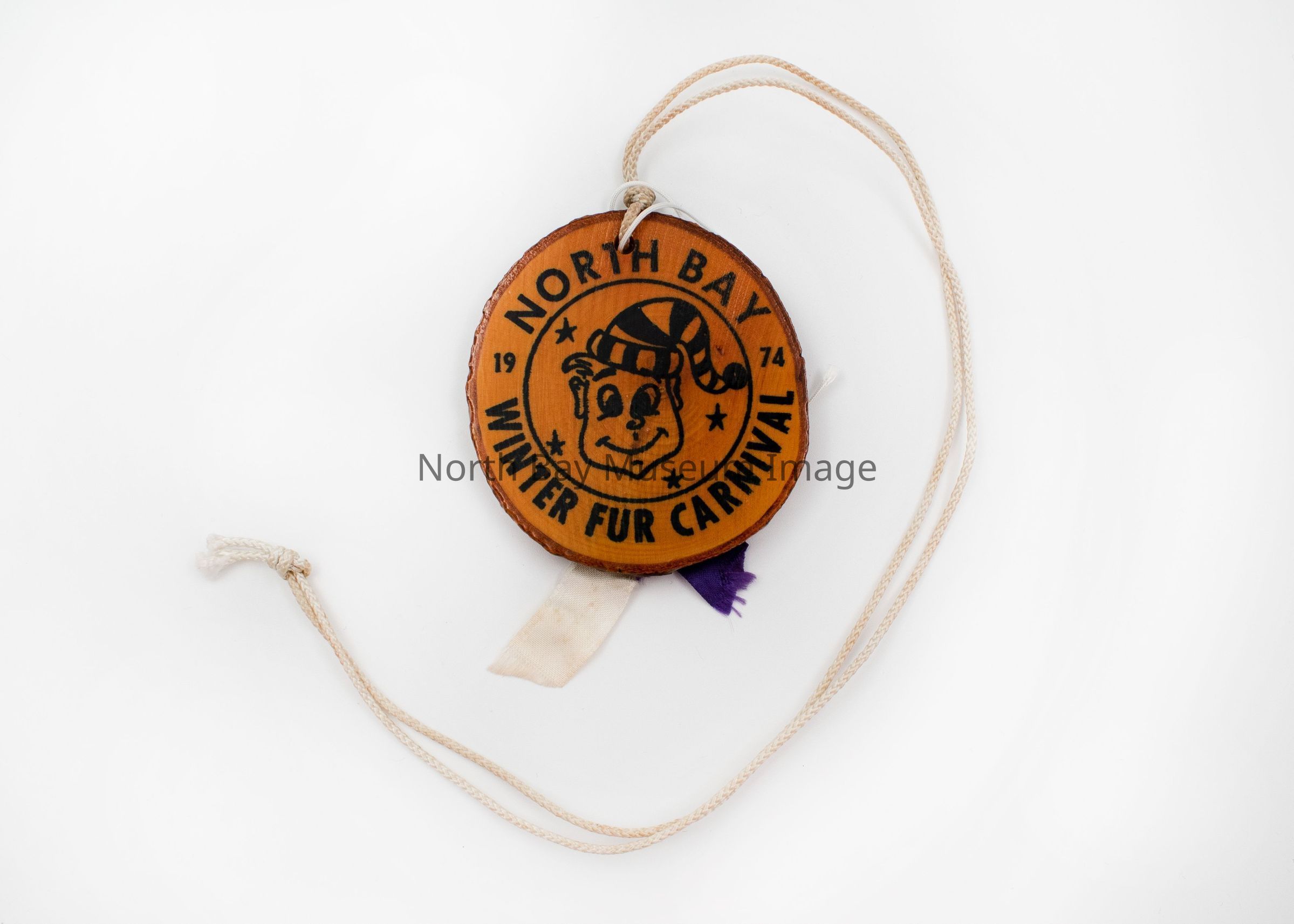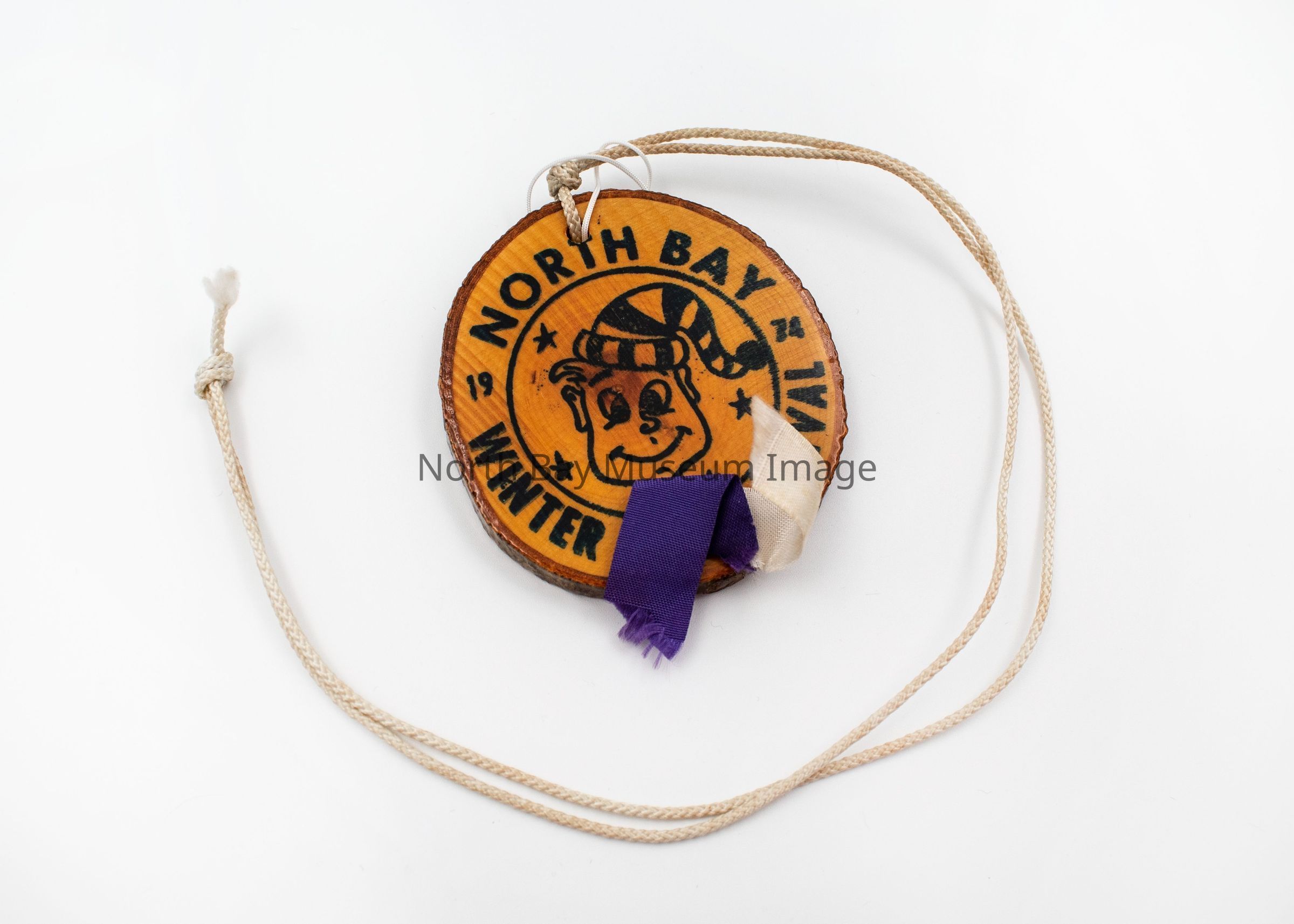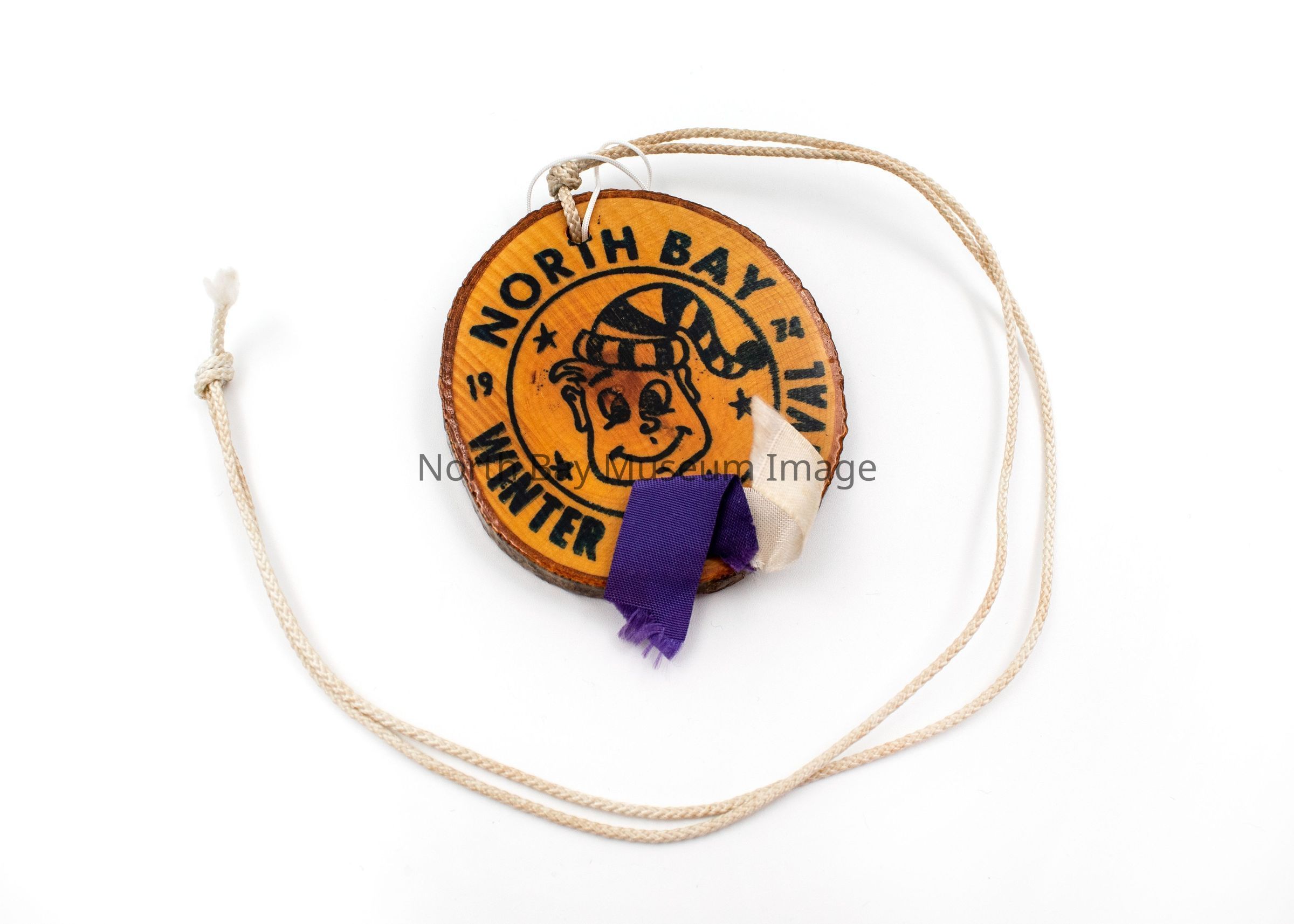 North Bay Winter Fur Carnival Medallions (2) with mascot in middle and North Bay Winter Fur Carnival around the perimeter. Double Sided. B has a ribbon stapled to it. Attached to string to wear as necklace. Made of small glazed tree rings.