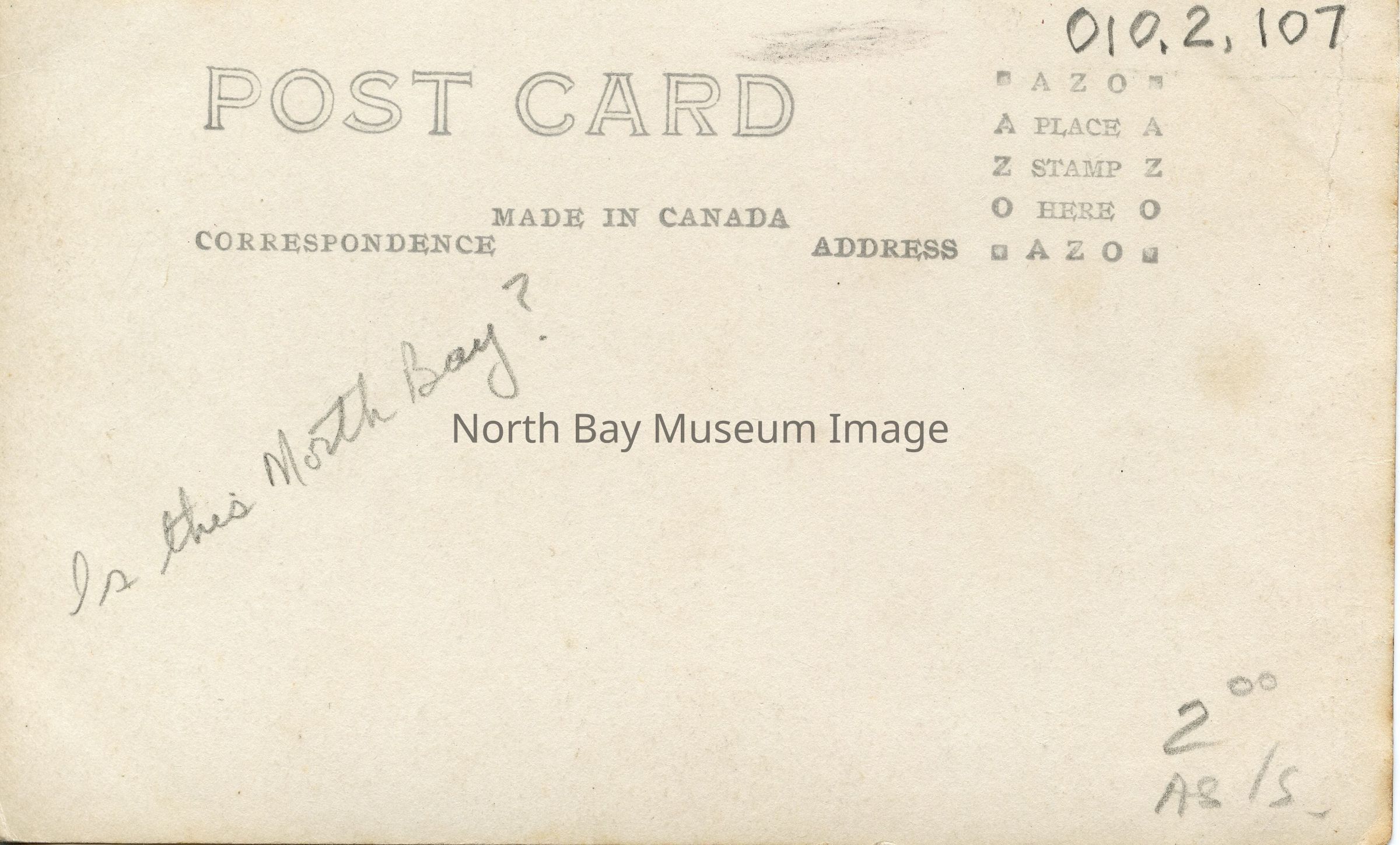 Centered at top of card: POST CARD, Made in Canada, Correspondence, Address. "Is this North Bay" is written in pencil on back of card as well.Creator