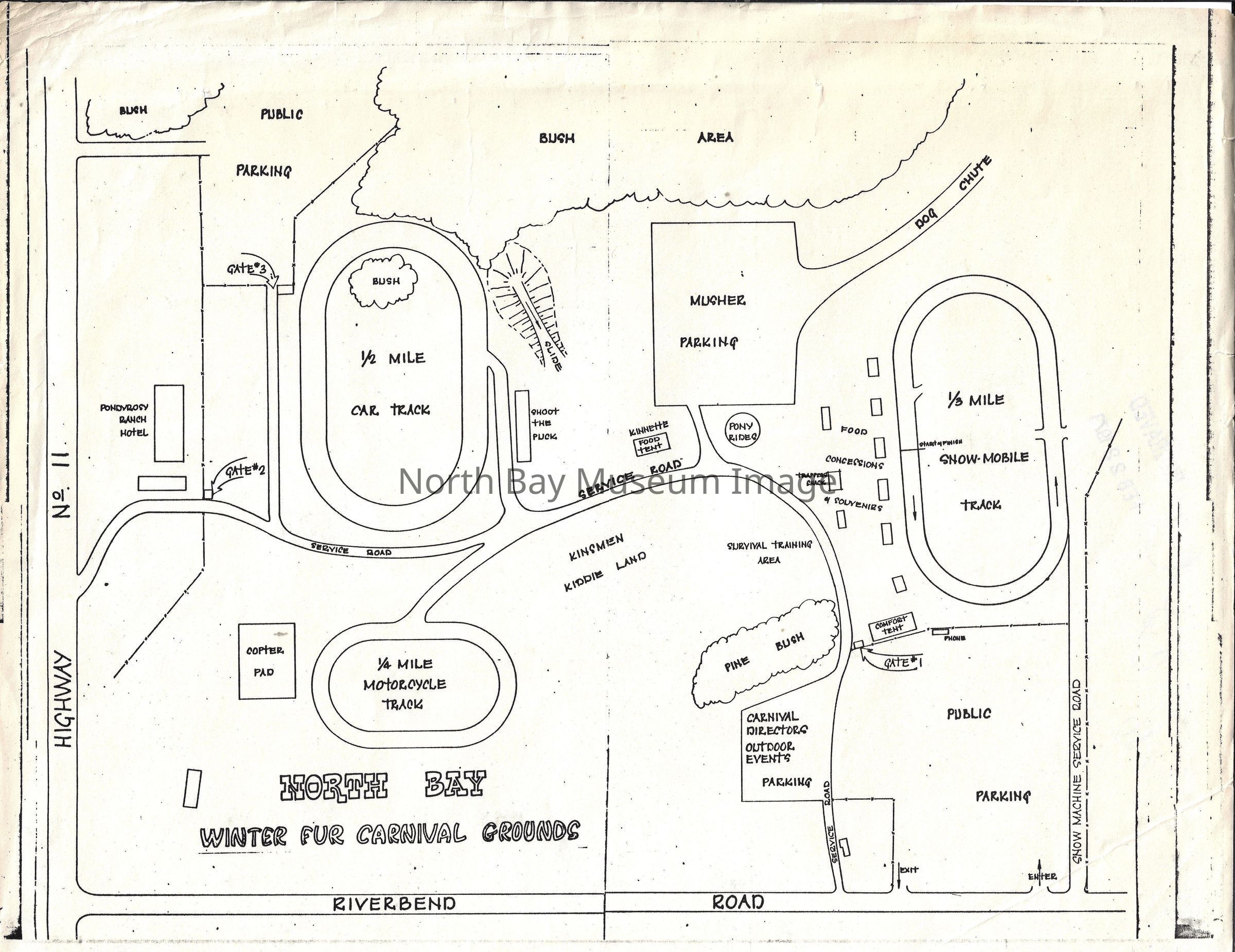 022.01.176e: 1974 Fur Carnival Map located North of Highway 11 South and East of Riverbend Road. Includes parking, car track, snowmobile track, musher parking, tube slide, kiddie land, pony races and motorcycle track.
