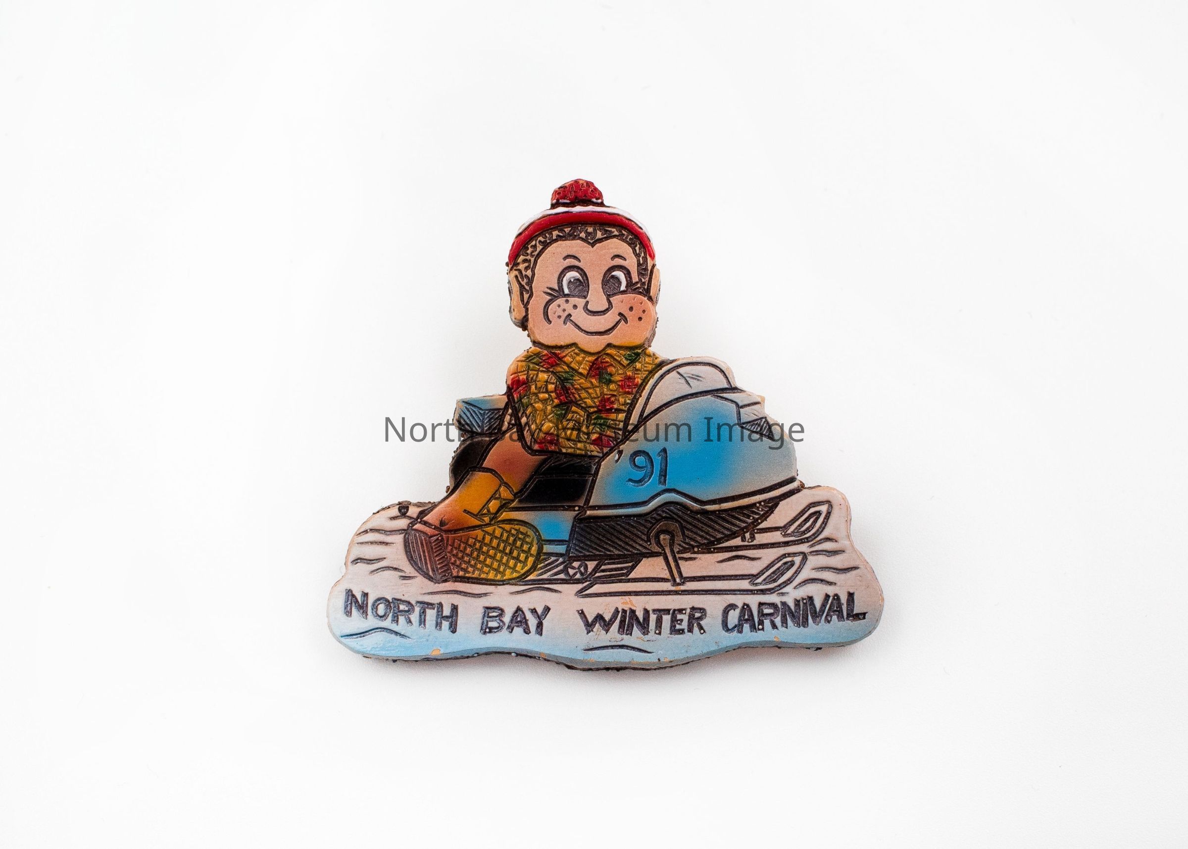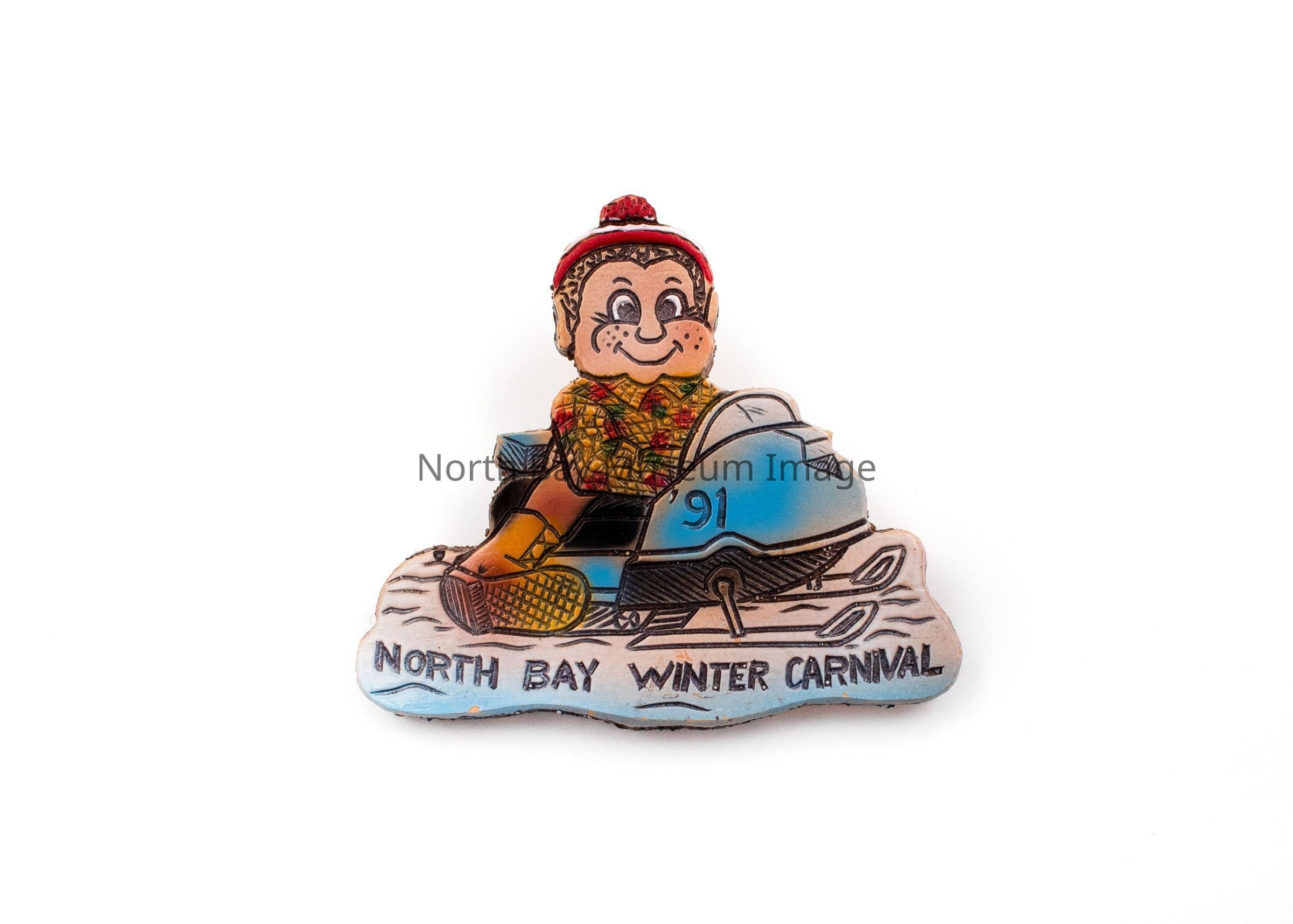 Pin from North Bay Fur Carnival picturing mascot on snowmobile with North Bay Winter Carnival across the bottom.