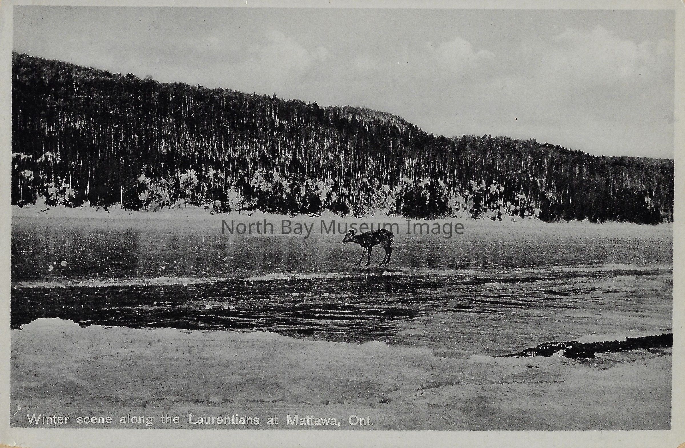 This is a black and white postcard of a winter scene. The postcard shows a small animal bending down to eat or drink something. There appears to be no building and no people around the animal. The Inscriptions read: "Winter scene along the Laurentians at Mattawa, Ont.", "JC".Date(s) of Creation