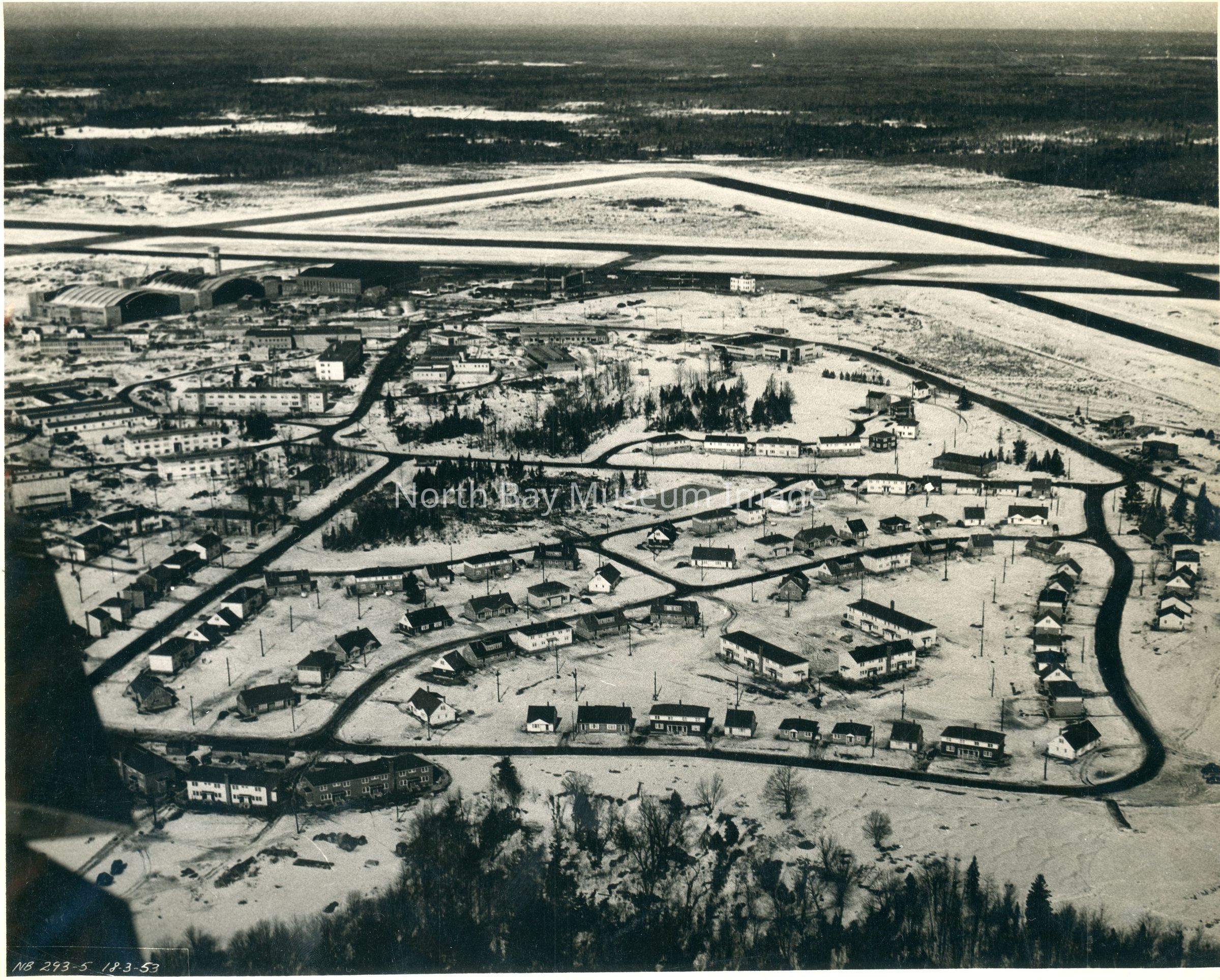 Many houses & buildings in background, airport Hangars are in top left side of photo.