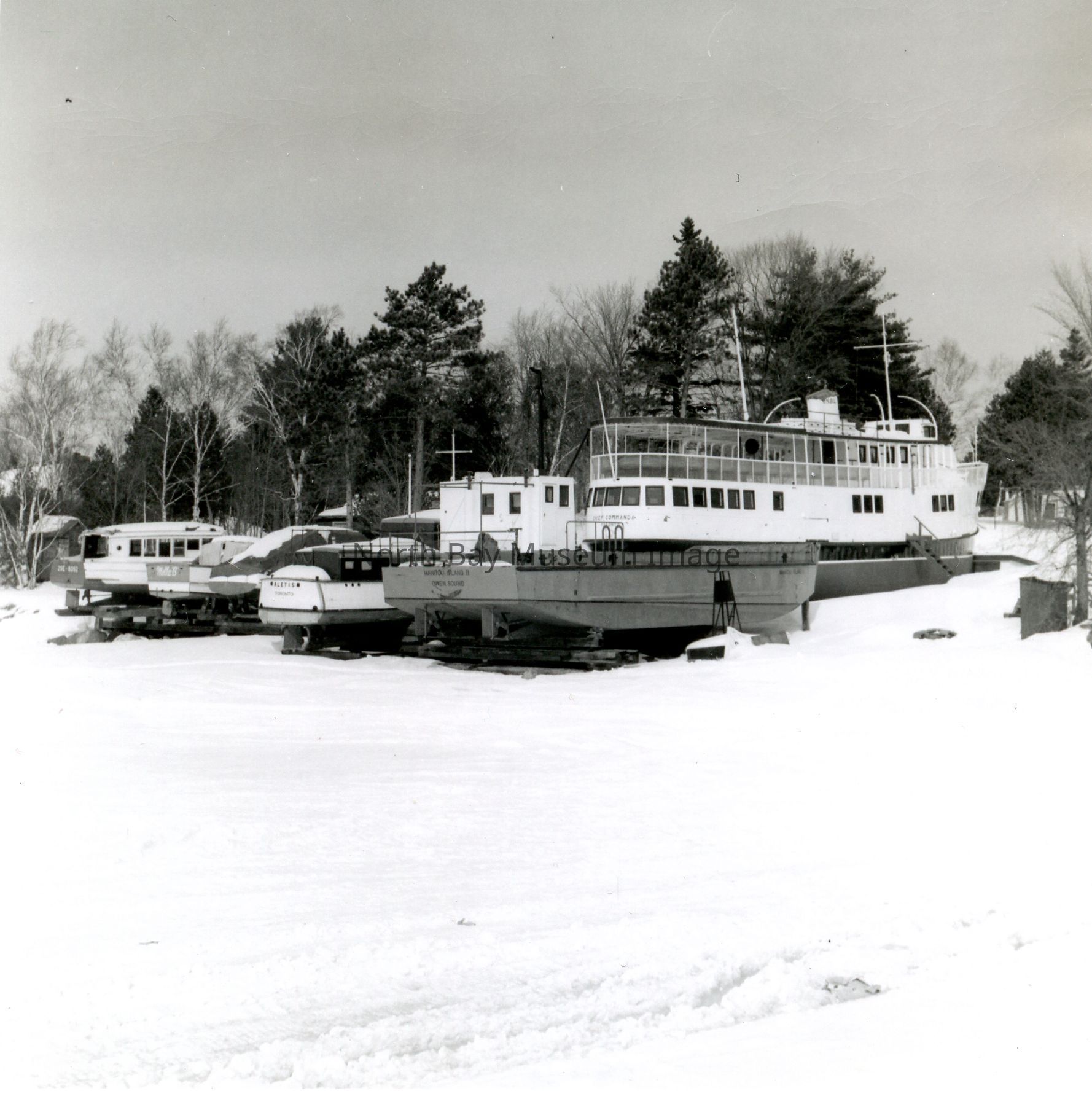 Photograph of winter boat storage at Callander. The image is of the Chief Commanda I. The back of the photo says "Manitoo ONR Barge and Aletis ONR Launch." This image is a part of the Forder Collection.Creator
