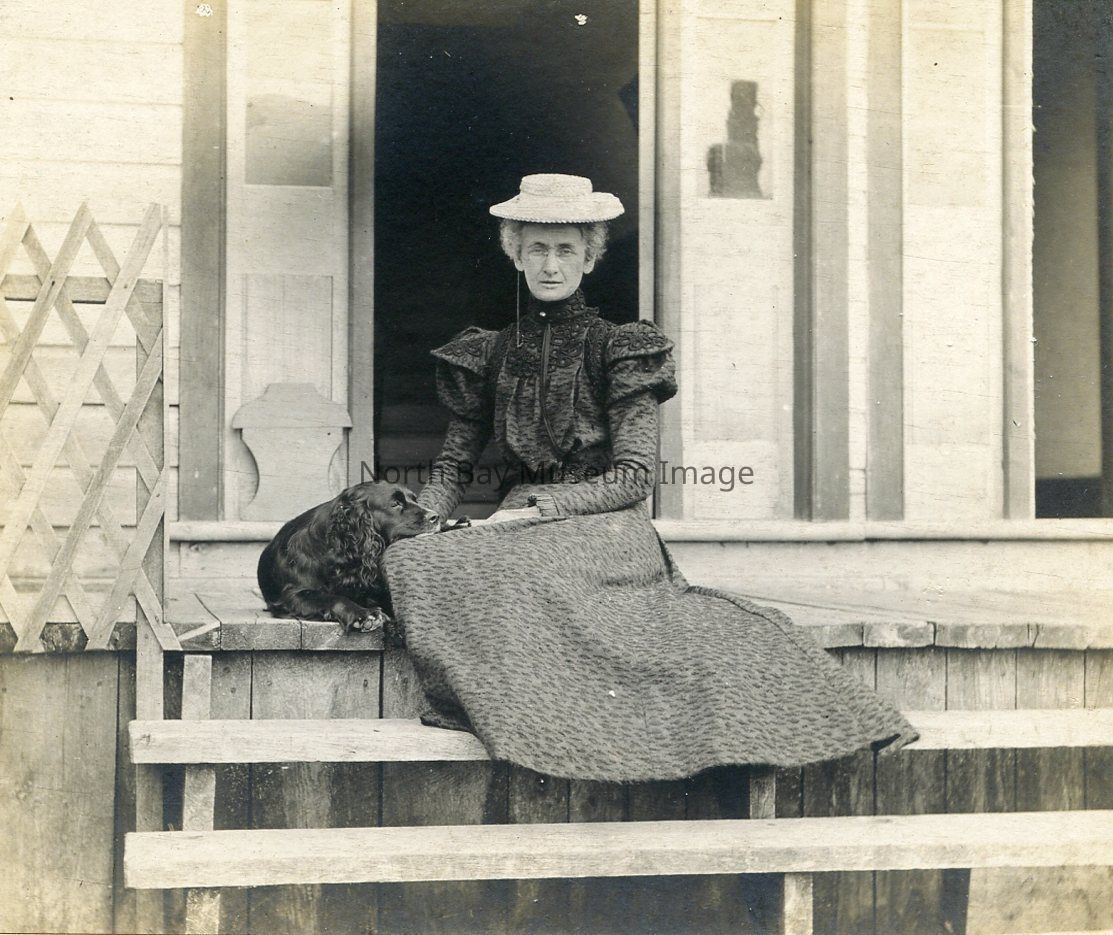 A woman sitting on porch steps with a small dog dressed in long dress with puffed sleeves and a white hat