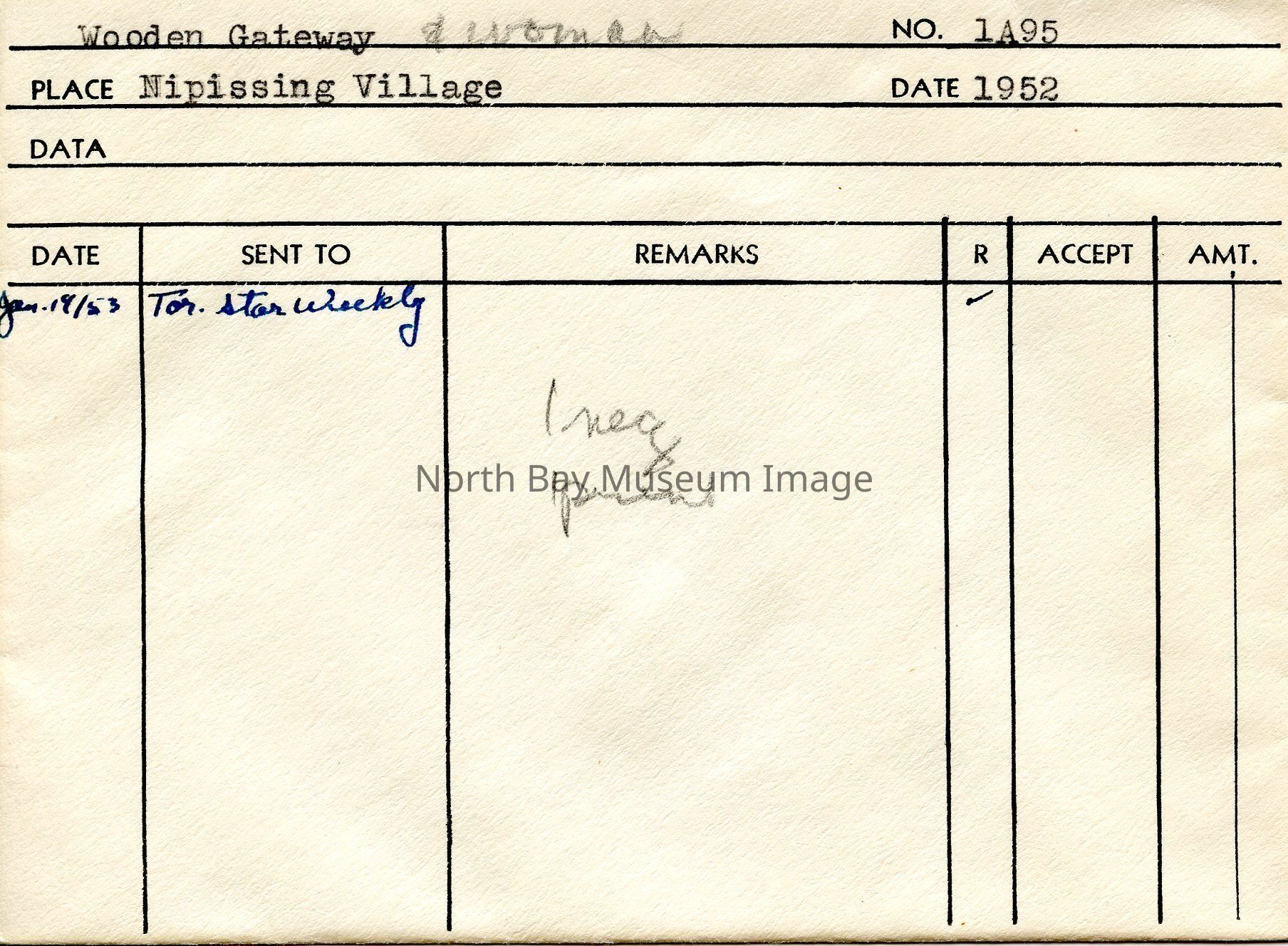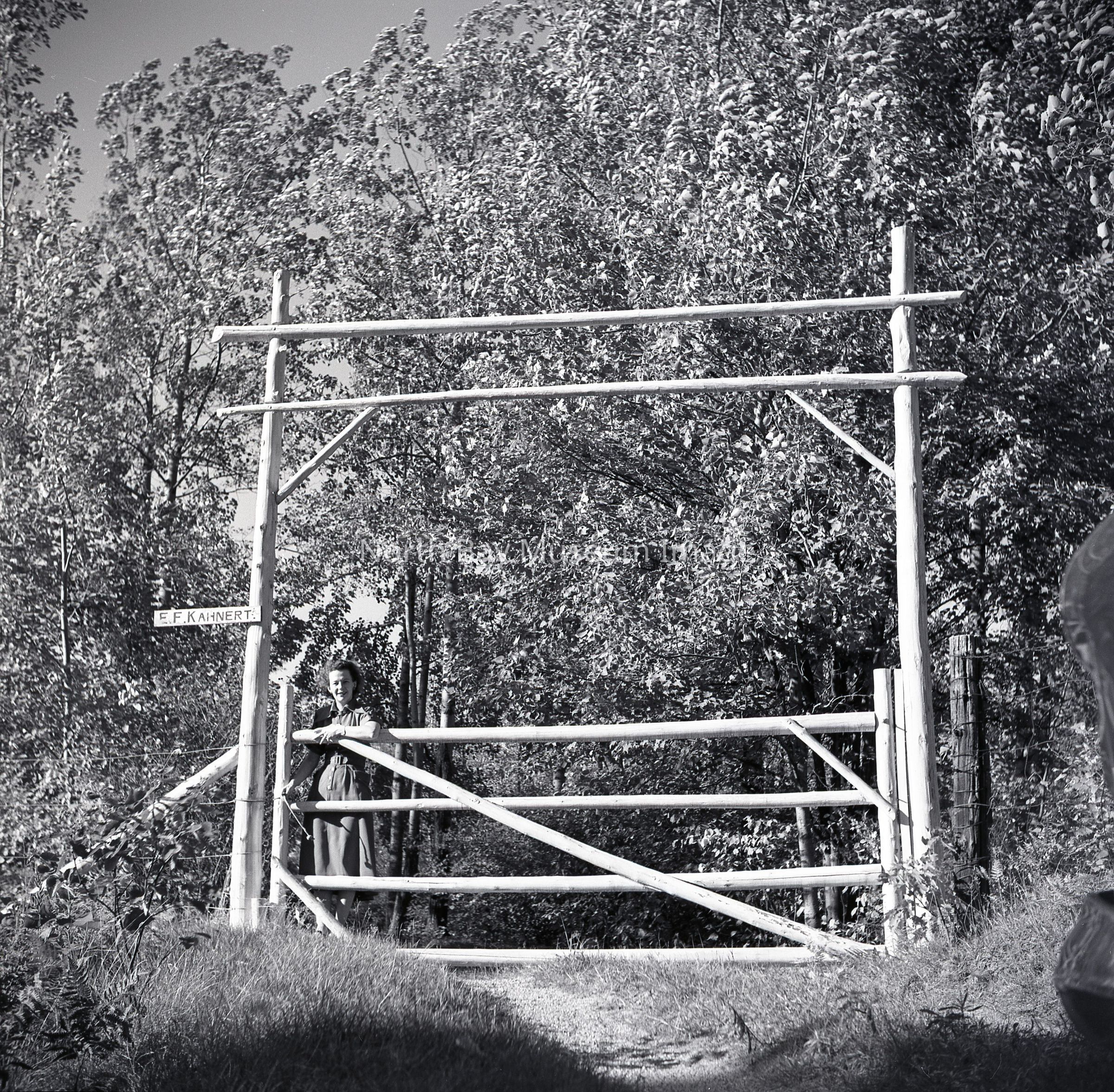 Photographer's Envelope (a) contains photographs and negatives (b-c) of a wooden archway in Nipissing Village. In the photograph, it captures a woman standing behind the archway. She appears to be happy. Publications of the photo are listed on the back of the envelope.This image is a part of the Forder Collection.Creator