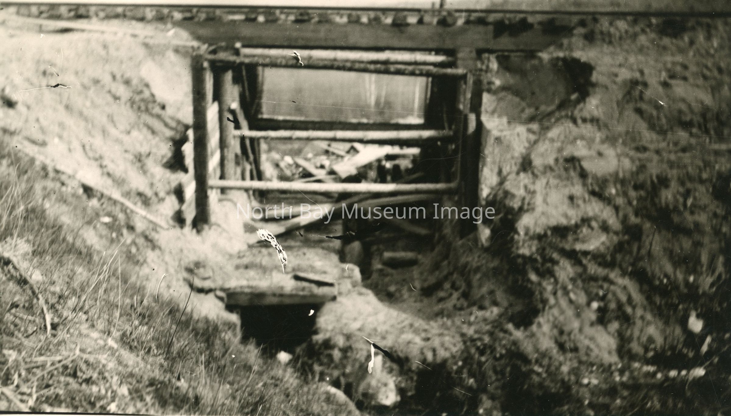 Print, Photographic - black and white photograph - shows a wooden structure tunnelling through a rockbed, over a creek and under rail track