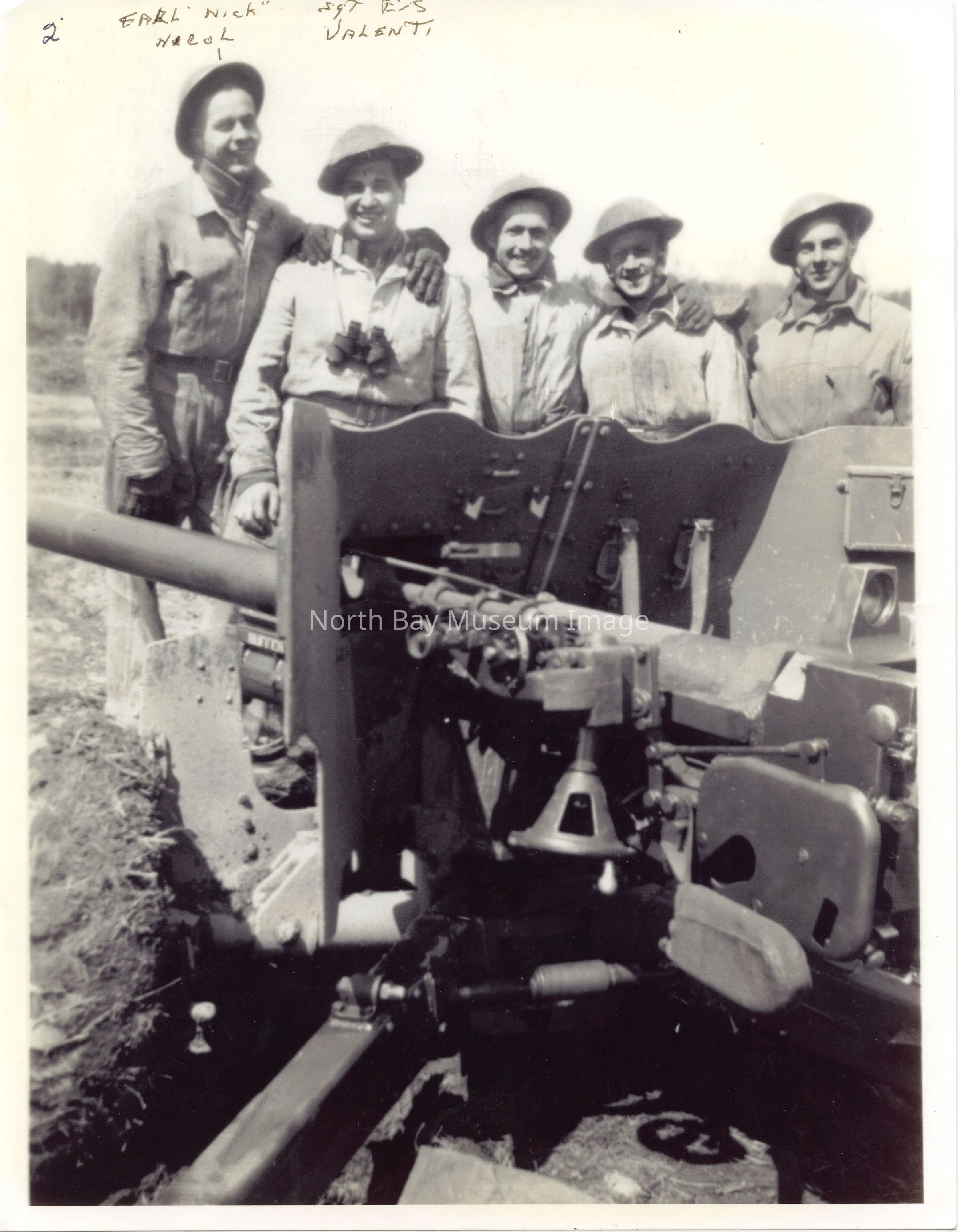 021.31.06a - Photograph. Soldiers and artillery gun. Inscription: "2. Earl 'Nick' Nicol", "Sgt E/S Valenti".