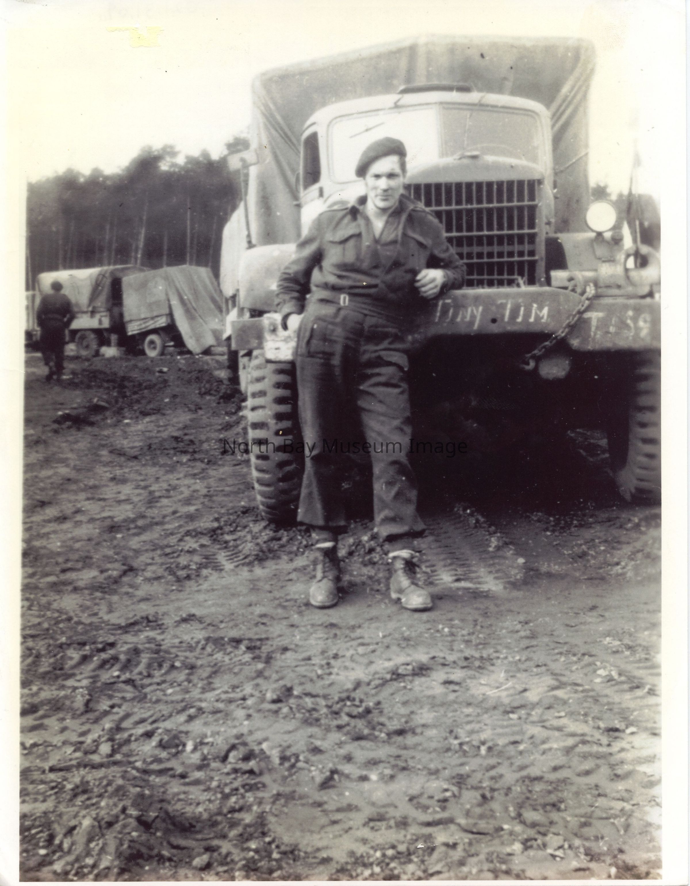 021.31.09a - Sticky note. "D.C. 'Tiny' Edwards formerly with Anti Tank Platoon Transfered to R. C.A 2nd ... Dec 43. This picture is in front of Diamond T wrecker Edward drove in Germany April 1945."