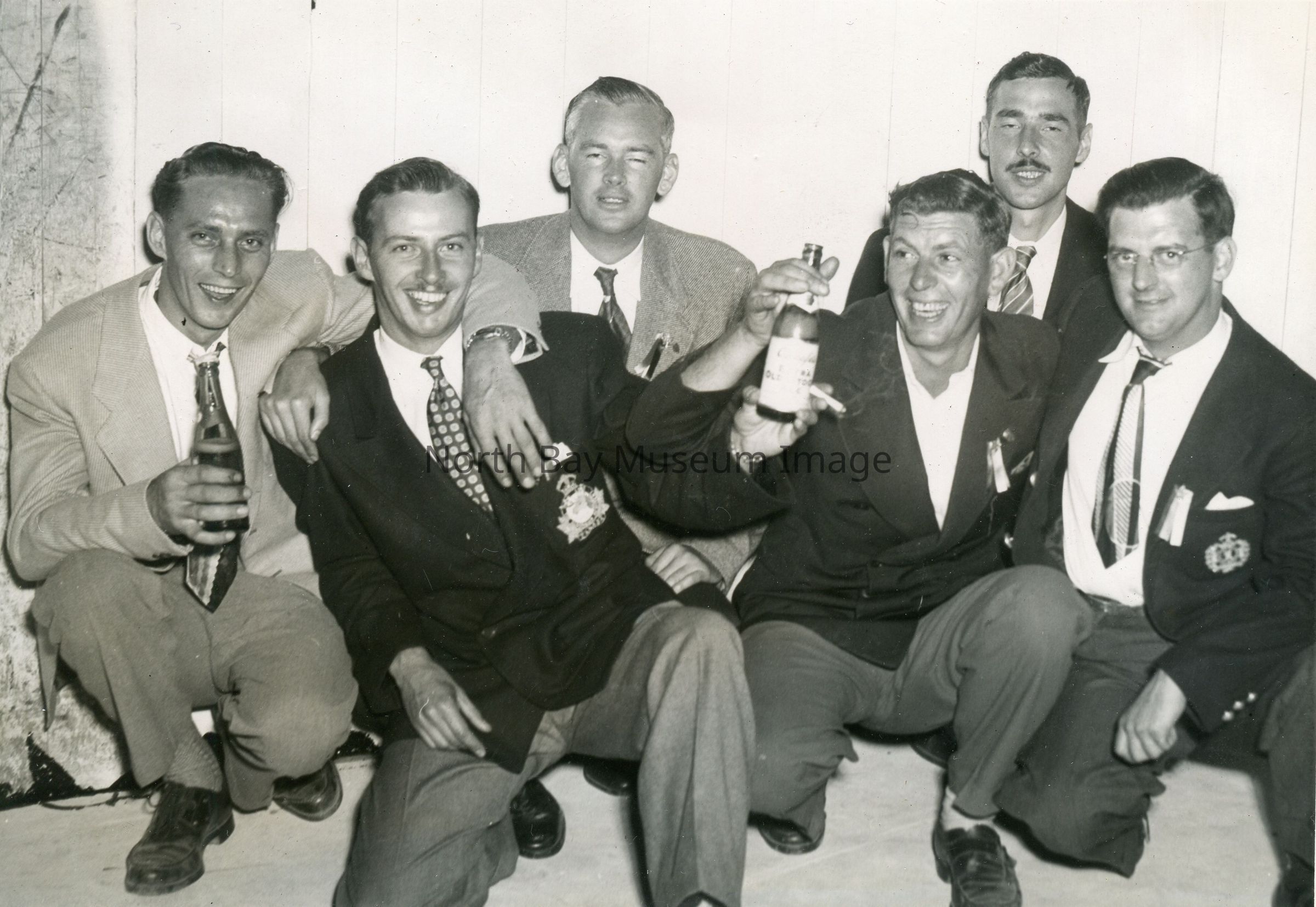 021.31.11 - Silver, ornate card with white ribbon. Features picture of young men celebrating, posing for picture. Inscription: "A Len Bland Photo". According to Bill Alexander, museum volunteer and military history consultant, "a group of veterans at a reunion. (speculation)."Date(s) of Creation