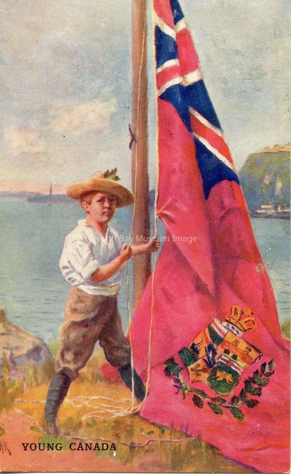This postcard has a young boy in long rubber boots, brown pants, white shirt and straw hat with a maple leaf in it is standing beside a flag pole with his hands on the rope, ready to hoist the Canadian Ensign.The background shows a bay of water and a cloudy sky. At the bottom left hand corner are the words "YOUNG CANADA."