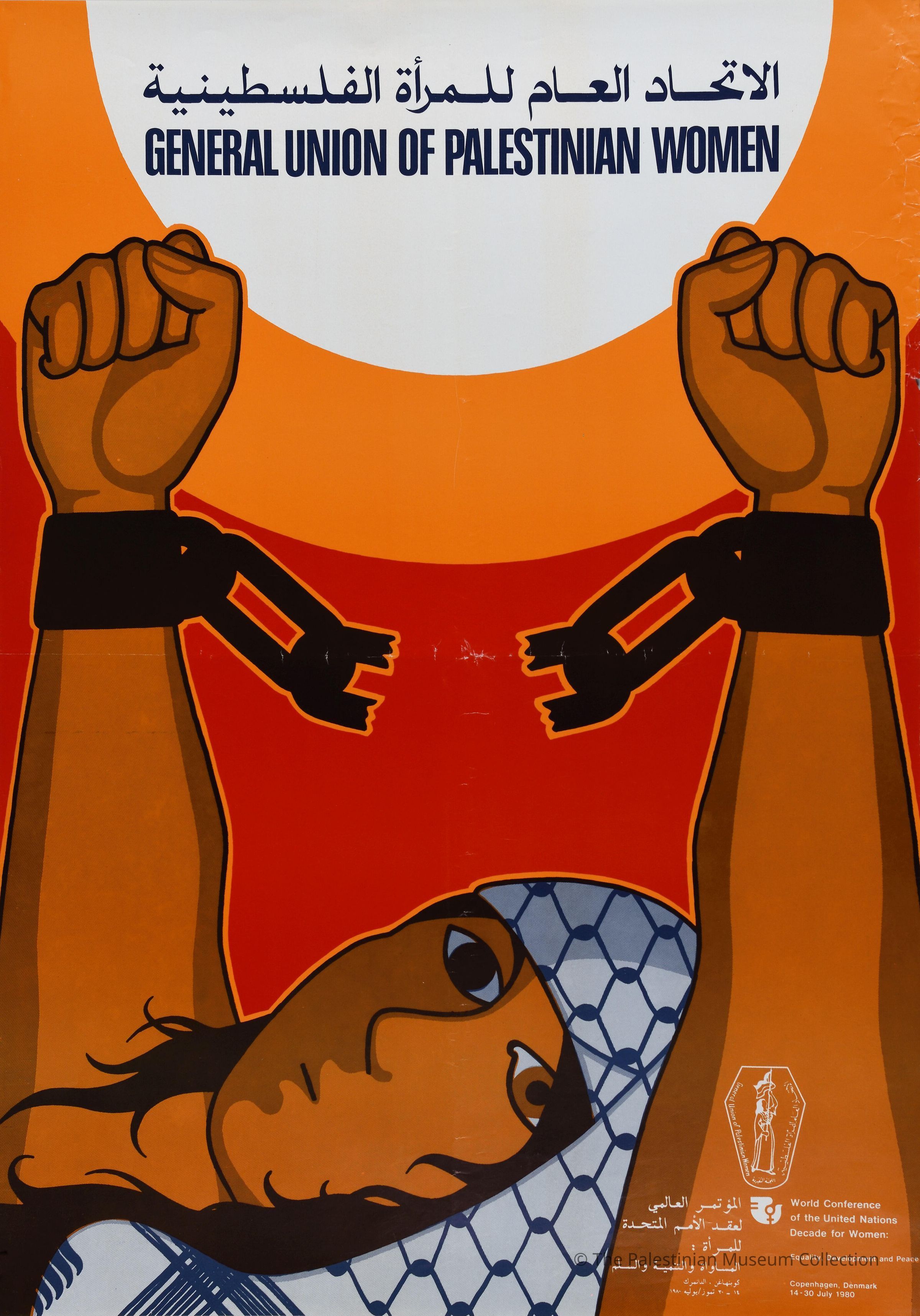 ملصق ملون، يظهر فيه امرأة ترتدي الحطة الفلسطينية على رأسها، ترفع يديها عالياً وقد كسرت قيدهما