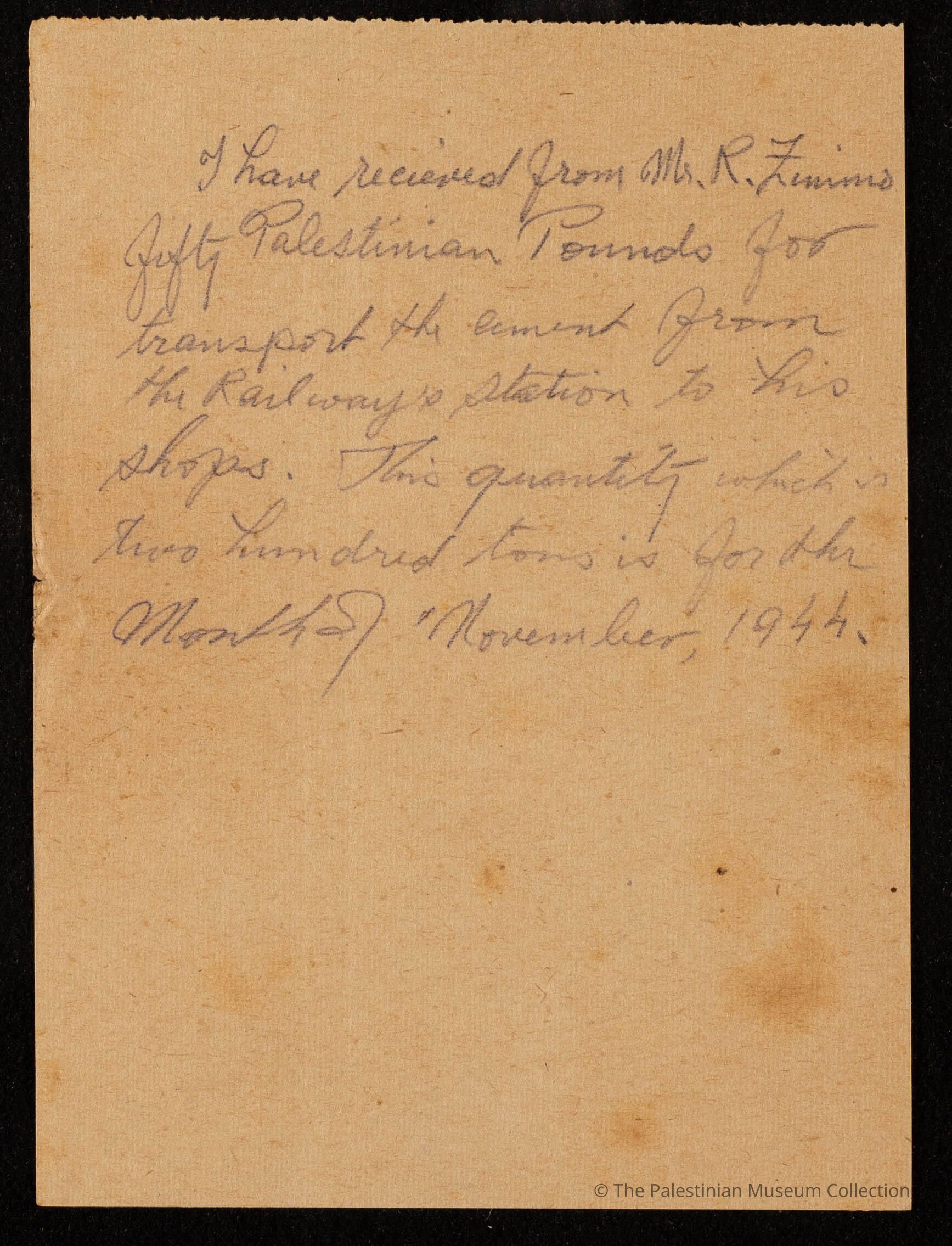 وثيقة وصل تتعلق بنقل الإسمنت من محطة السكة الحديد، وقد كُتبت باللغة الانجليزية.